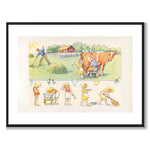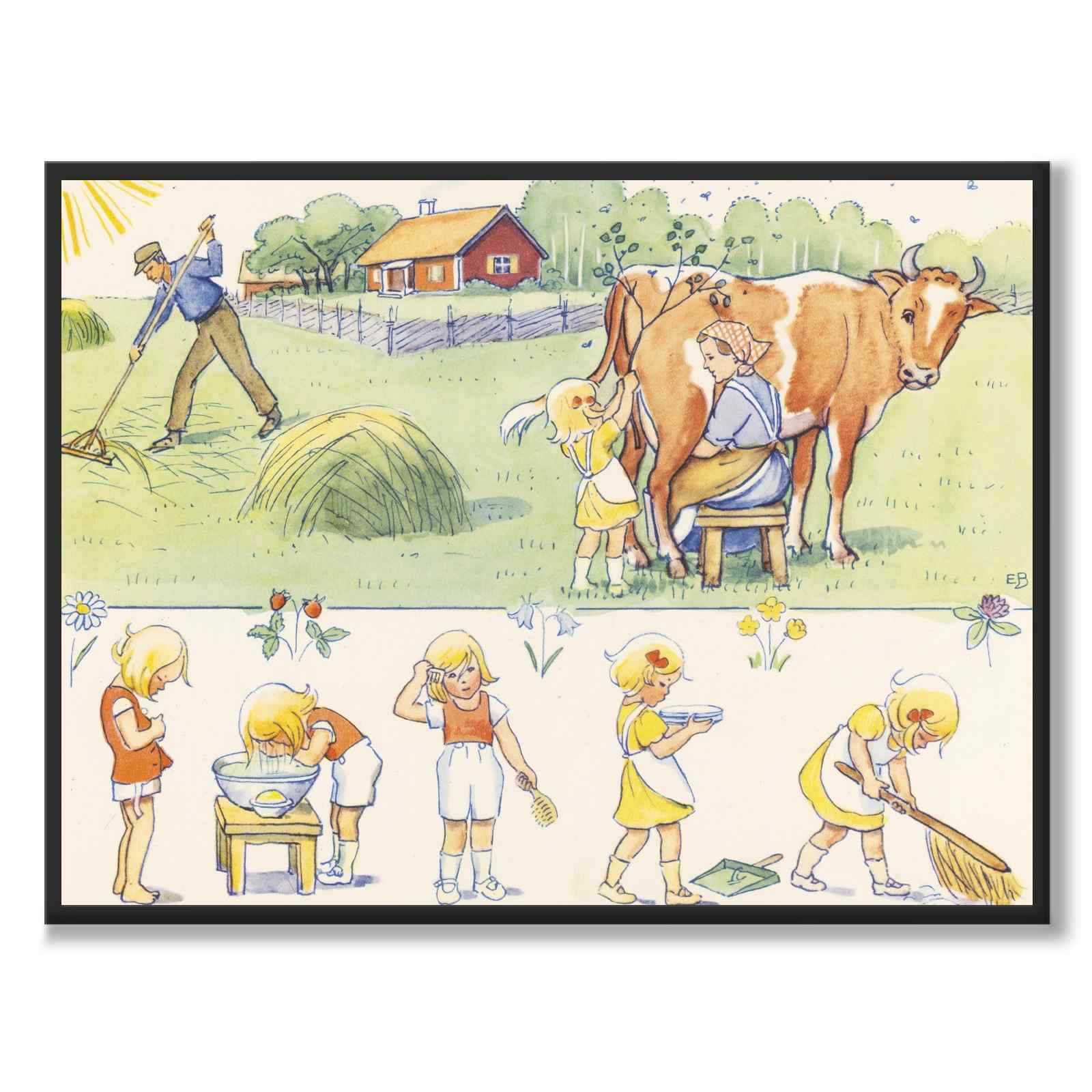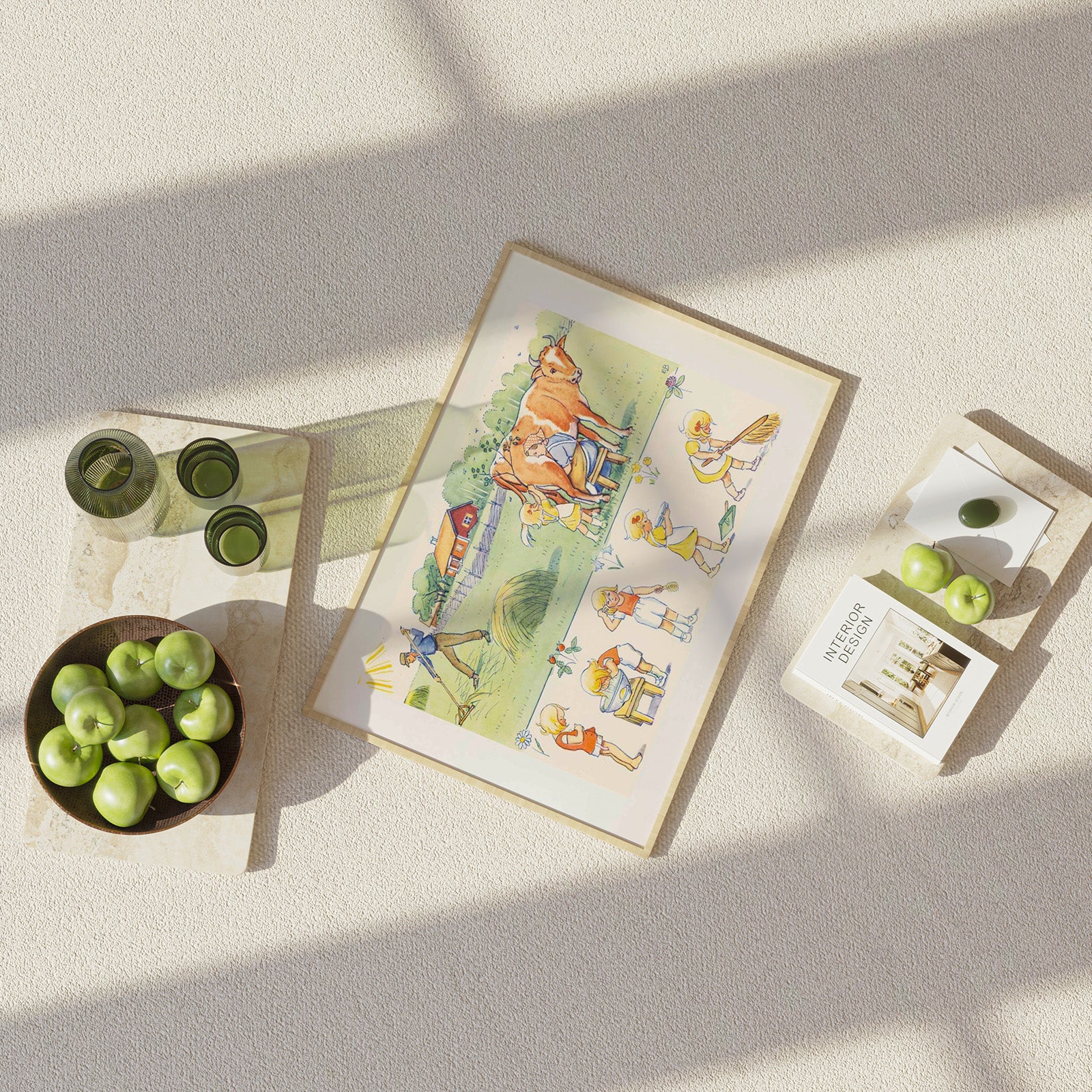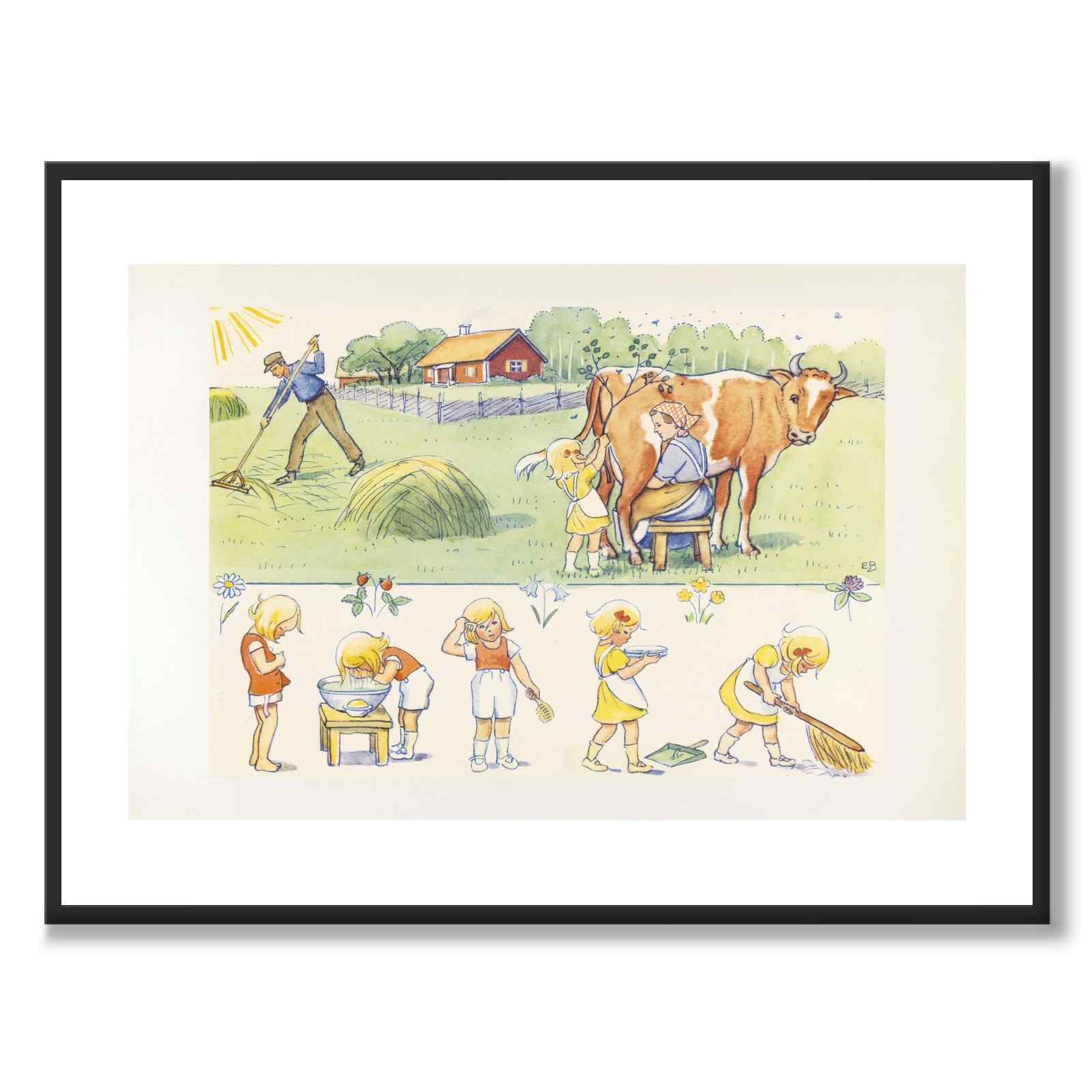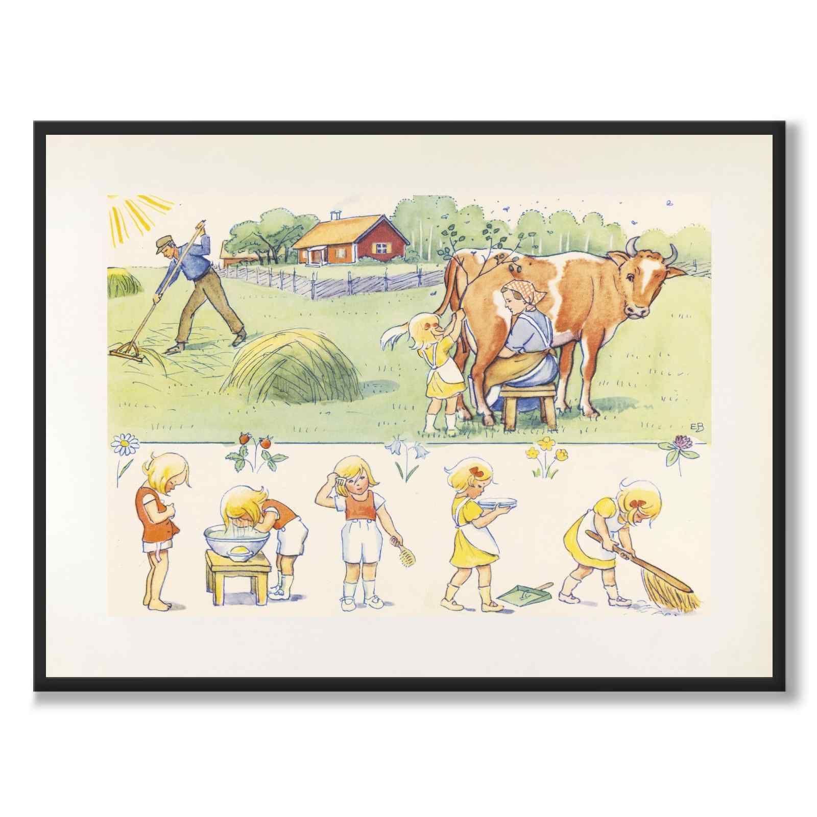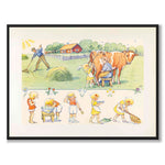 Plakat med illustrasjon fra Elsa Beskows bildebok «Duktiga Annika» som ble utgitt i 1941. Boken handler om Annika, en snill og talentfull jente som hjelper til med å passe kua Majros.