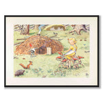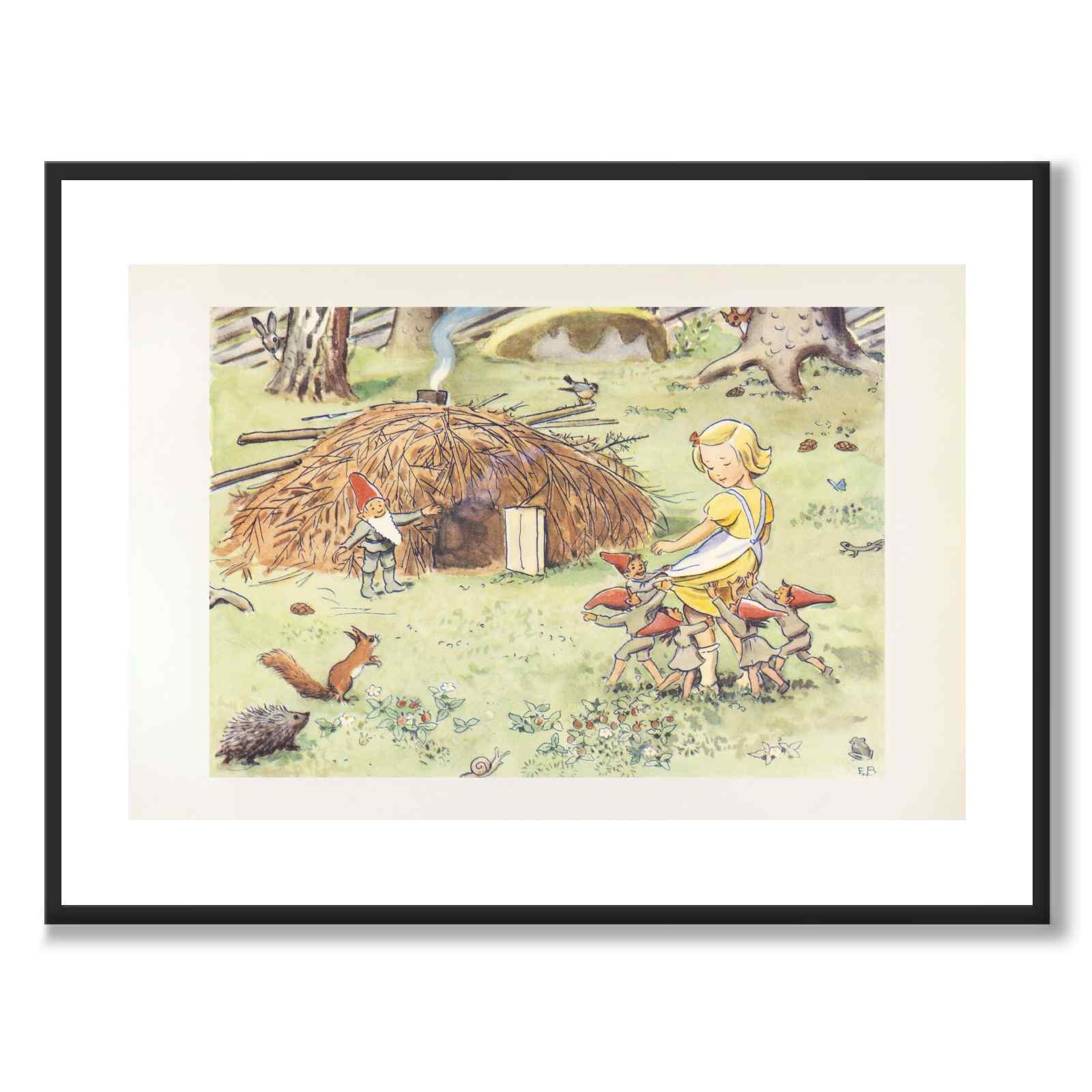 I denne illustrasjonen ser vi Annika i skogen der hun har møtt små alver. Noen alver drar og drar i Annikas gule kjole, mens en annen alv står litt lenger unna og ser ut til å ønske Annika velkommen inn i hjemmet sitt.