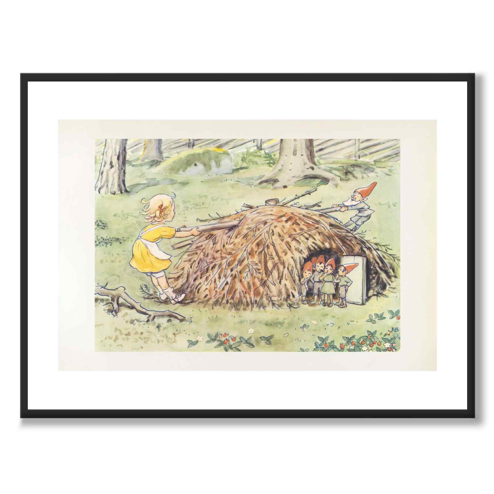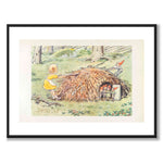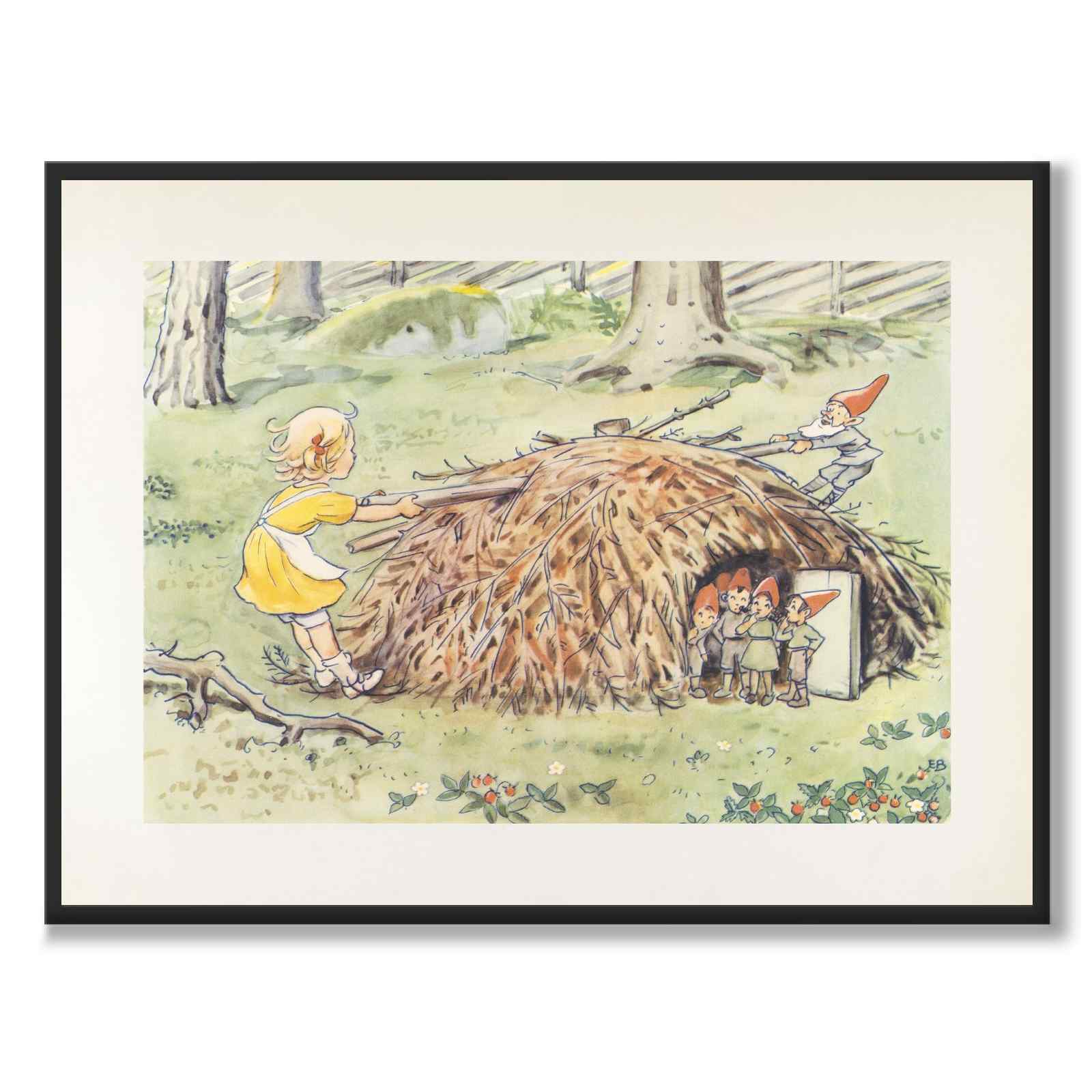 I denne illustrasjonen ser vi Annika tilsynelatende hjelpe alvefamilien med å trekke en stor pinne vekk fra huset sitt. Alvebarna står tankefullt til siden og ser på.