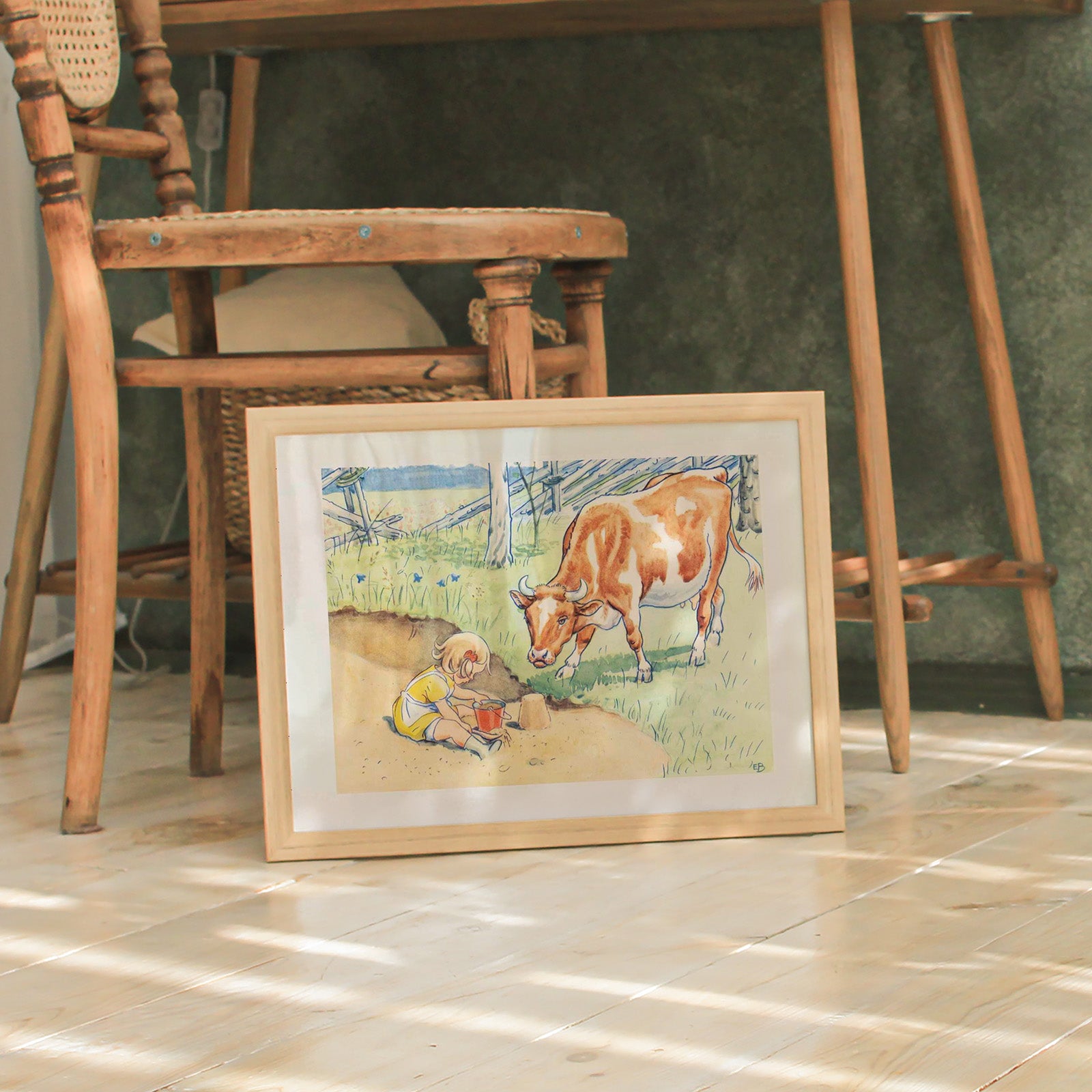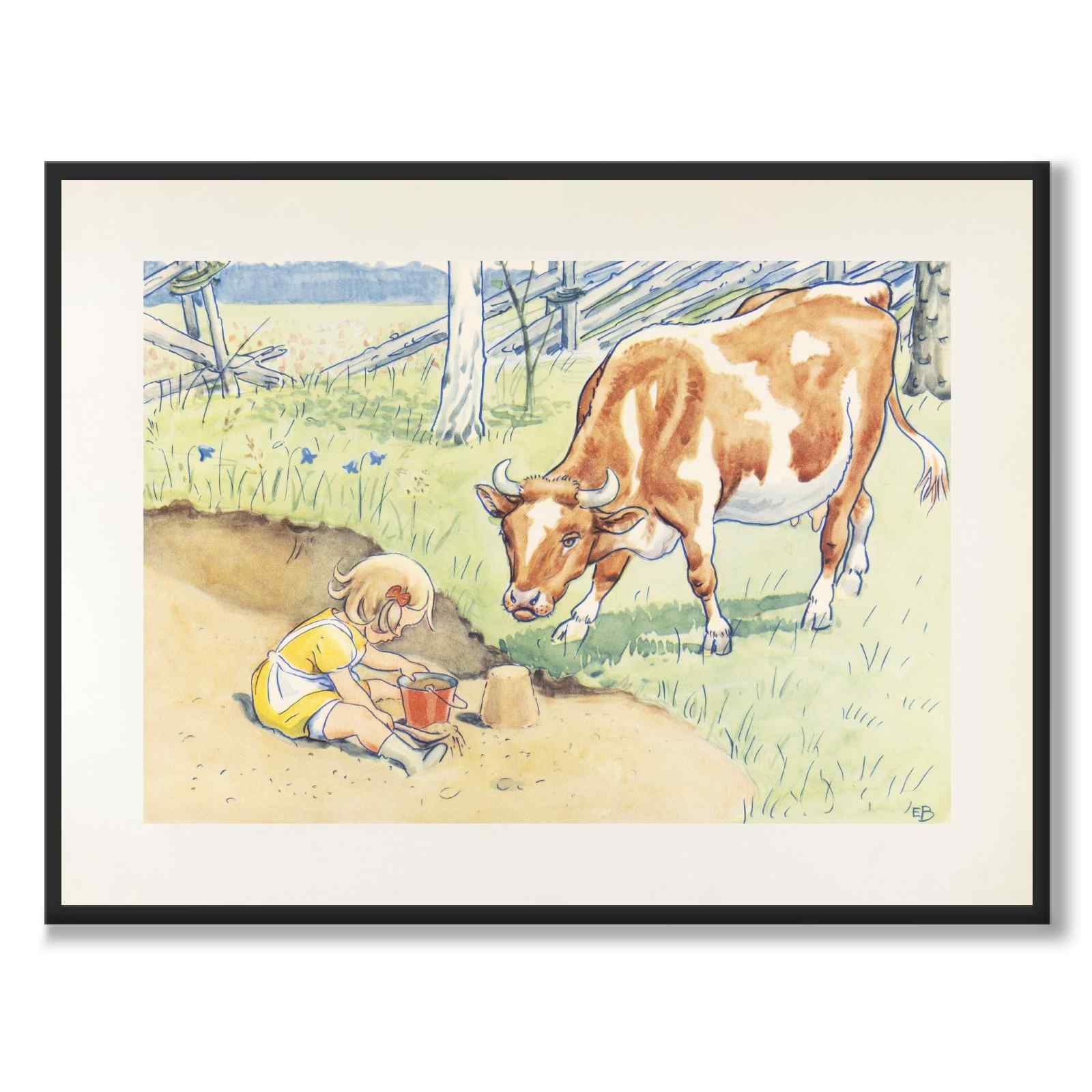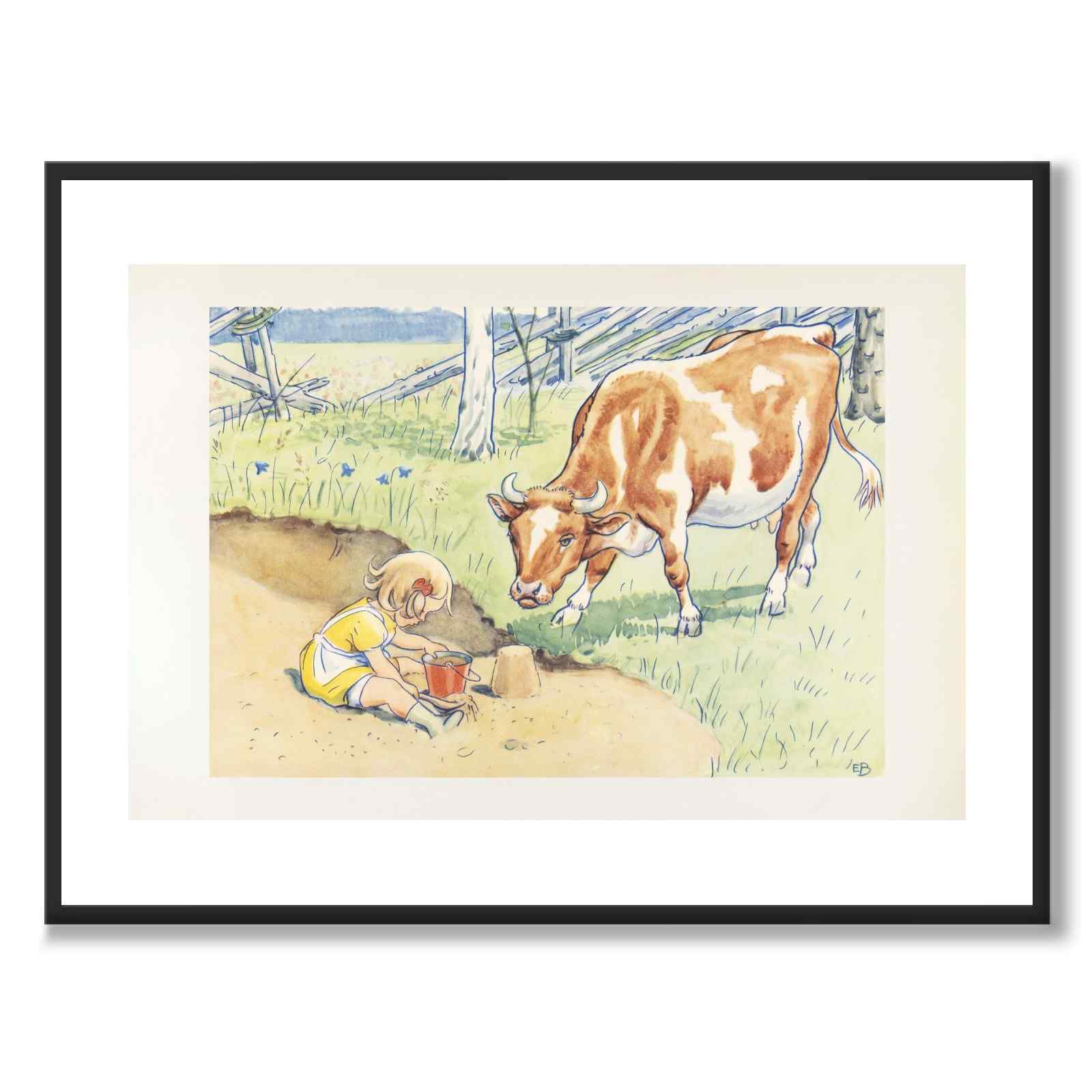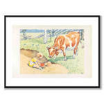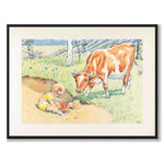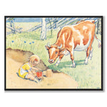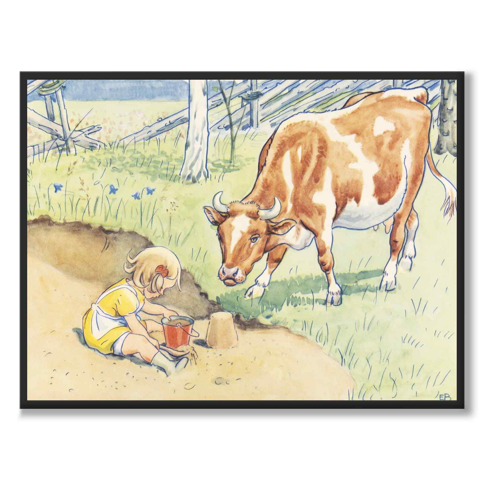 Plakat med illustrasjon fra Elsa Beskows bildebok «Duktiga Annika» som ble utgitt i 1941. Boken handler om Annika, en snill og talentfull jente som hjelper til med å passe kua Majros.