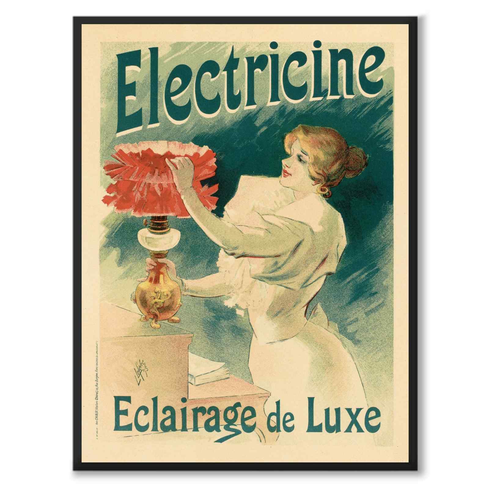 Electricine-plakaten var en del av den økende fascinasjonen for elektrisitet og den nye teknologien som revolusjonerte verden på slutten av 1800-tallet. Bildet viser en kvinne i en hvit kjole som står og undersøker en elektrisk lampe med rød skjerm.