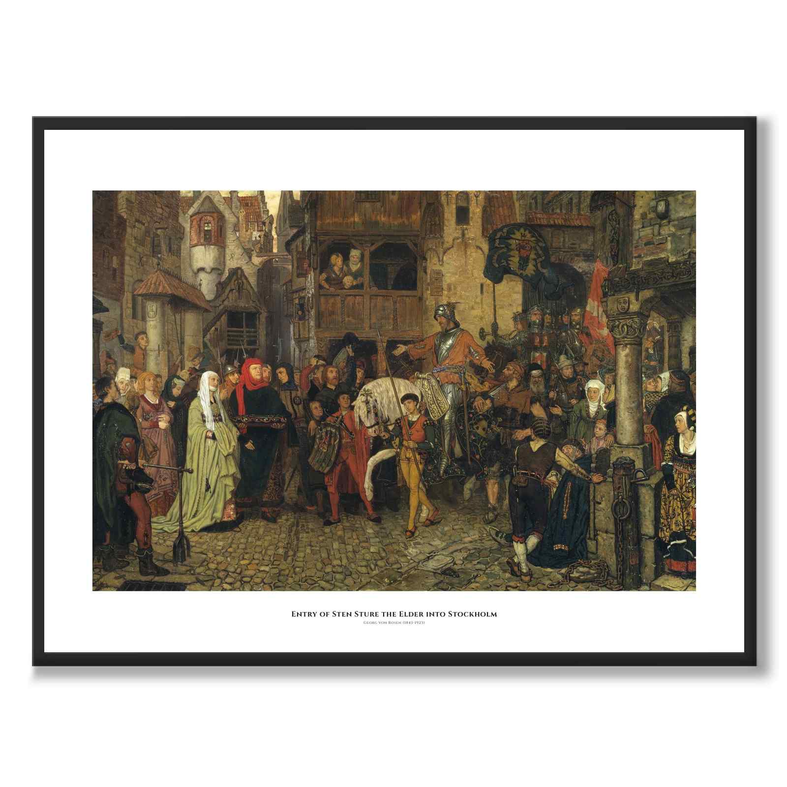 Plakat med maleri av den svenske kunstneren Georg von Rosen fra 1864. Verkets navn er Entry of Sten Sture den eldste i Stockholm og skildrer Sten Sture den eldre - en ridder, hoffmann av Stockholm og regent av Sverige.