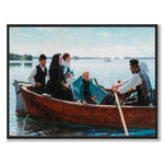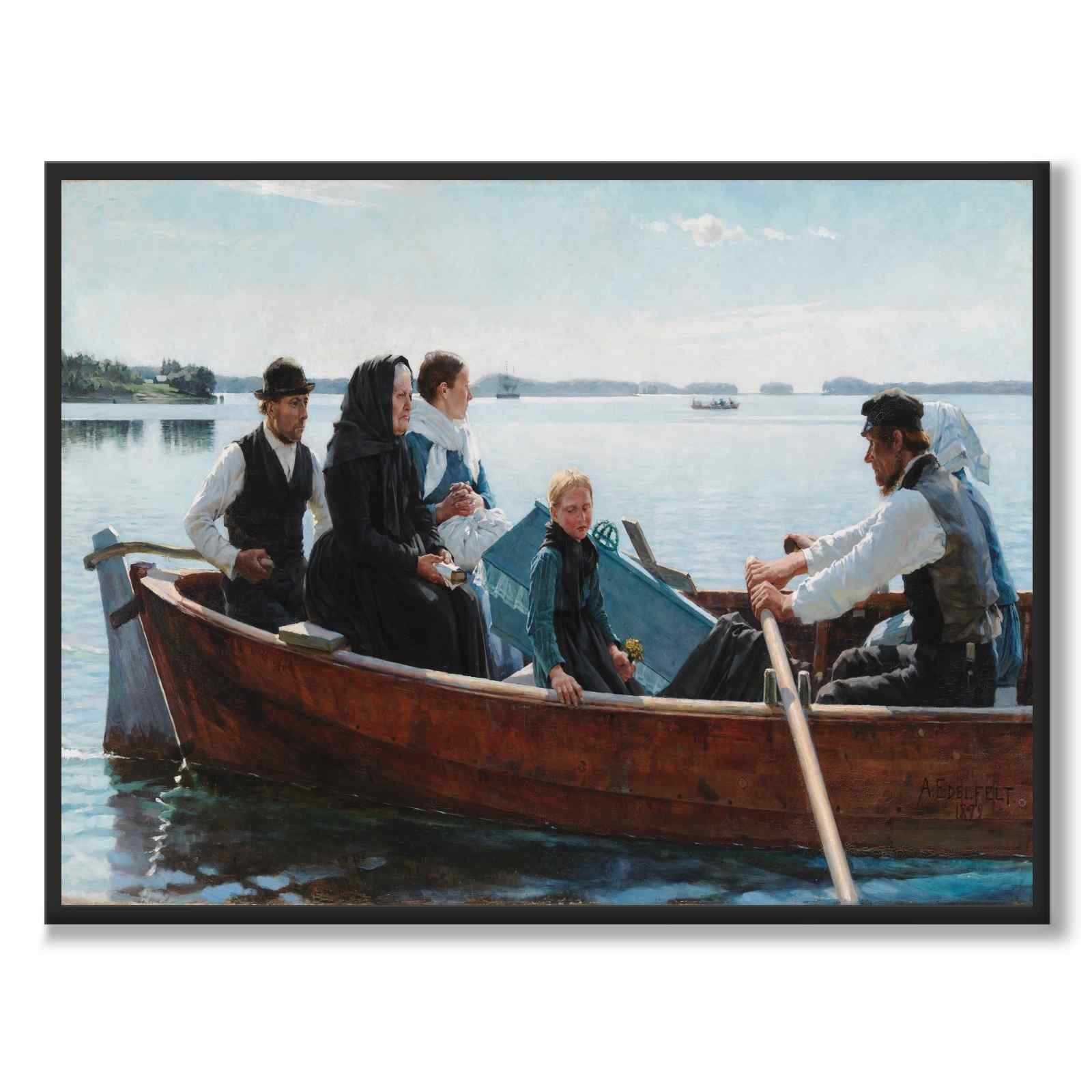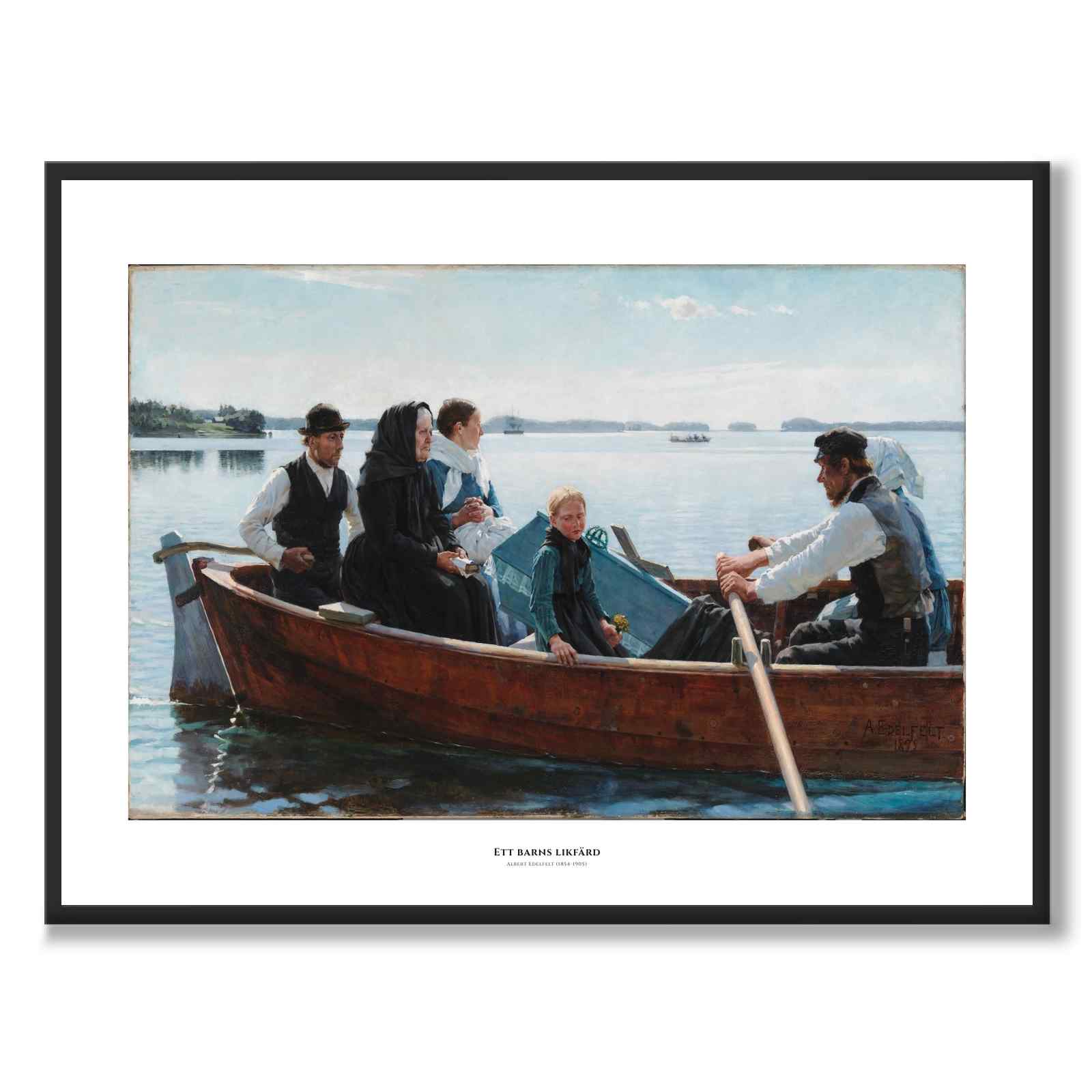 På bildet ser vi en stille og rørende scene der en liten kiste som inneholder et barns kropp bæres til sitt siste hvilested i en robåt. Det er seks personer i båten: tre kvinner, to menn og en jente, alle kledd i formelle klær. De er avbildet på en speilblank innsjø utenfor Haiko, nær Borgå, en solrik sensommermorgen.