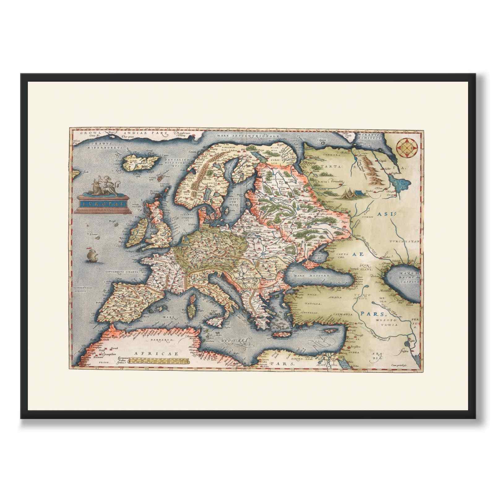 Vintage plakat med et fantastisk kart over Europa i 1574. Kartet er laget av kartografen, geografen og historikeren Abraham Ortelius.