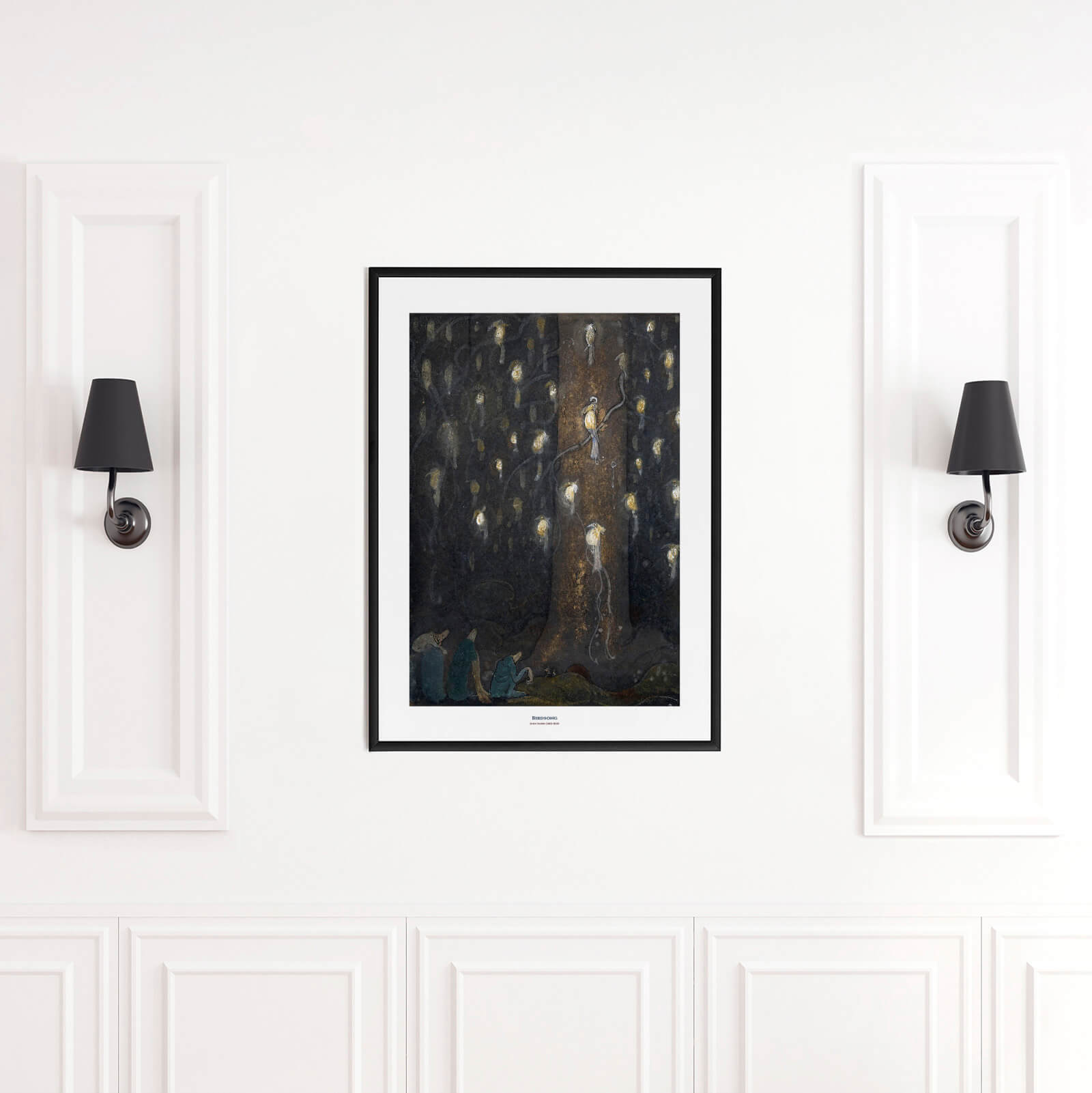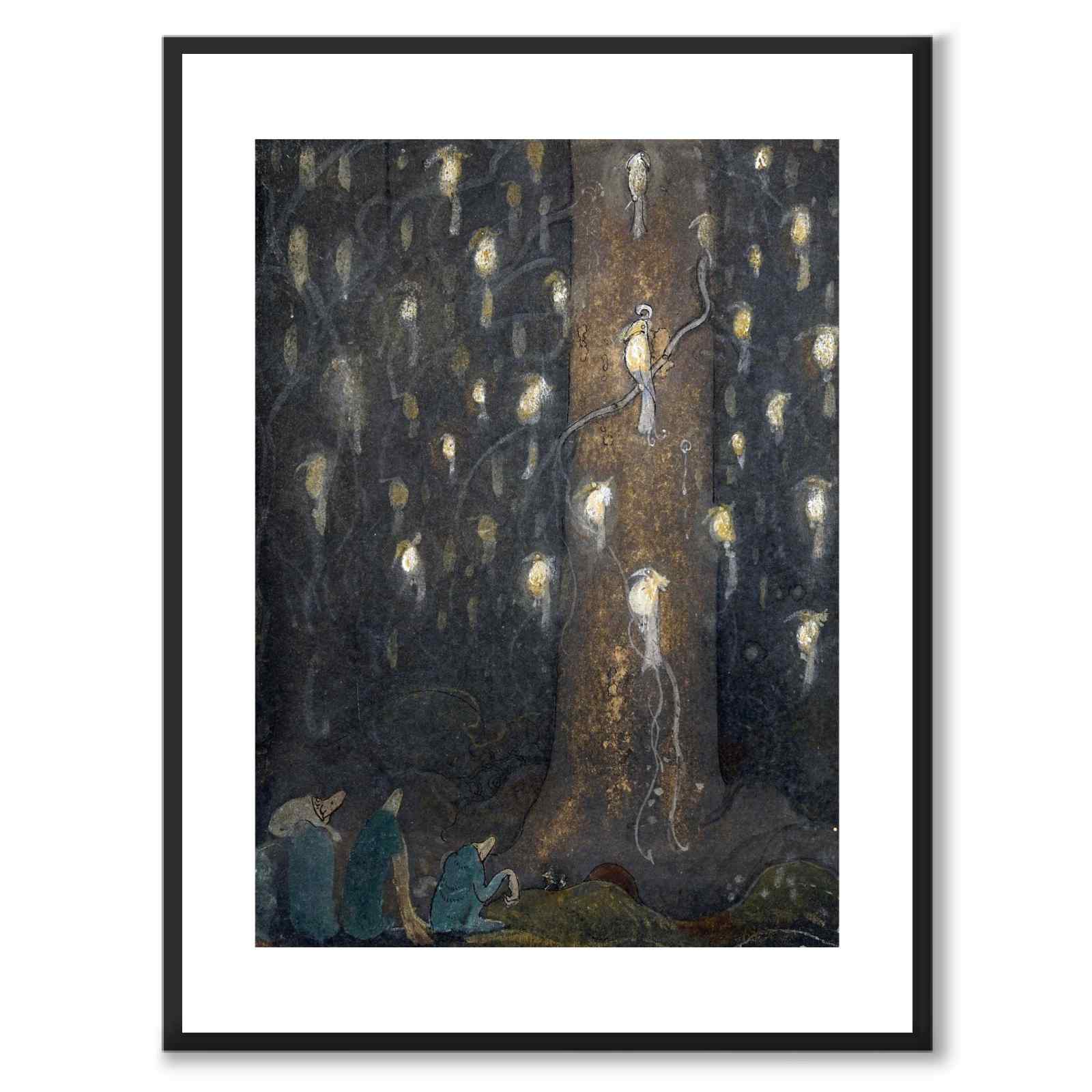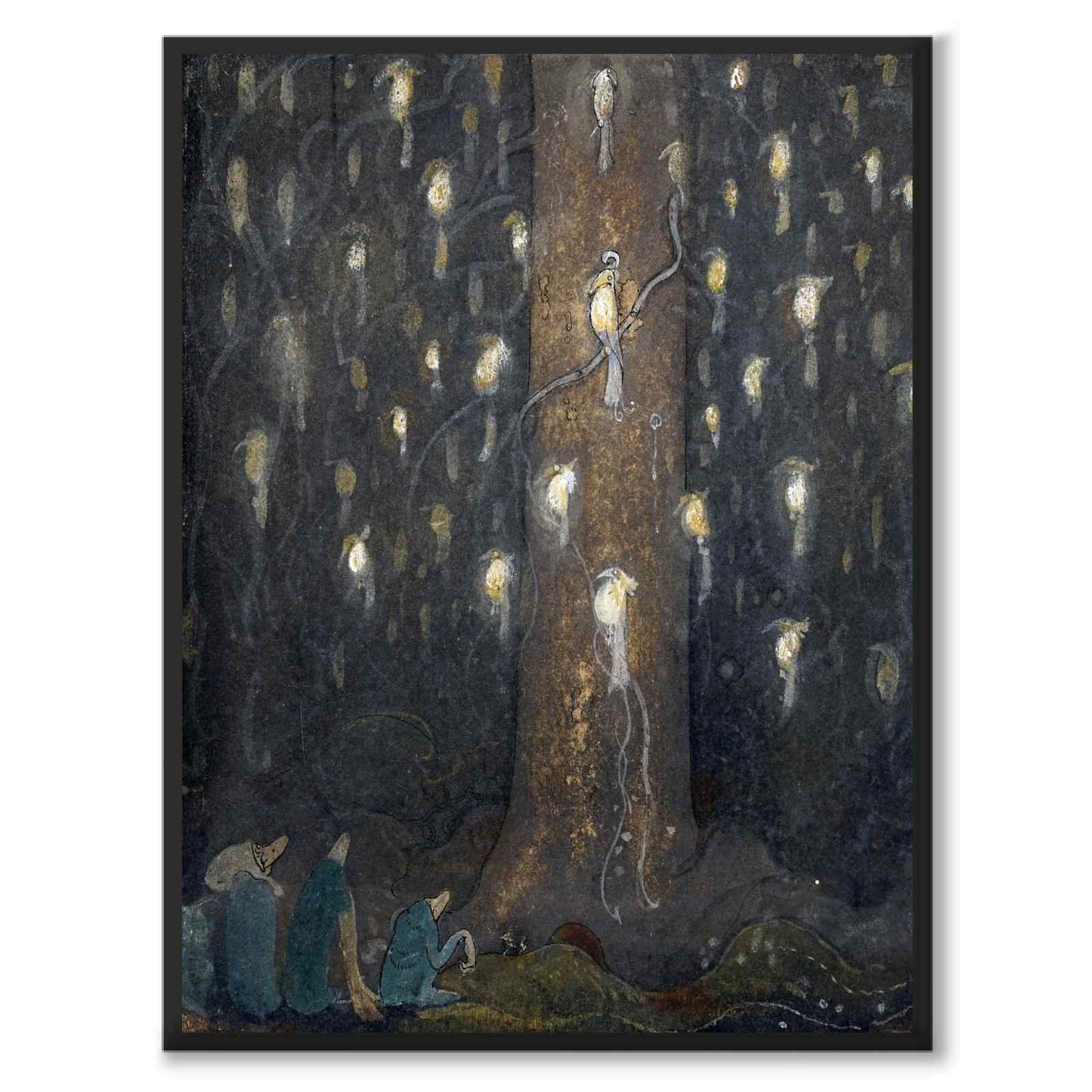 Plakat med maleriet Fuglesang av John Bauer fra 1910. Tre nisser ser forundret på et stort antall magiske fugler som sitter på grenene til et stort gran og lyser opp den mørke skogen. Ikoniske John Bauer er kjent for sine eventyrmotiver med nisser og prinsesser og han har hatt stor innflytelse på nordisk folklore og historiefortelling. Lurer du på å vite mer om troll? Les mer her: Dombergets troll .