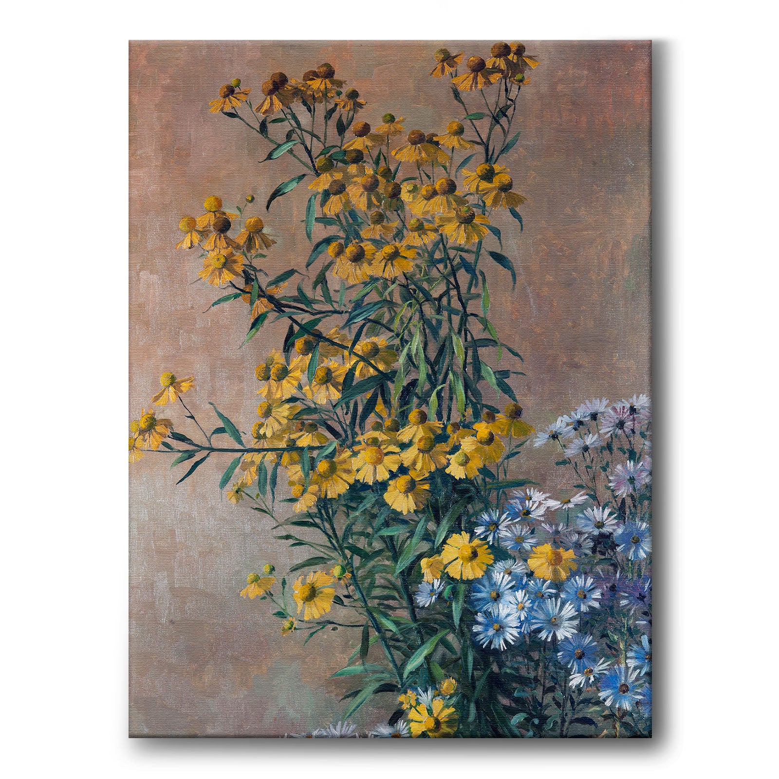Lerret med et vakkert maleri av høstblomster, solbrud og høstløv fra 1910. Verket er malt av den svenske kunstneren Gunnar G. Wennerberg (1863-1914). Wennerberg var svært dyktig og berømt for sine blomstermotiver.