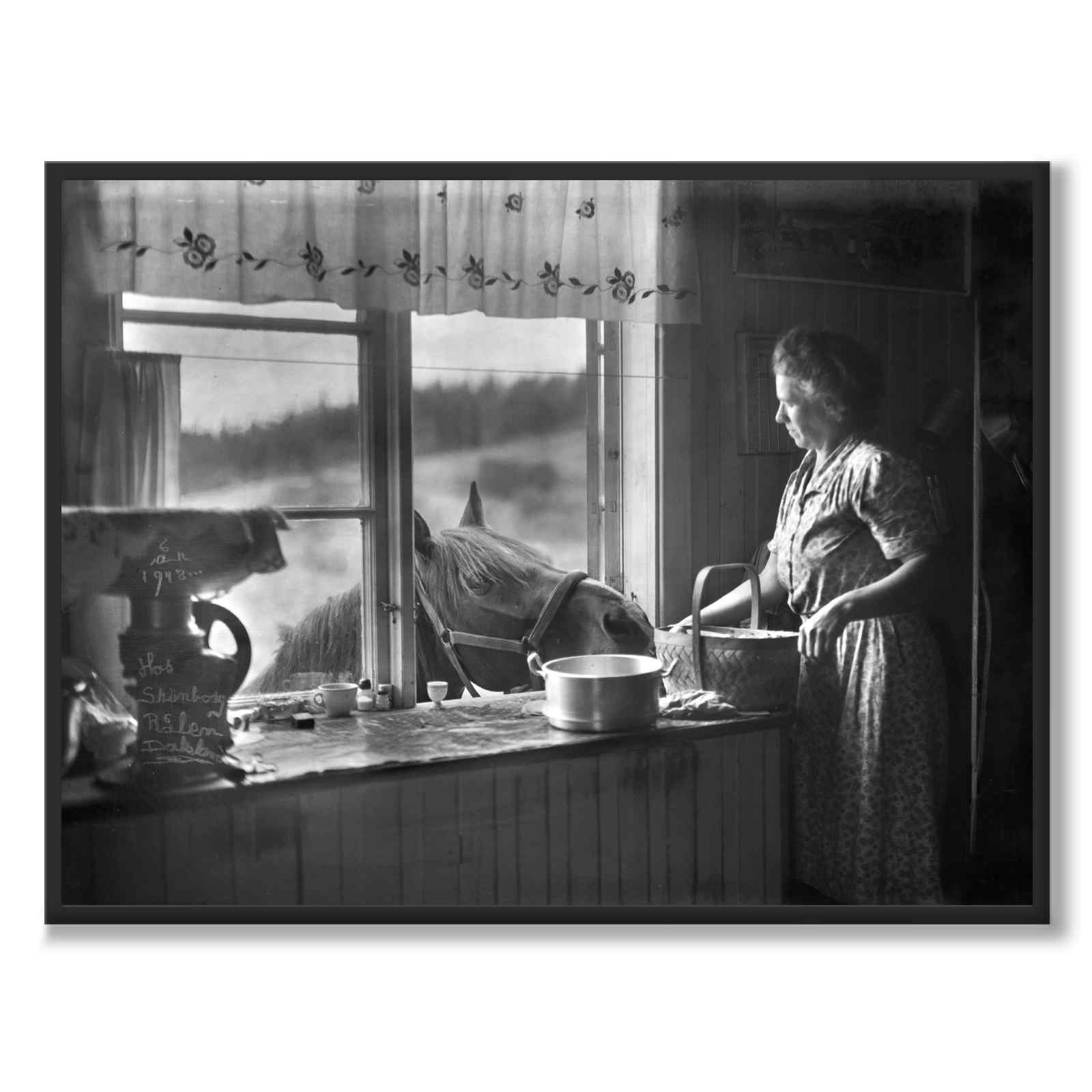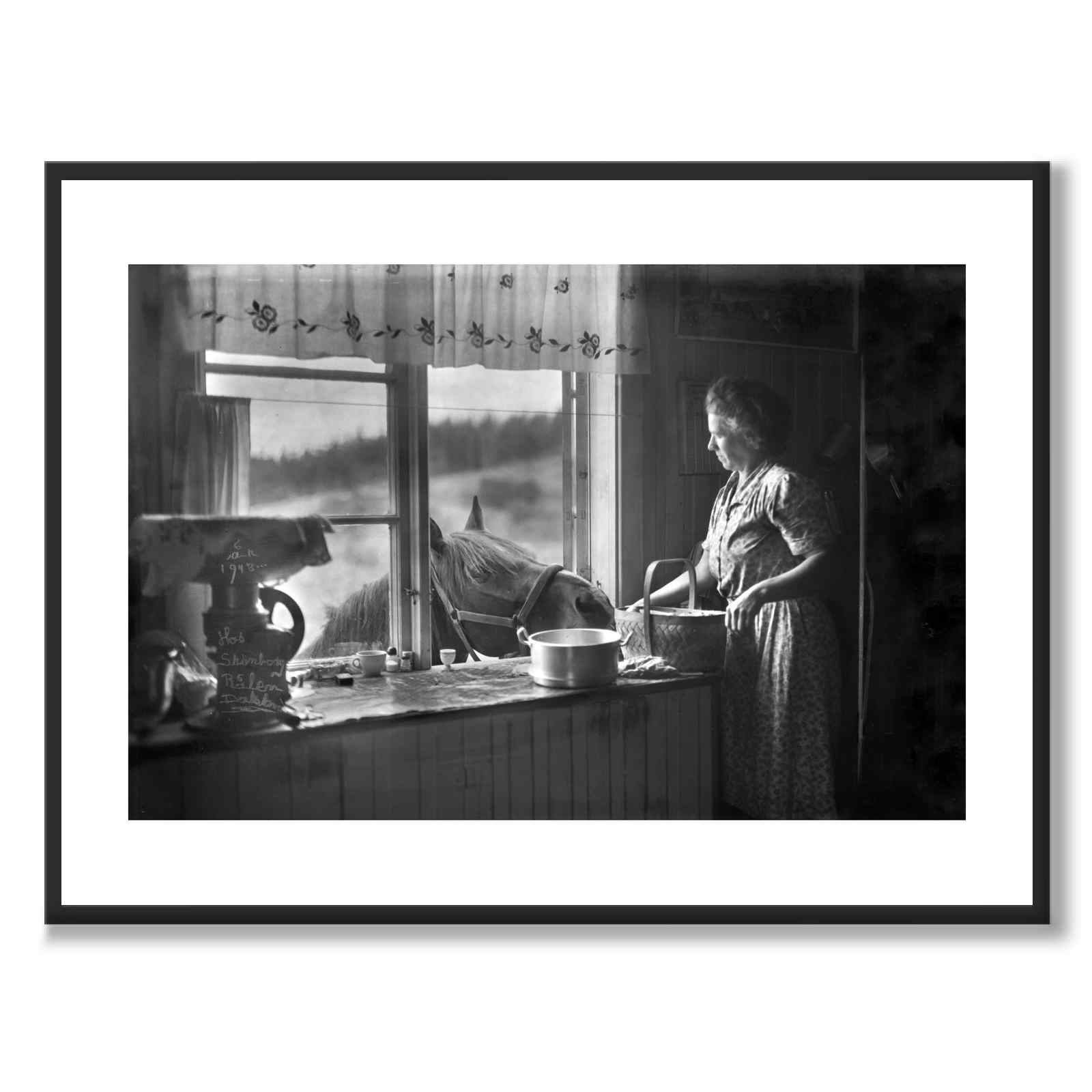 Plakat med et fantastisk fotografi fra 1948. Bildet er av Gerda Thörn som mater en hest med epler gjennom kjøkkenvinduet. På venstre bildekant kan du skimte teksten: " Hos Schönborg, Rålen, Dalsland, 1948".