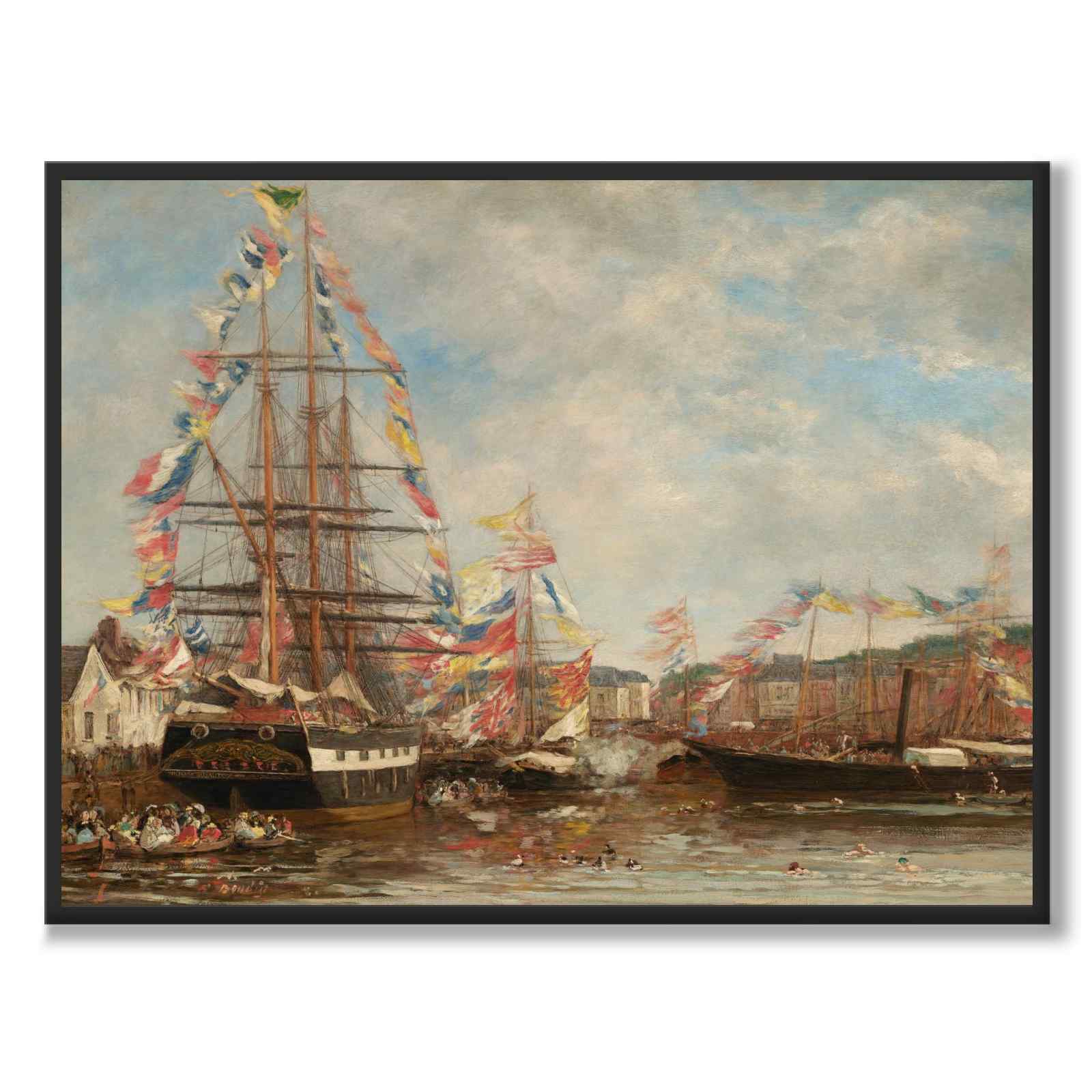 Plakat med maleriet Festival i havnen i Honfleur fra år 1858. Maleriet er laget av den franske kunstneren Eugène Boudin.
