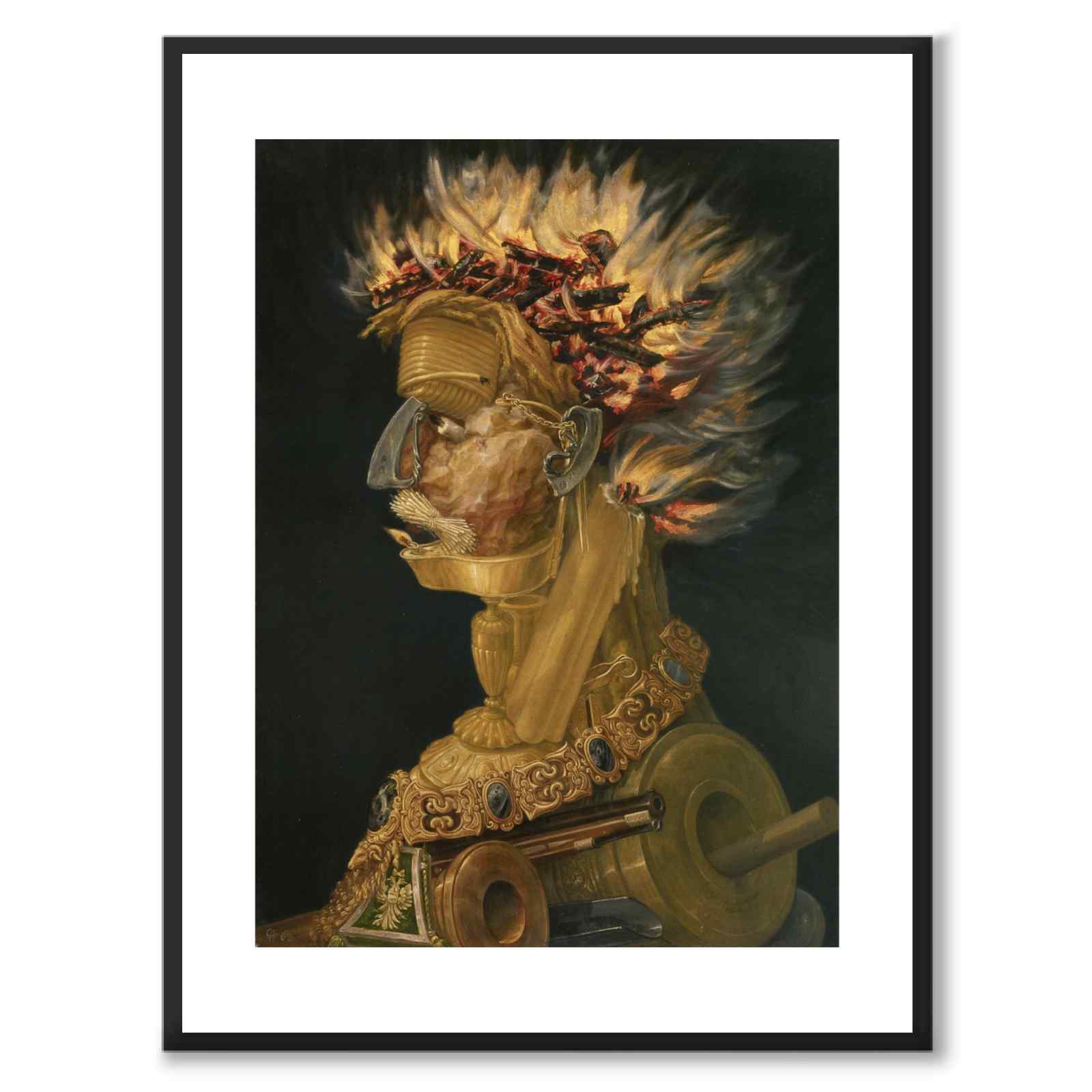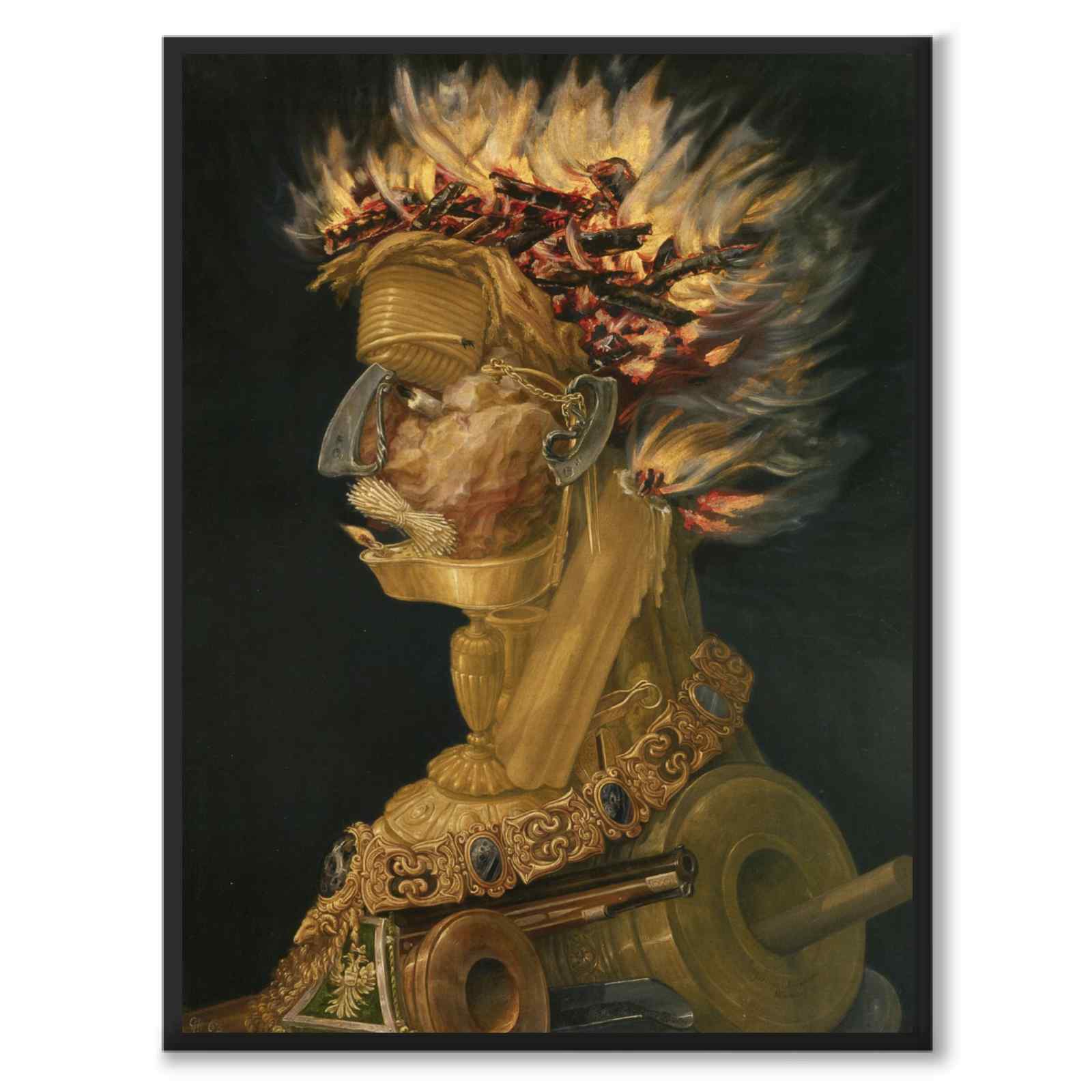 Plakat med maleriet «Ild» av den italienske renessansemaleren Giuseppe Arcimboldo (1527–1593), som er kjent for sine fantasifulle portretter der han bruker gjenstander som frukt, blomster og bøker for å gjenskape ansikter.