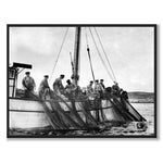 Båten er en klassisk trebåt med mast, som var vanlig på den tiden, og fiskerne er kledd i typiske arbeidsklær. Arbeidet deres speiler kystfisket, der tradisjonelle båter ble brukt til å fange fisk med store garn.