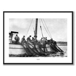 Plakat med fotografi av en gruppe fiskere om bord i en fiskebåt i 1939.