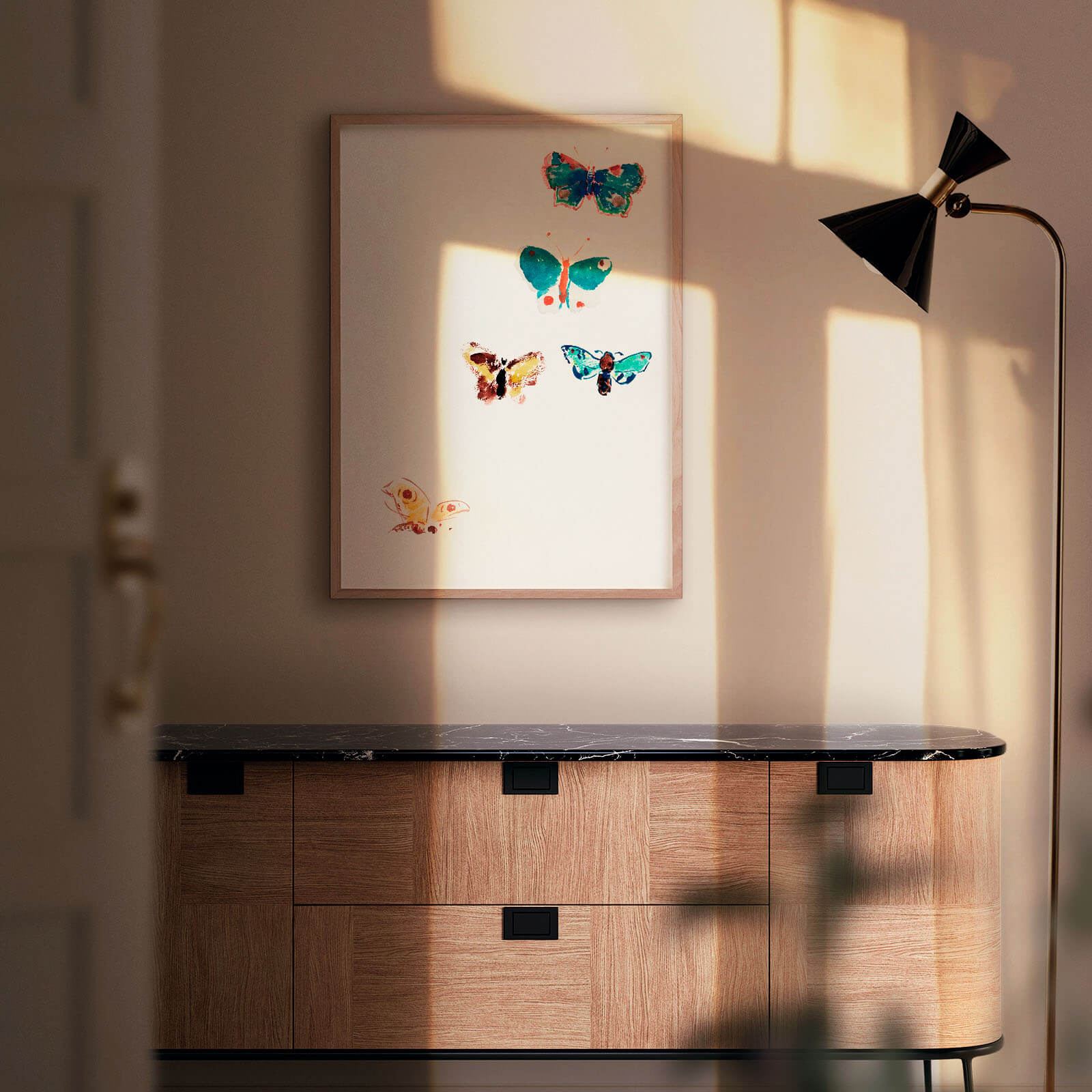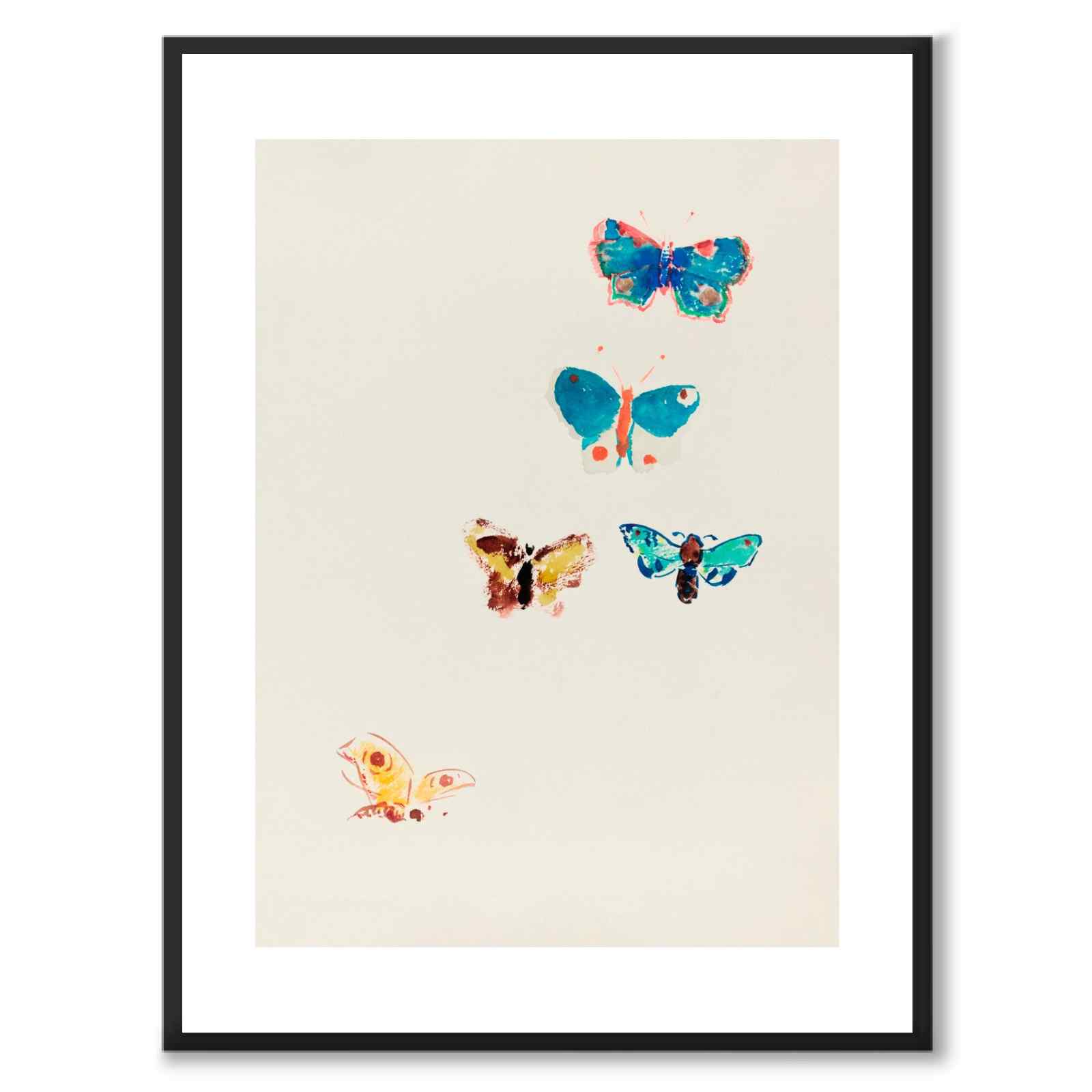 Plakat med maleriet Fem sommerfugler av den franske kunstneren Odilon Redon fra 1912. Motivet viser fem fargerike sommerfugler mot en naturlig farget bakgrunn.