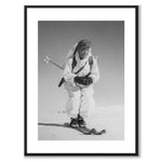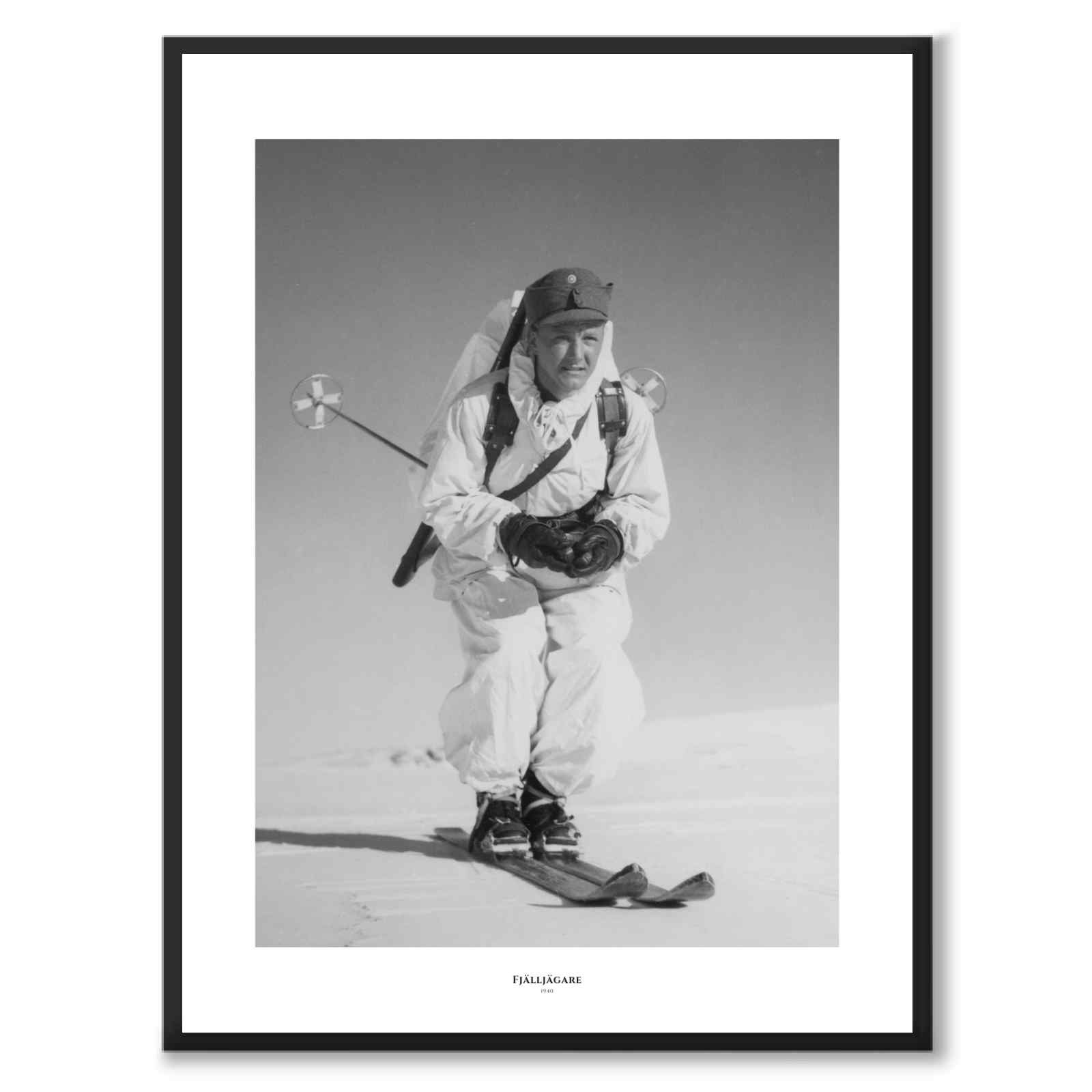 Plakat med fotografi tatt under andre verdenskrig i 1940. På bildet ser vi en svensk soldat på ski i et vinterlandskap. Soldaten har på seg en snødrakt og er bevæpnet.