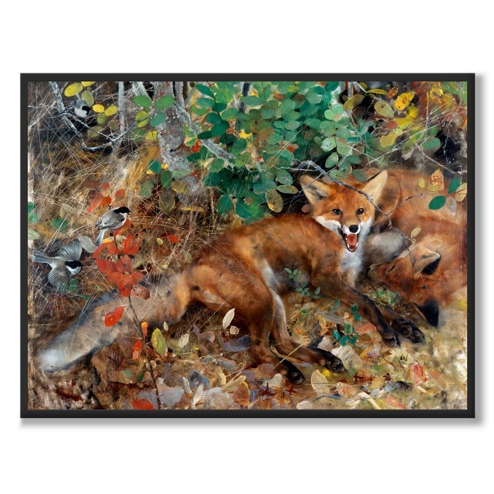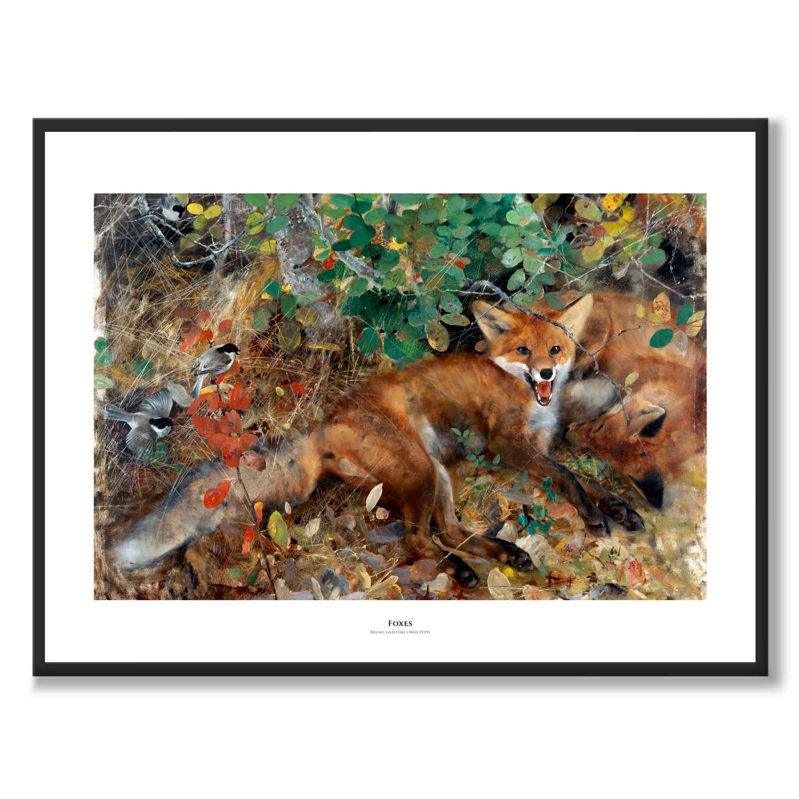 Plakat med maleriet Rever av Bruno Liljefors fra 1886. Maleriet skildrer småfugler og to rever i et vakkert skogslandskap.