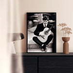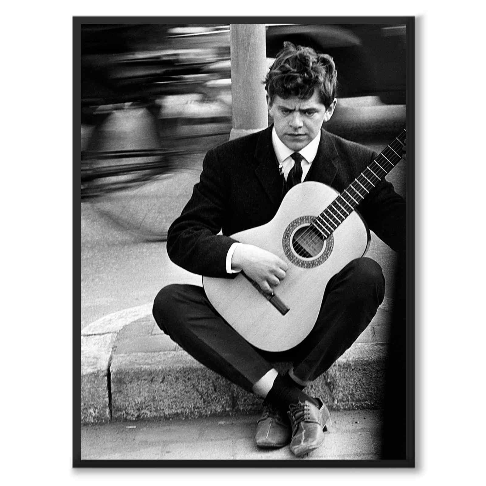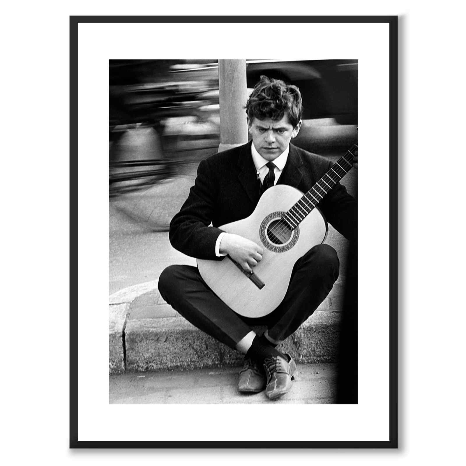 Plakat med et bilde fra 1965 av den kjente trubaduren Fred Åkerström ( 1937-1985) sittende på en fortauskant med gitaren i hånden.