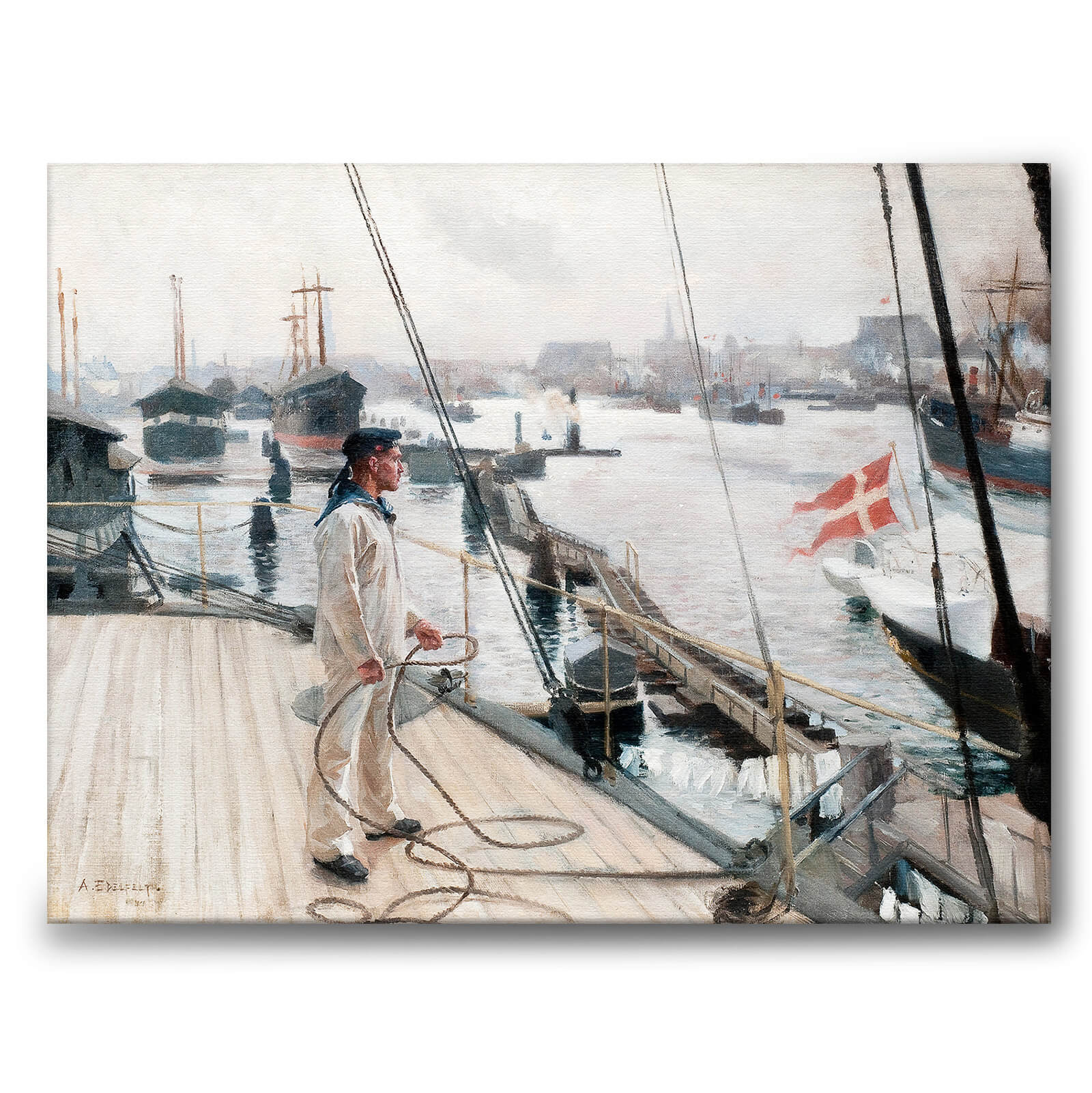 Lerret med det vakre maleriet Fra Københavns havn I av Albert Edelfelt fra 1890-tallet. På bildet ser vi en mann som skal legge til kai ved havnen i København. I bakgrunnen ser vi det danske flagget.