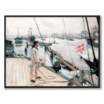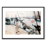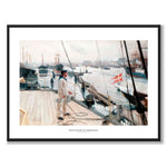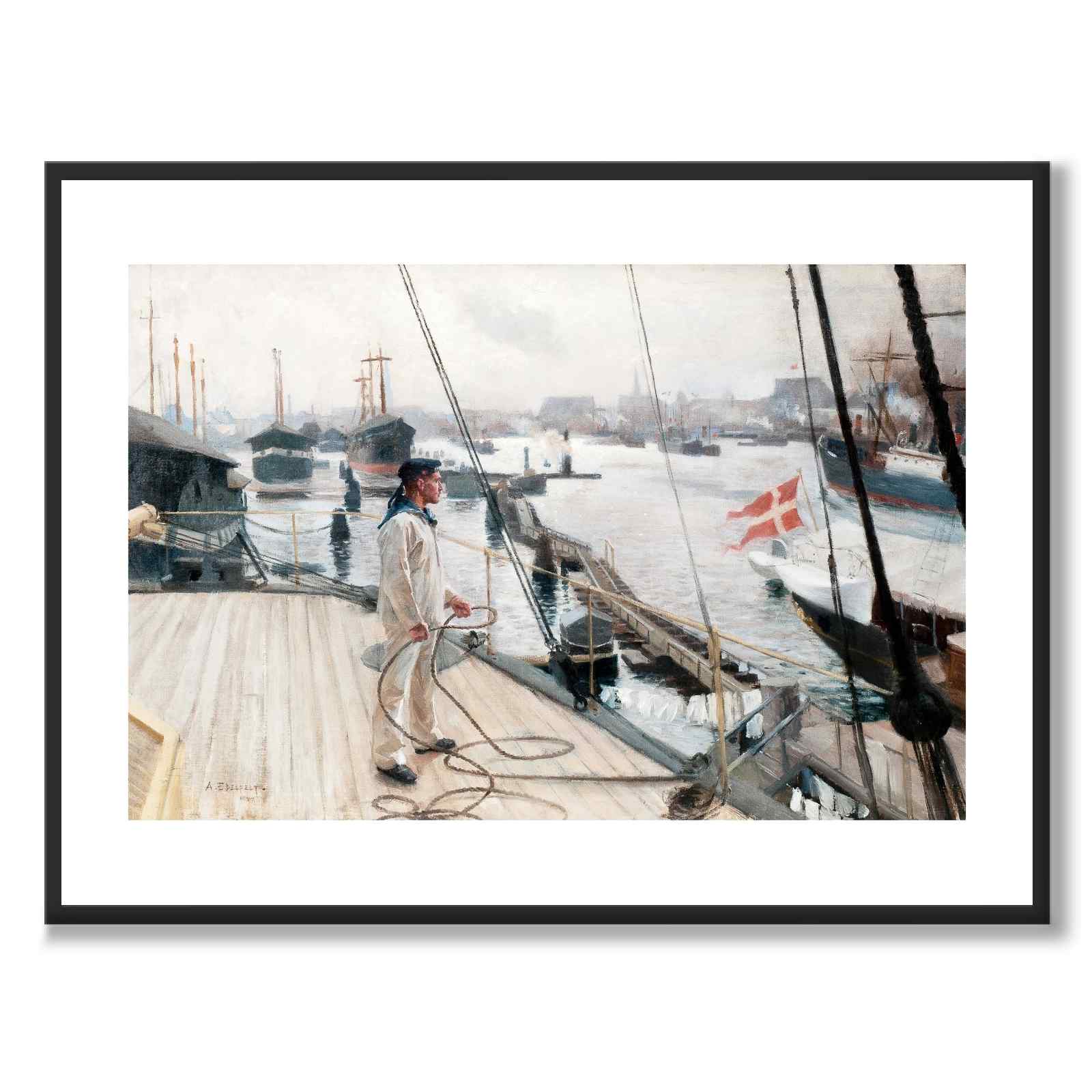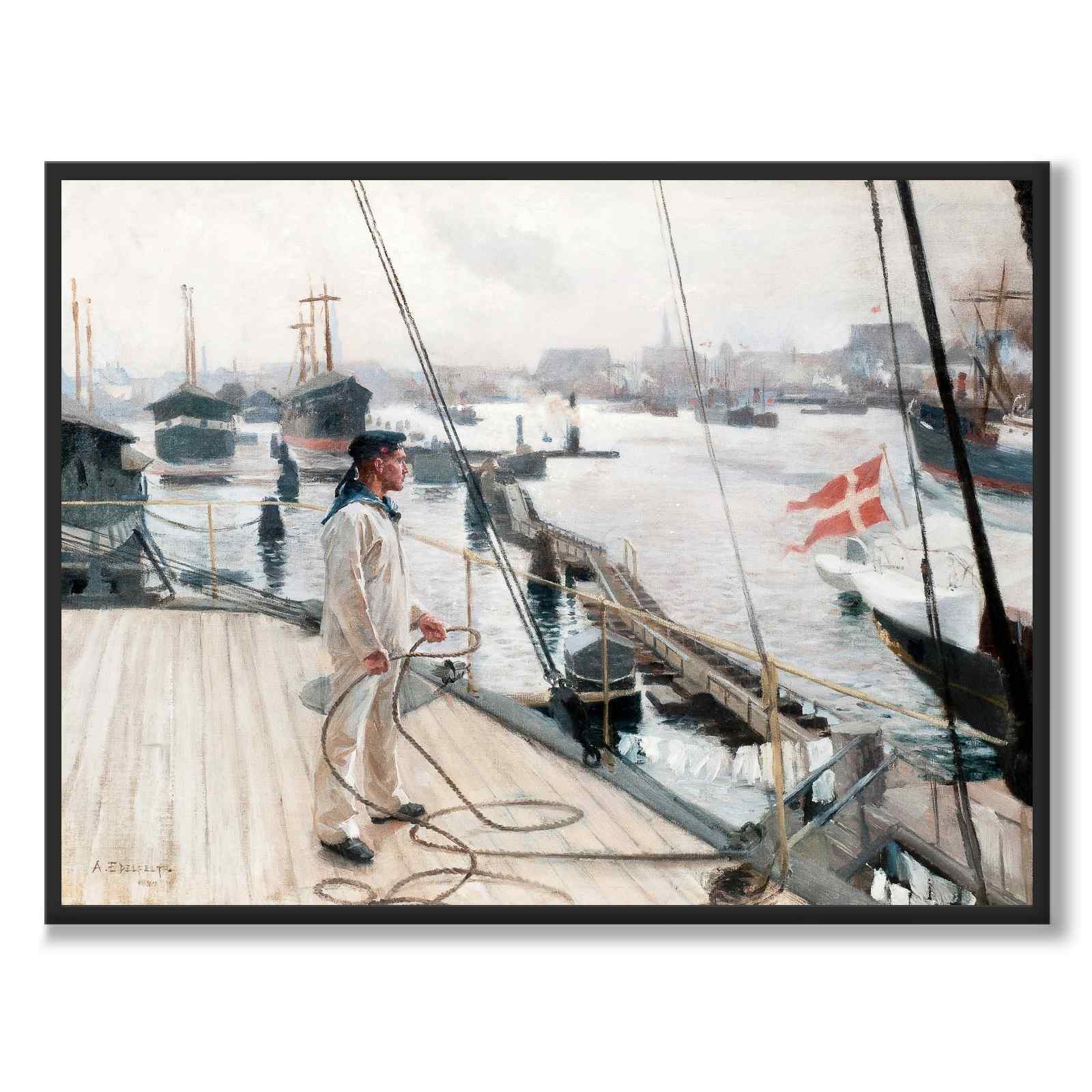 Plakat med det vakre maleriet Fra Københavns havn I av Albert Edelfelt fra 1890-tallet. På bildet ser vi en mann som skal legge til kai ved havnen i København. I bakgrunnen ser vi det danske flagget.