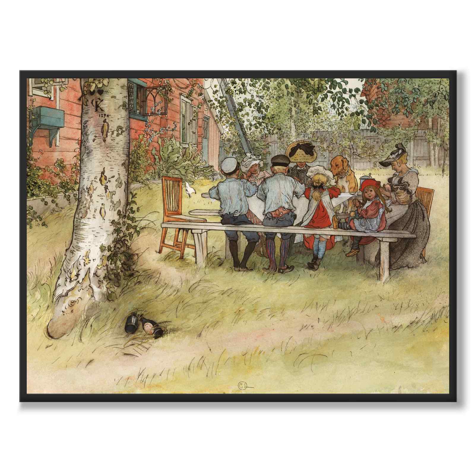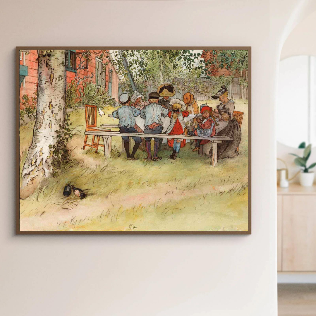 Plakat med maleriet Frokost under den store bjørka av Carl Larsson fra år 1896.