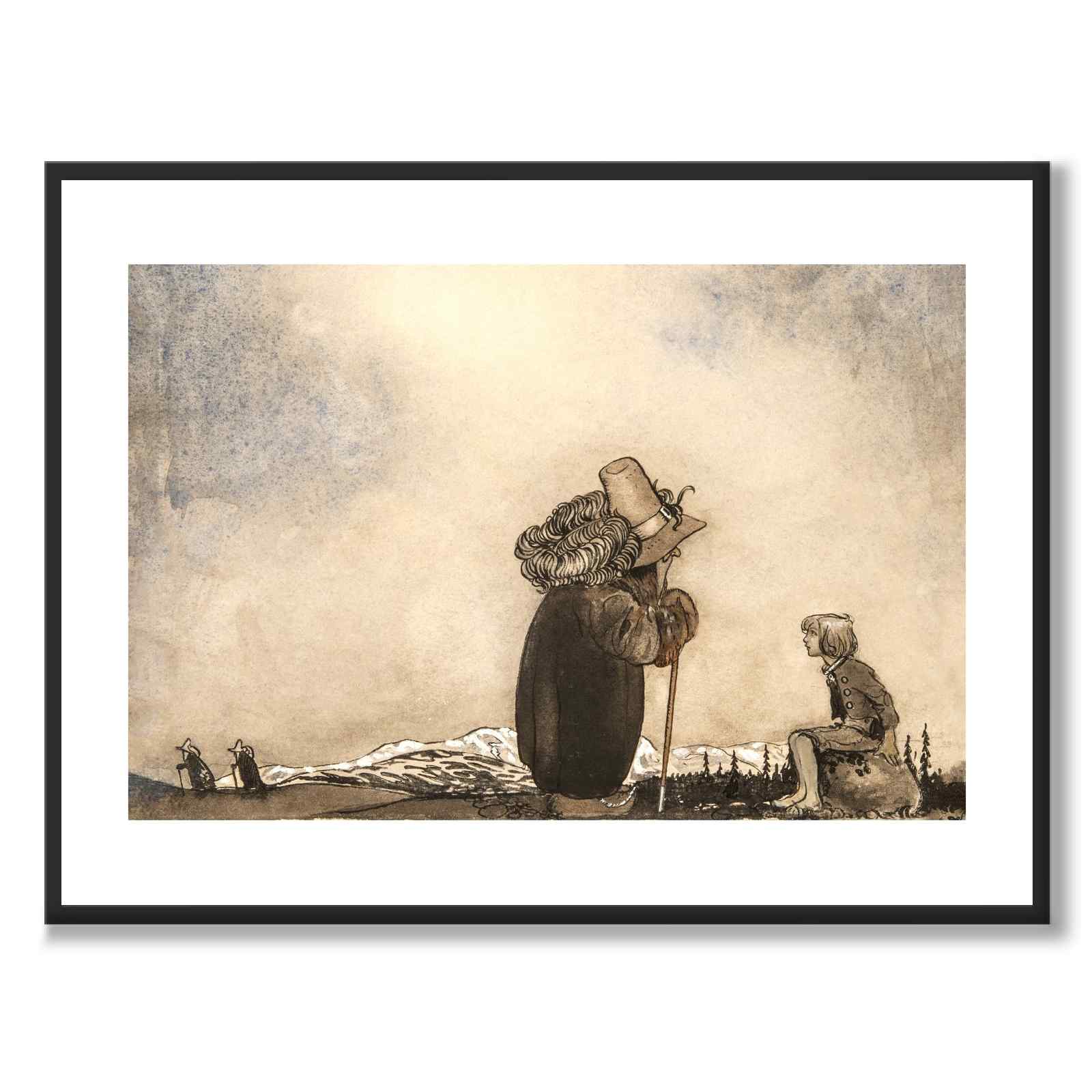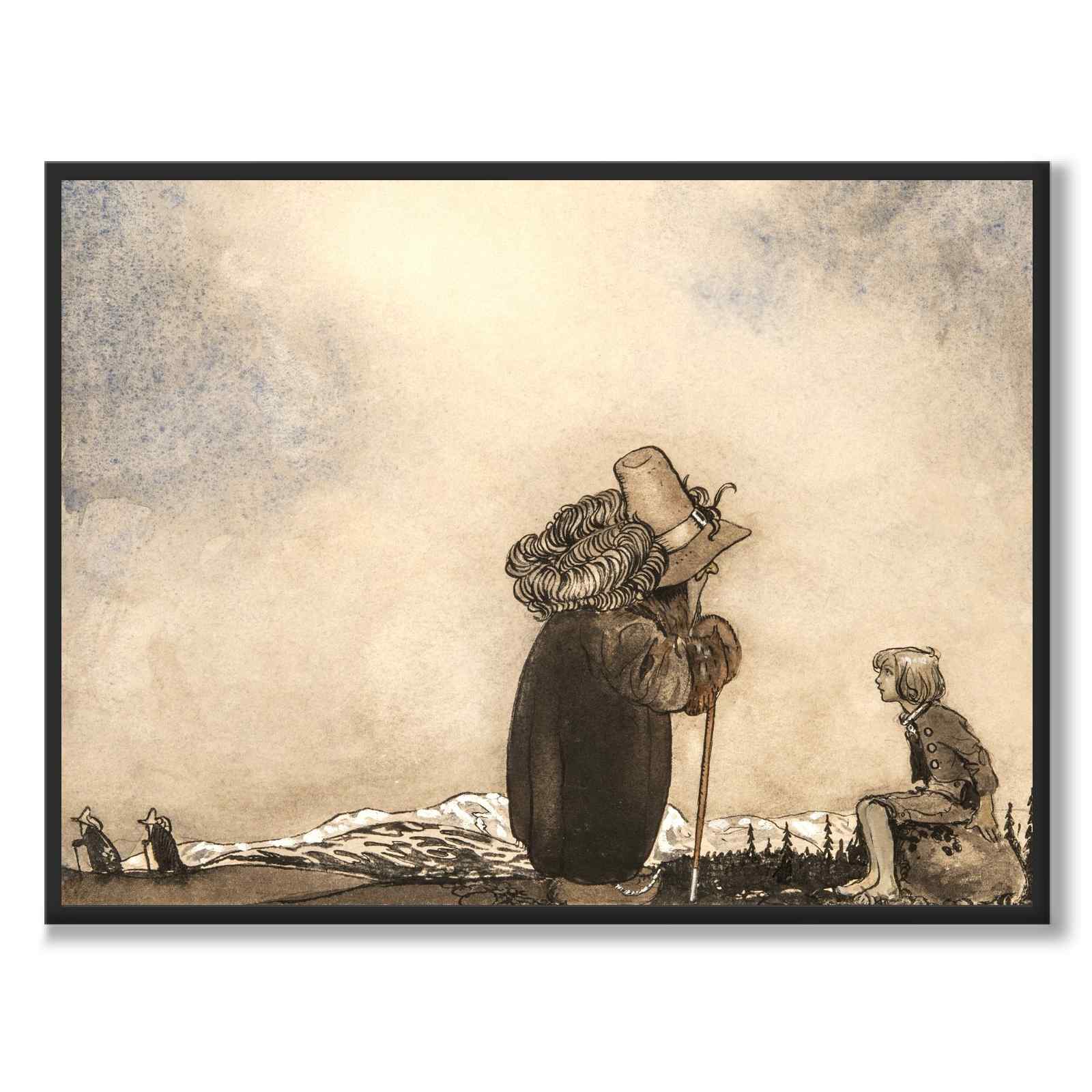 Plakat med det fine maleriet Gammel mann snakker med gutt av John Bauer fra 1909. Motivet forestiller en eldre mann som snakker med en yngre gutt som sitter på en stein i et nordisk fjellmiljø. I bakgrunnen ser vi to menn til som går på stier.