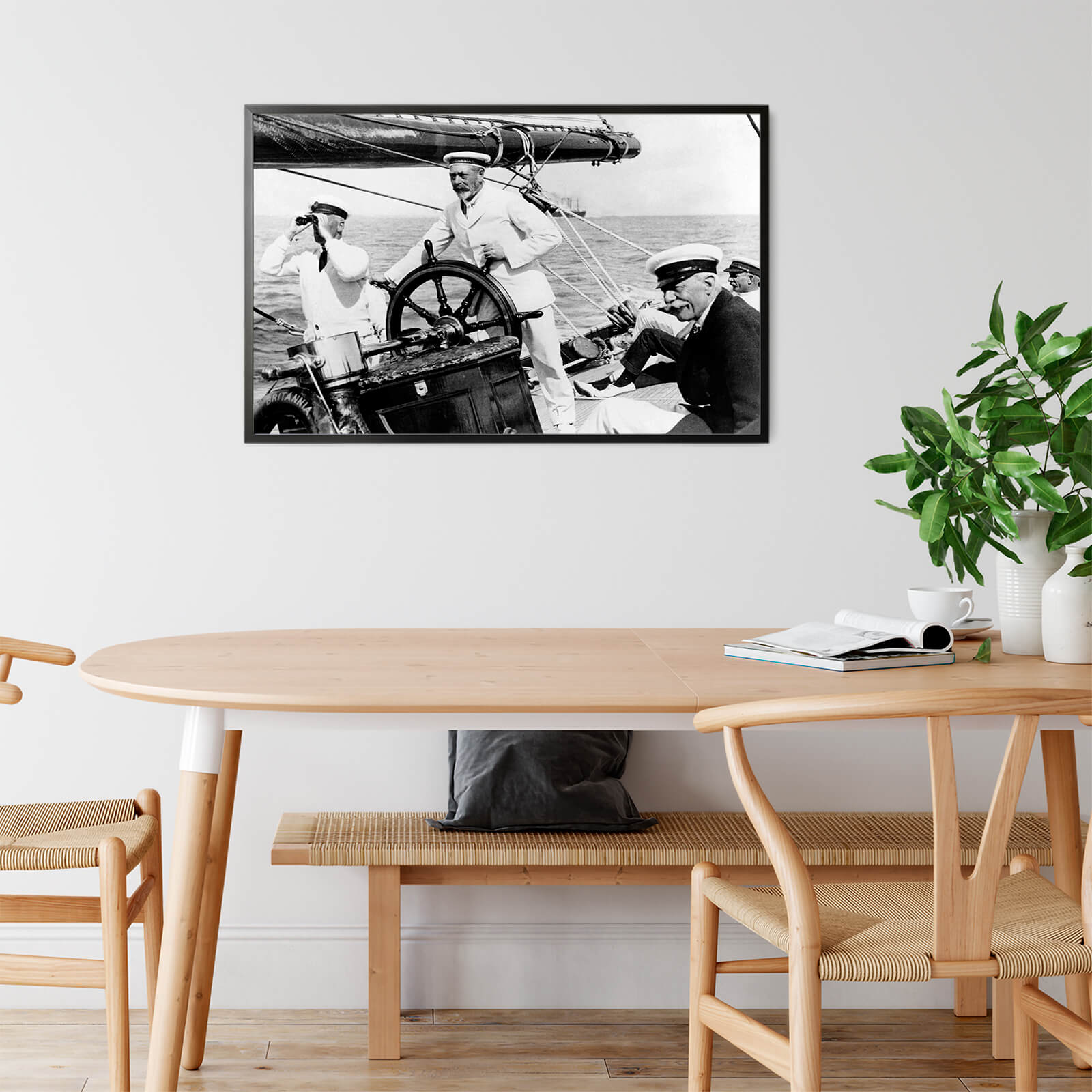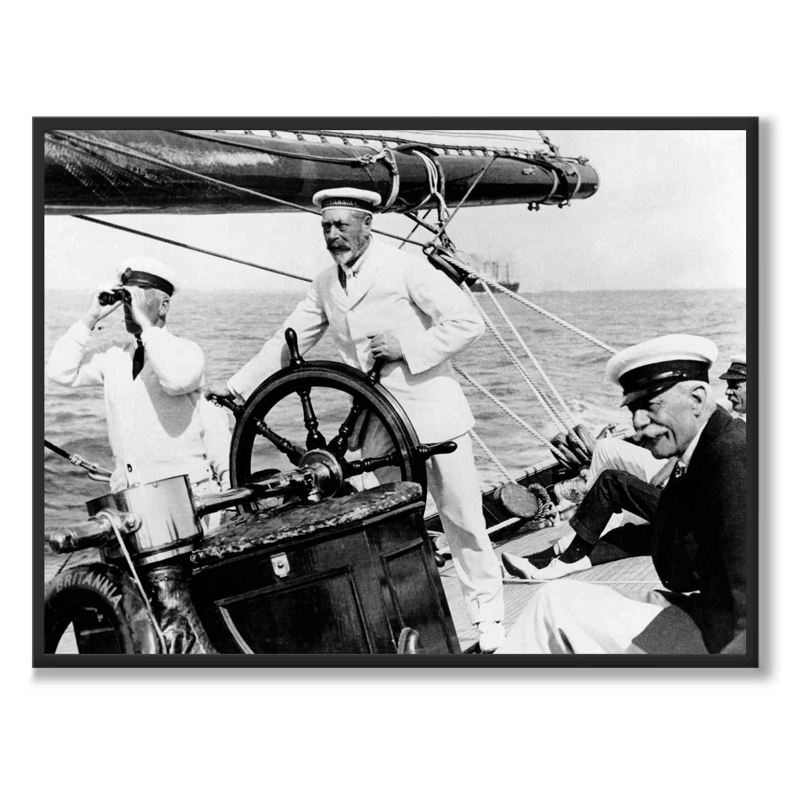 Kong George V ved roret på sin seilyacht Britannia under Cowes Regatta Week i England i 1924. George V levde mellom 1865-1936 og var konge av Storbritannia og keiser av India.