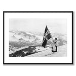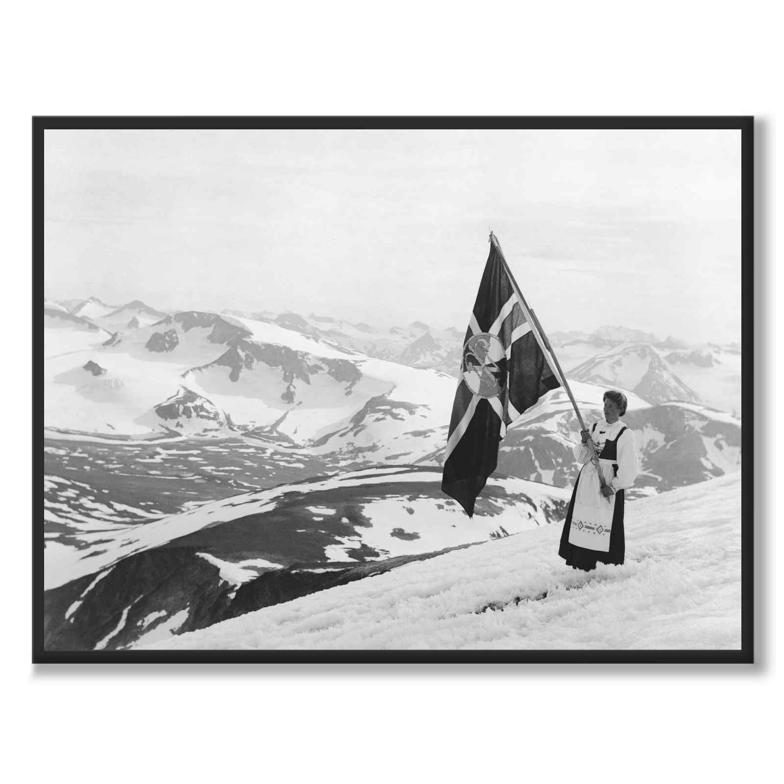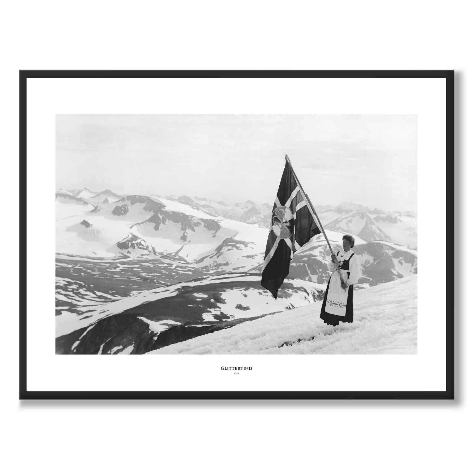 Plakat med et vakkert fotografi av en kvinne som står på Glittertind , tatt i 1910 av Anders Beer Wilse. Kvinnen er kledd i tradisjonell folkedrakt, med Glittertind Turistforeningens flagg .