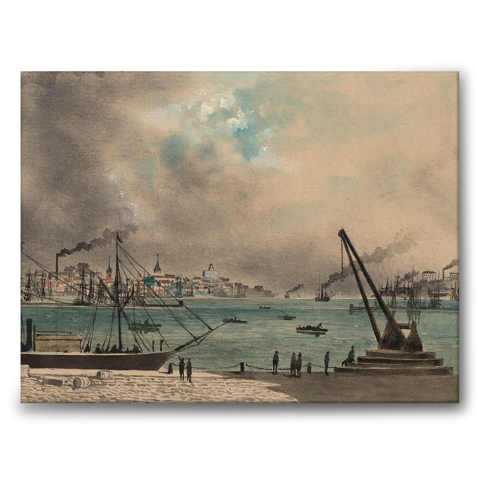 Lerret med et vakkert maleri av Gøteborgs havn, med Skeppsbron fra Hisingssiden.