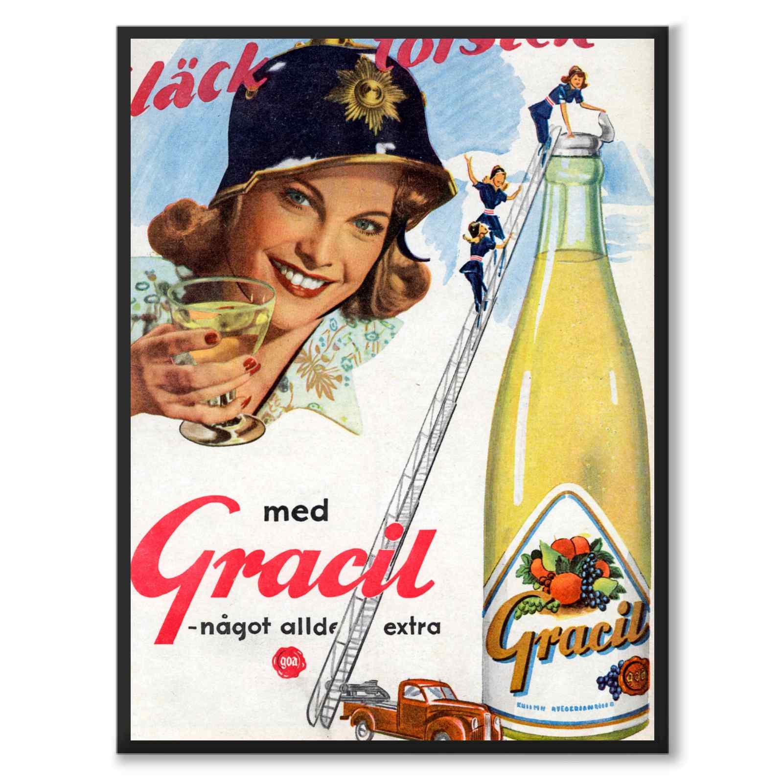 En unik plakat med en illustrert annonse fra fortiden, som fremkaller en deilig vintagefølelse. Annonsen er fra 1949 for brusen Gracil .