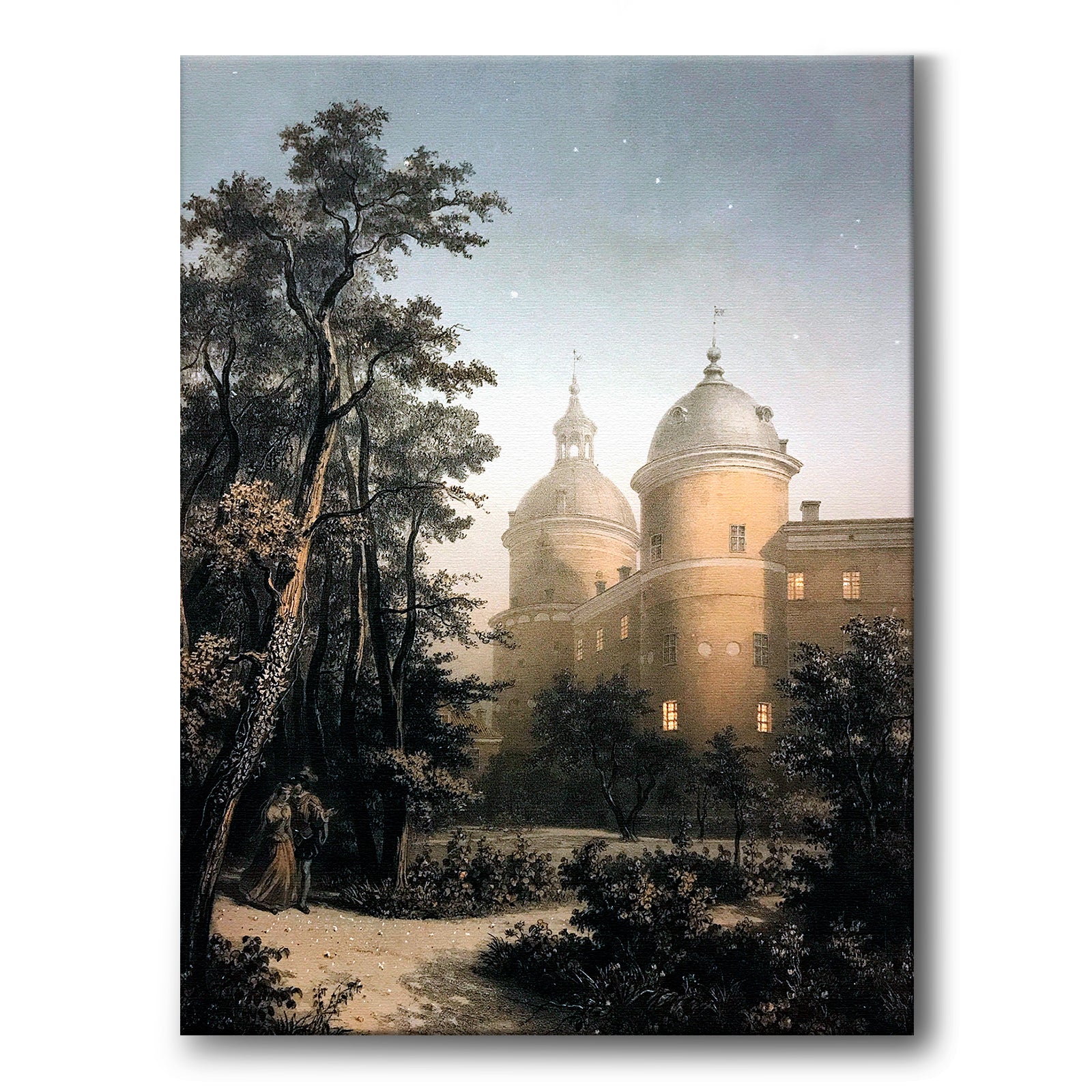 Lerret med et stemningsfullt maleri av Carl Johan Billmark fra 1850-tallet. Motivet viser fengselstårnet på Gripsholm slott. Til venstre blant trærne ser vi en mann og kvinne som går sammen i kveldsskumringen.