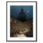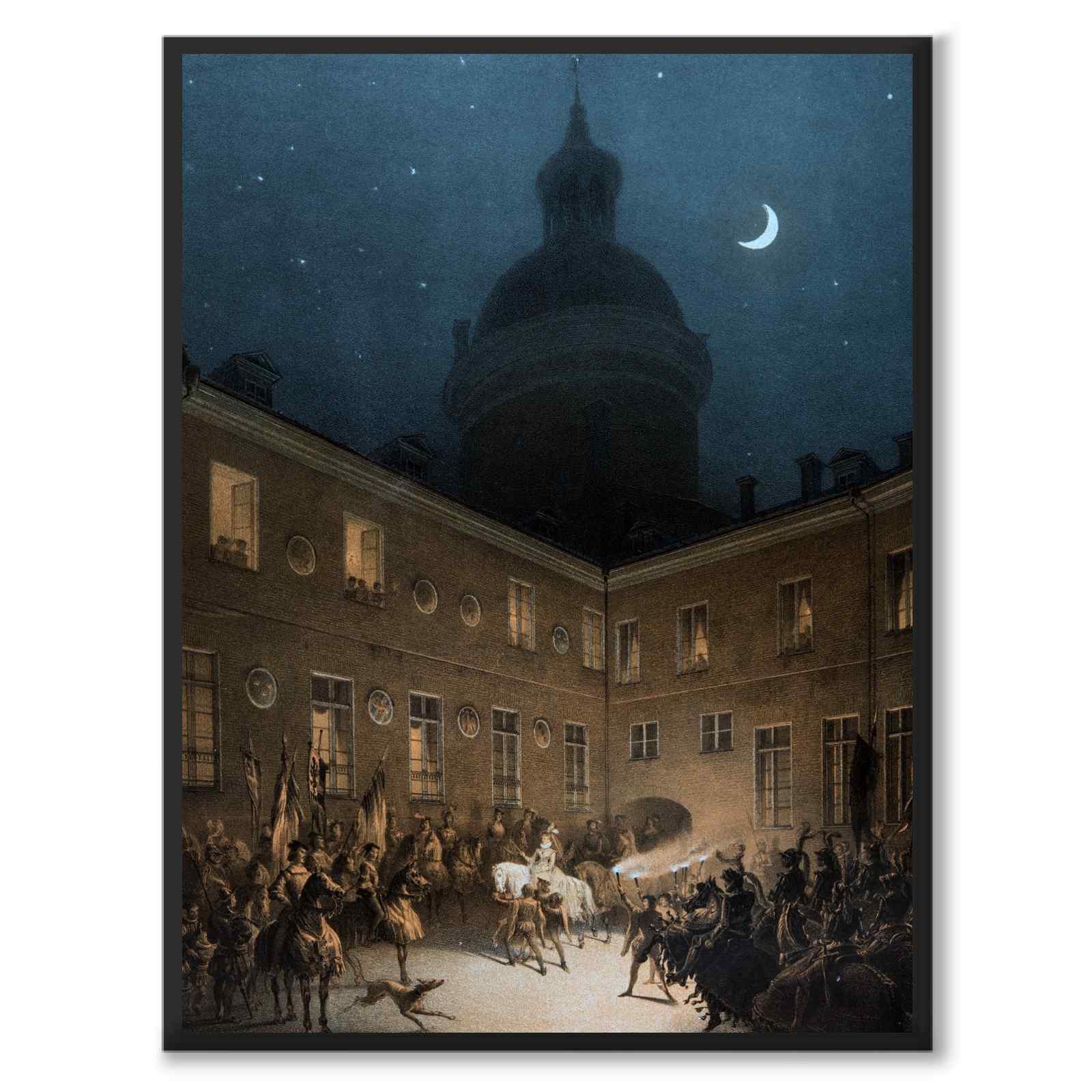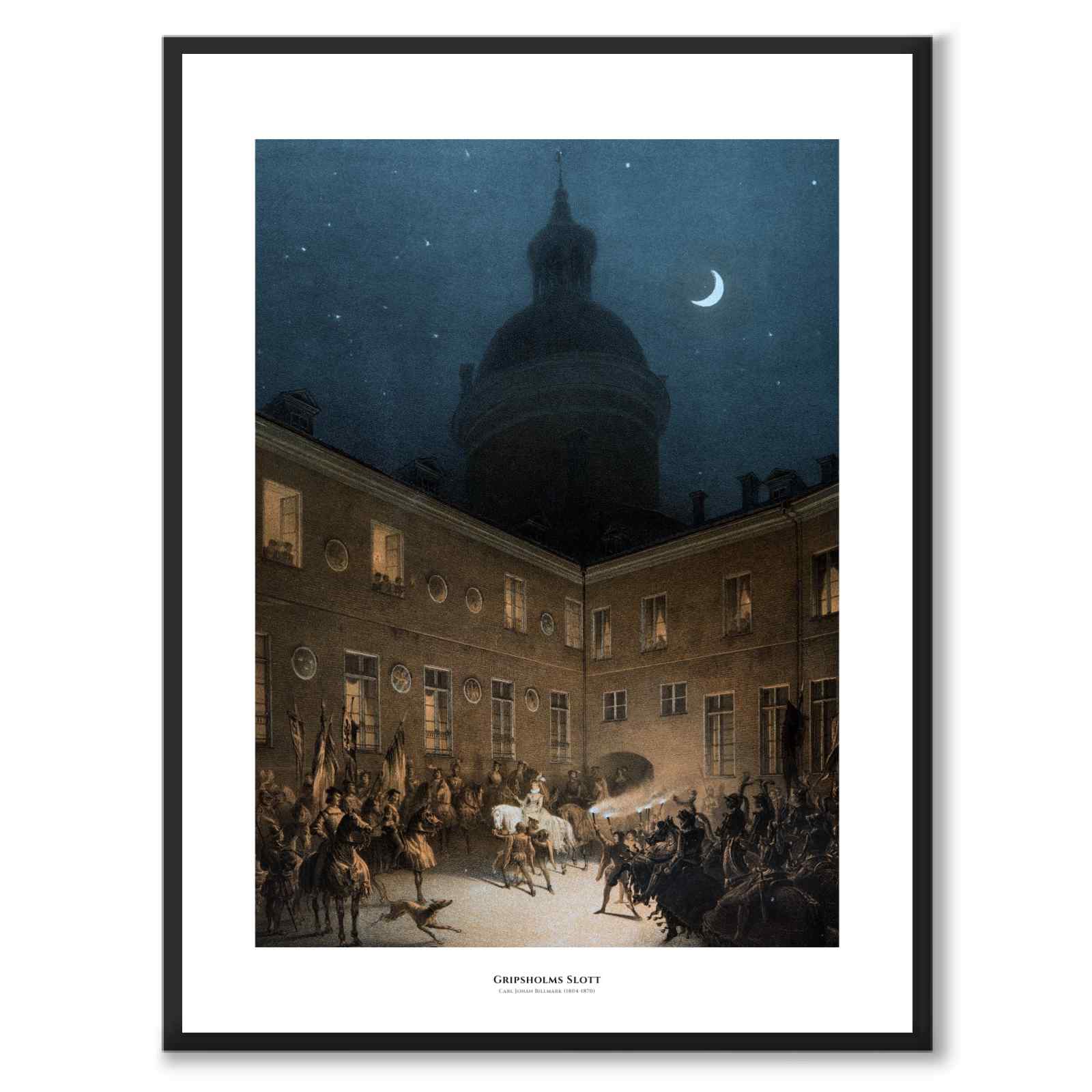 Plakat med et stemningsfullt maleri av Gripsholm slott av Carl Johan Billmark fra midten av 1800-tallet. Motivet viser det indre gårdsrommet og folk som har samlet seg der. Muligens er det en av dronningene Maria Eleonora og Hedvig Eleonora som ankommer enkesetet i stormaktsperioden.