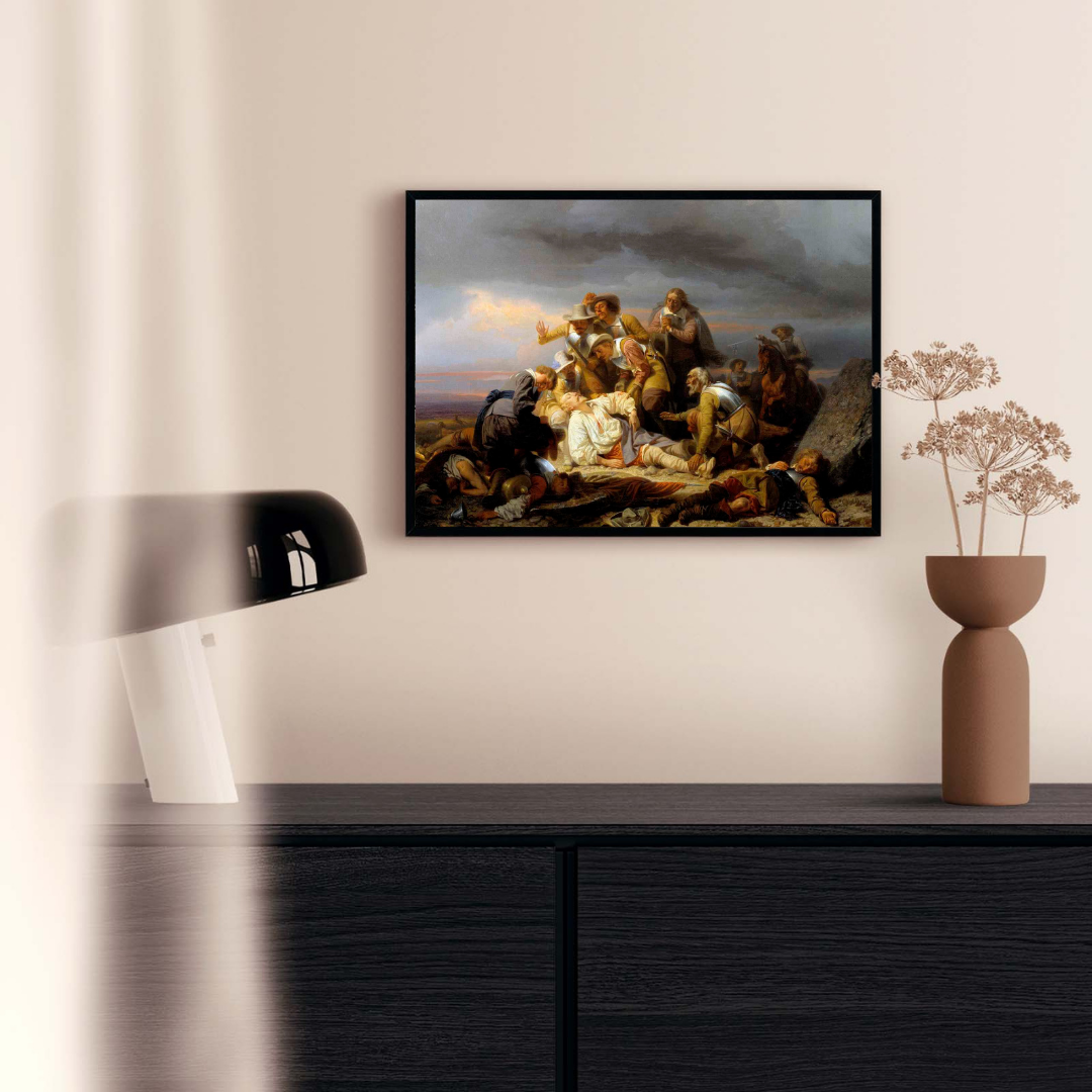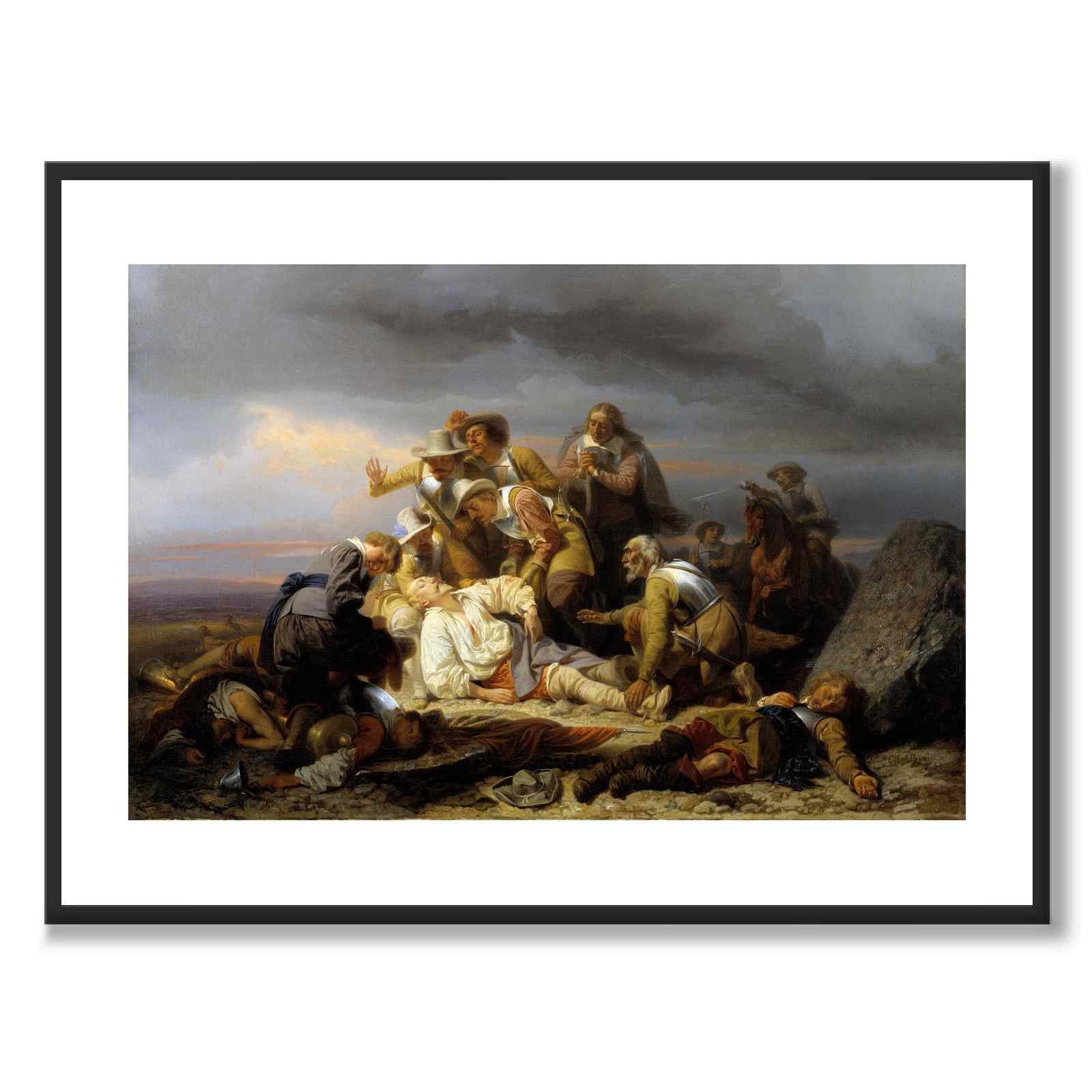 Plakat med maleriet Gustaf II Adolf blir funnet død etter slaget ved Lützen av den svenske kunstneren Carl Wahlbom.