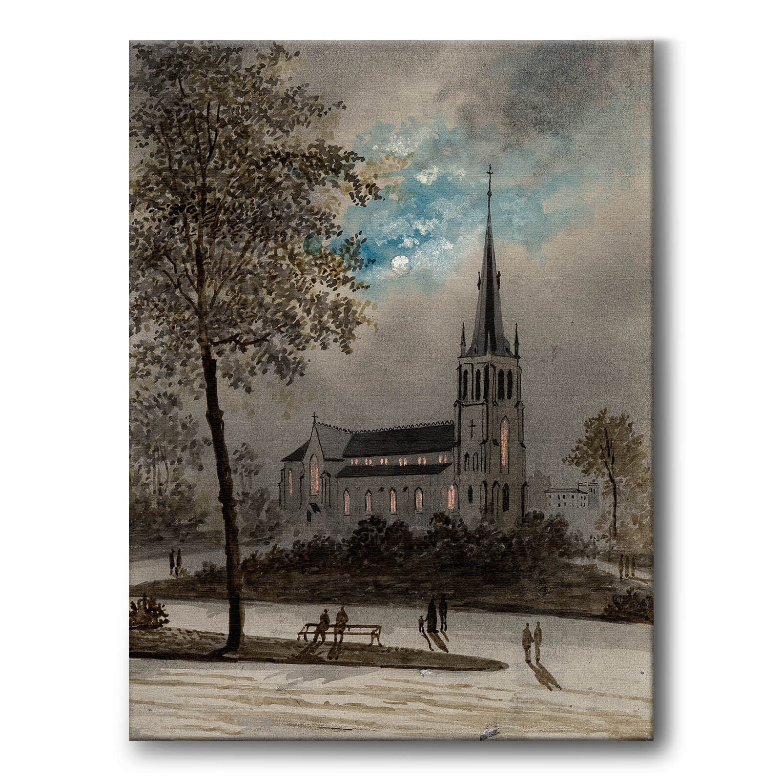 Lerret med et vakkert maleri av Hagakyrkan i Gøteborg. Kunstverket ble skapt av den danske kunstneren Ludvig Messmann i 1890 og er en del av en hel serie vakre Gøteborg-motiver.