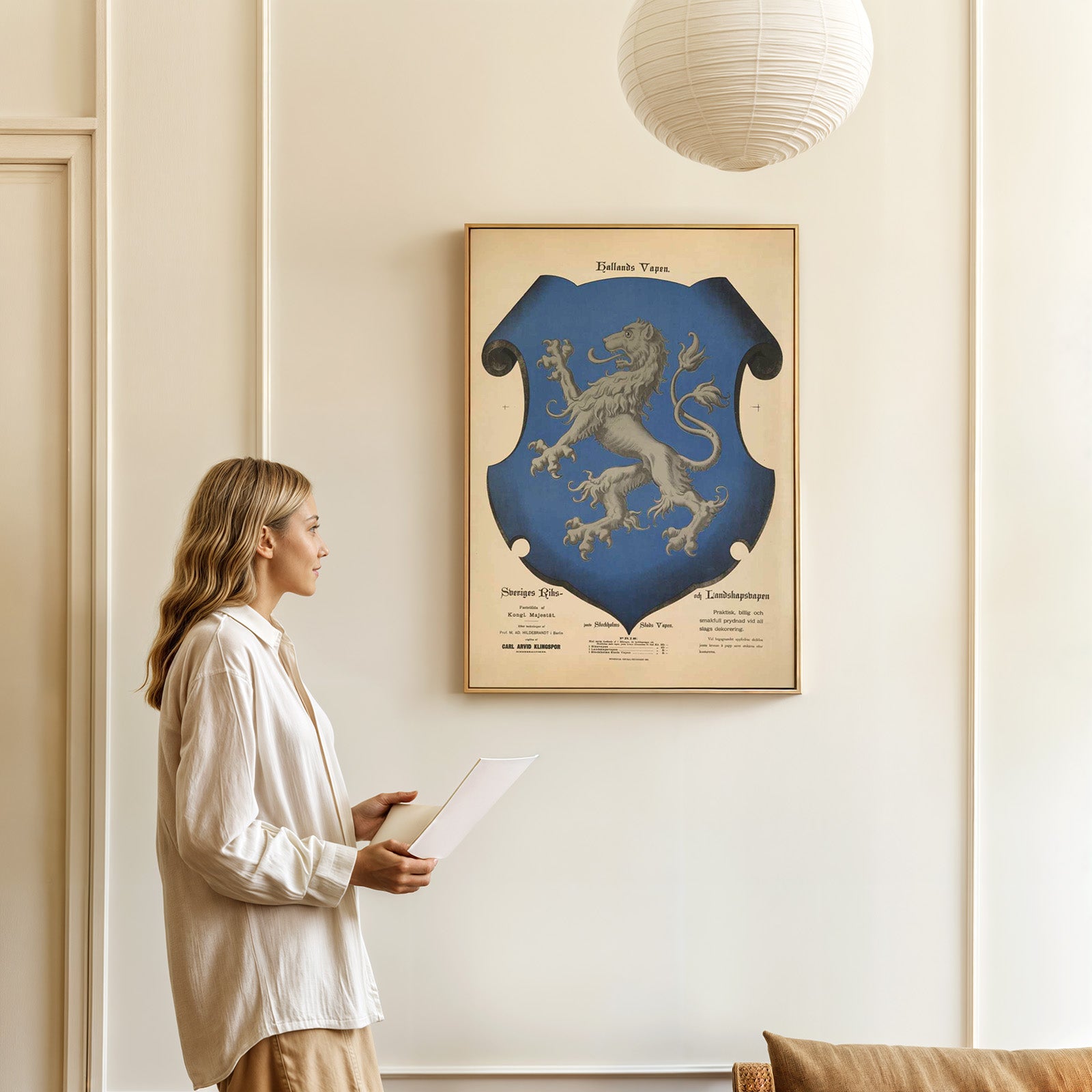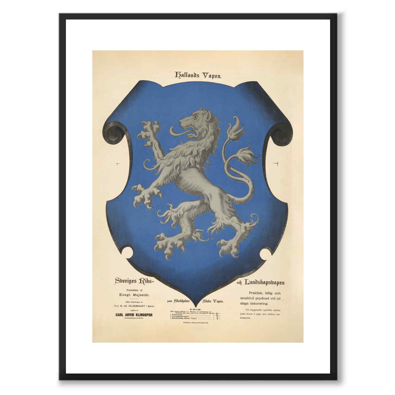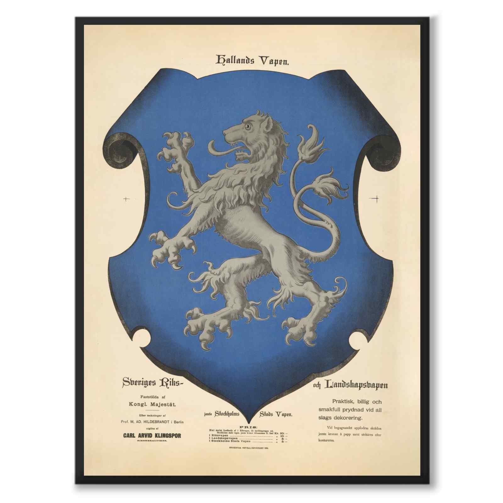 Teksten over våpenskjoldet lyder: Hallands Vapen. Nederst til venstre står det: "Sveriges riks- og landsvåpen. Etablert av den kongelige majestet. Etter tegninger av prof. M. AD. Hildebrandt i Berlin. Utgitt av Carl Arvid Klingspor."