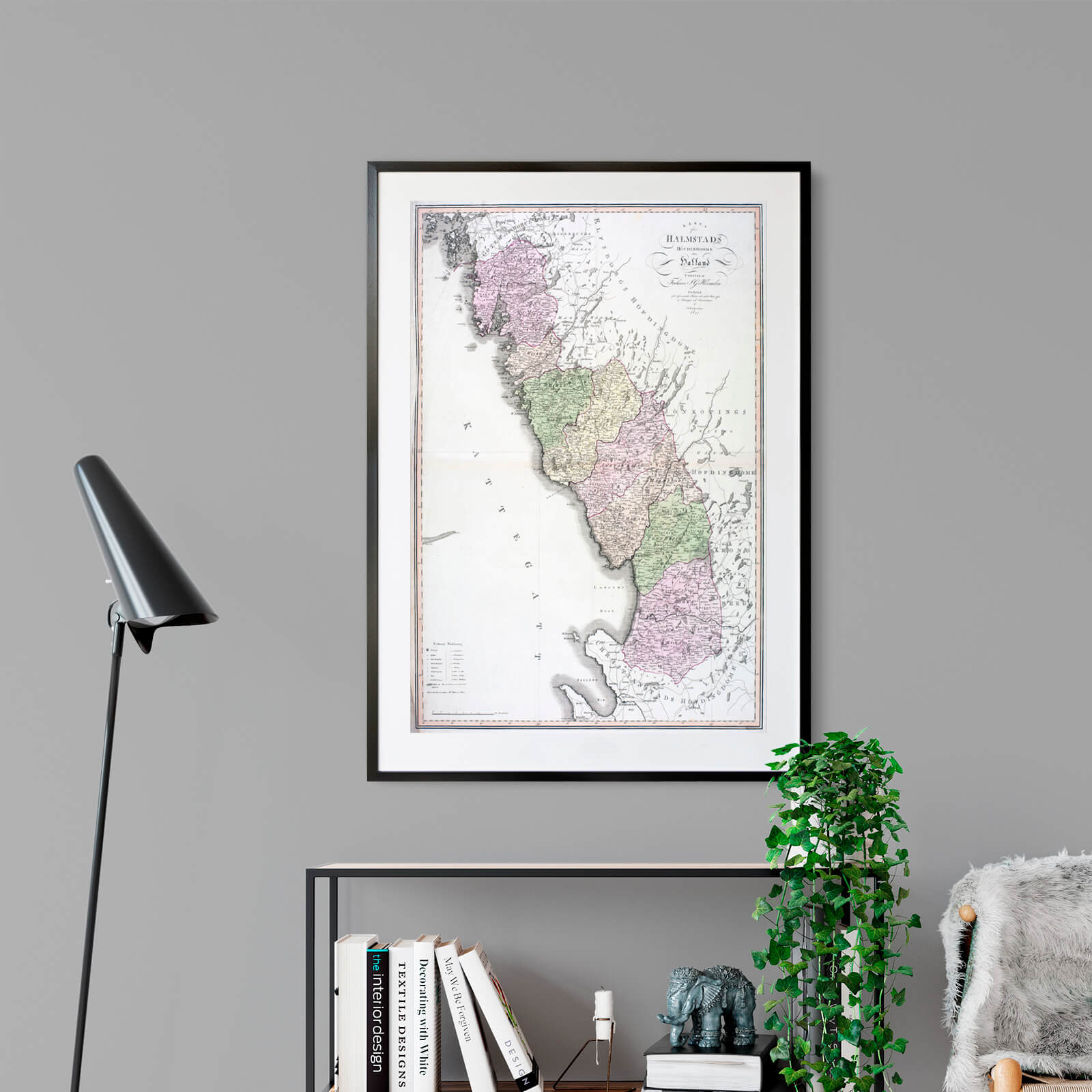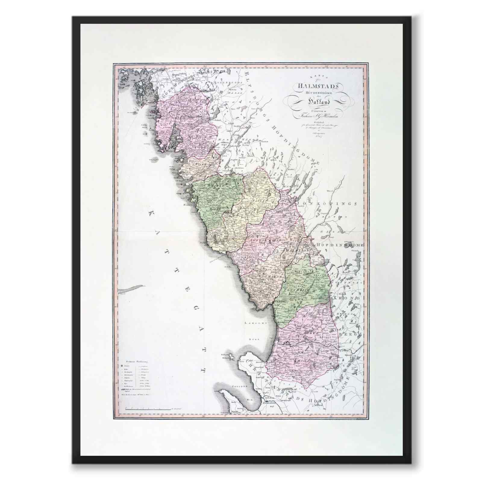 Plakat med kart over Halland og omegn i 1807. På kartet ser vi alt fra Hönö, Gøteborg, Härryda og Bollebygd i nord til og Höganäs, Ängelholm og Fagerhult i sør. Merket i farger i midten ser vi Halland, eller Halmstad som hele området ble kalt tidlig på 1800-tallet. Øverst til høyre på kartet ser vi teksten: "Kart over Halmstad fyrstedømme eller Halland". Et fantastisk bilde over en stor del av Sveriges vestkyst.