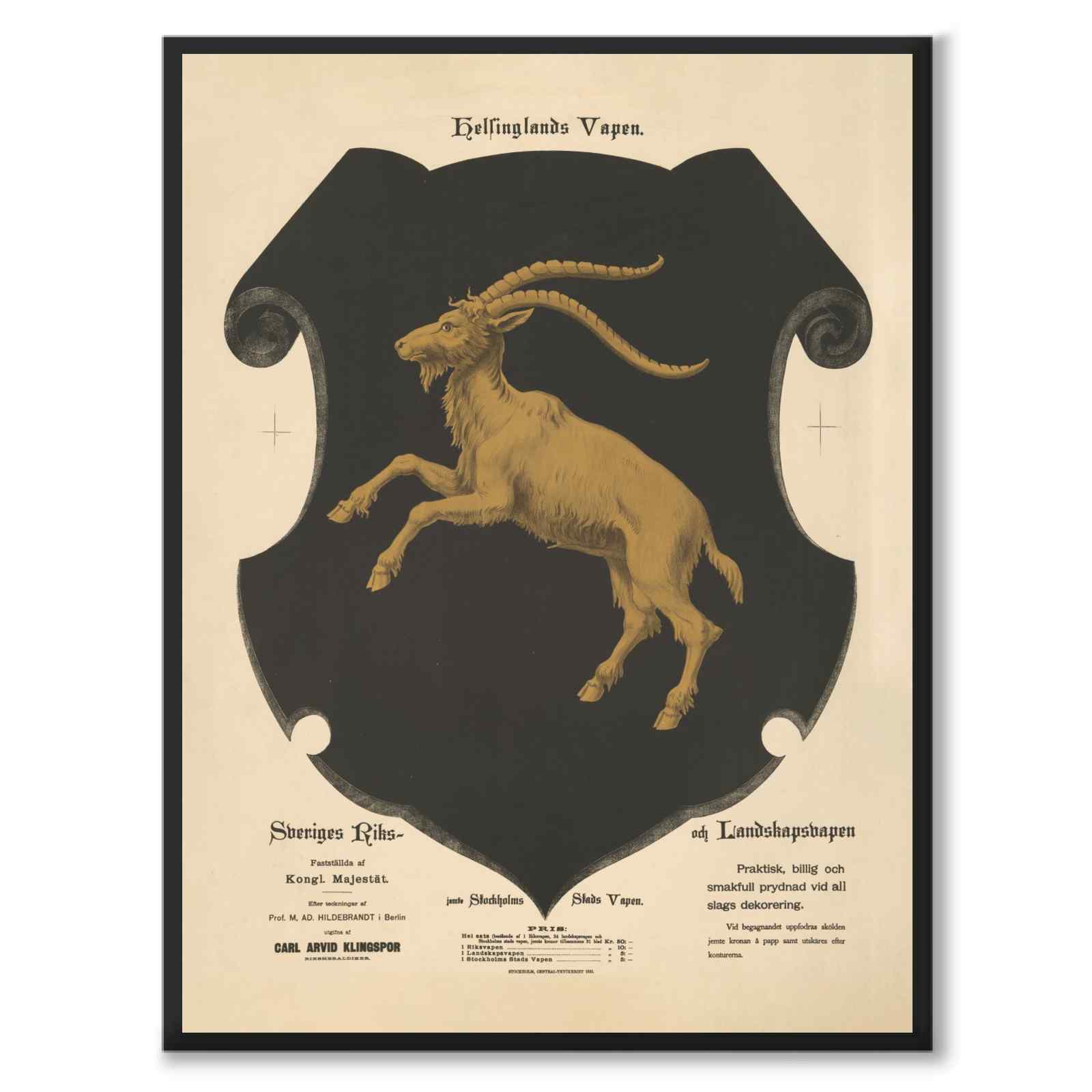 Teksten over våpenskjoldet lyder: Helsinglands våpenskjold. Nederst til venstre står det: "Sveriges riks- og landsvåpen. Etablert av den kongelige majestet. Etter tegninger av prof. M. AD. Hildebrandt i Berlin. Utgitt av Carl Arvid Klingspor."