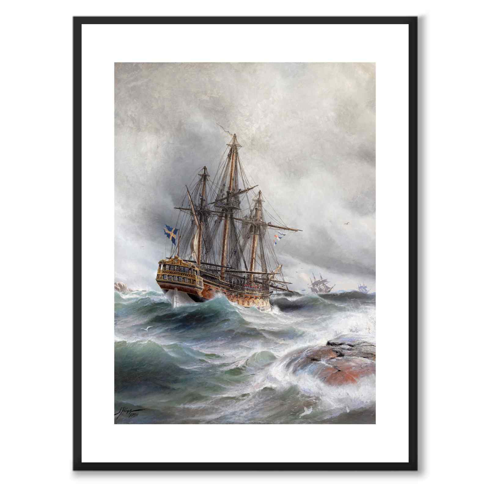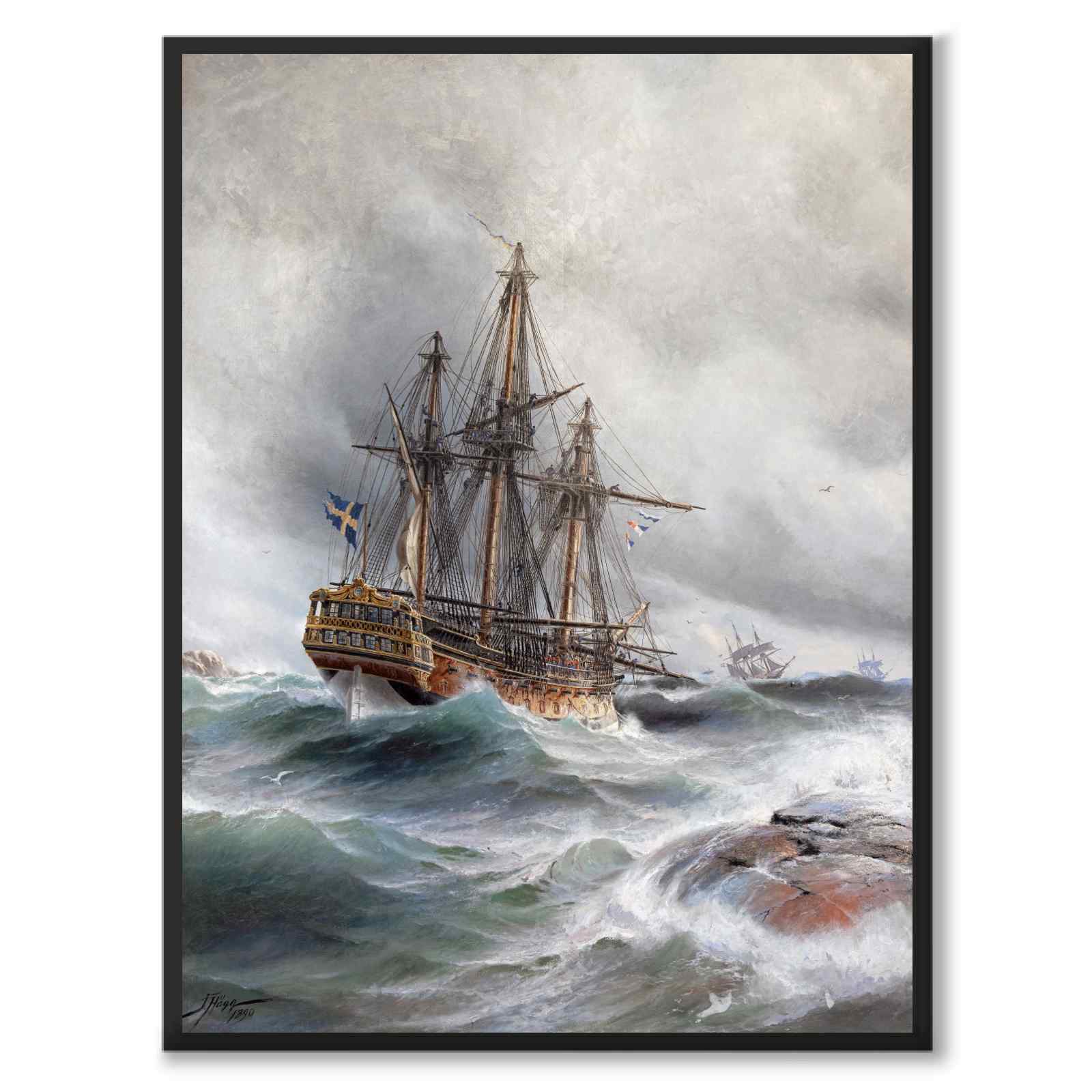 På bildet ser vi et svensk linjeskip som er kjørt mot kysten under en storm. Det svenske flagget vaier i hekken.