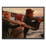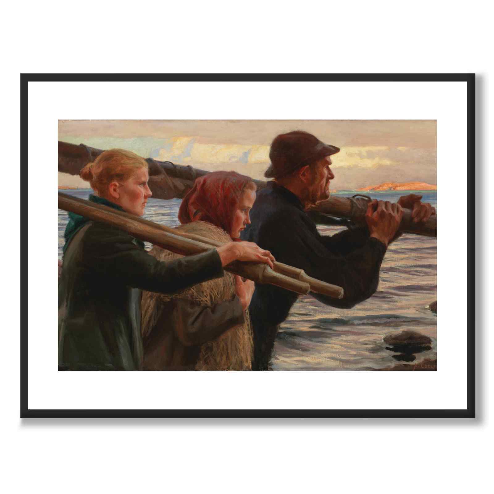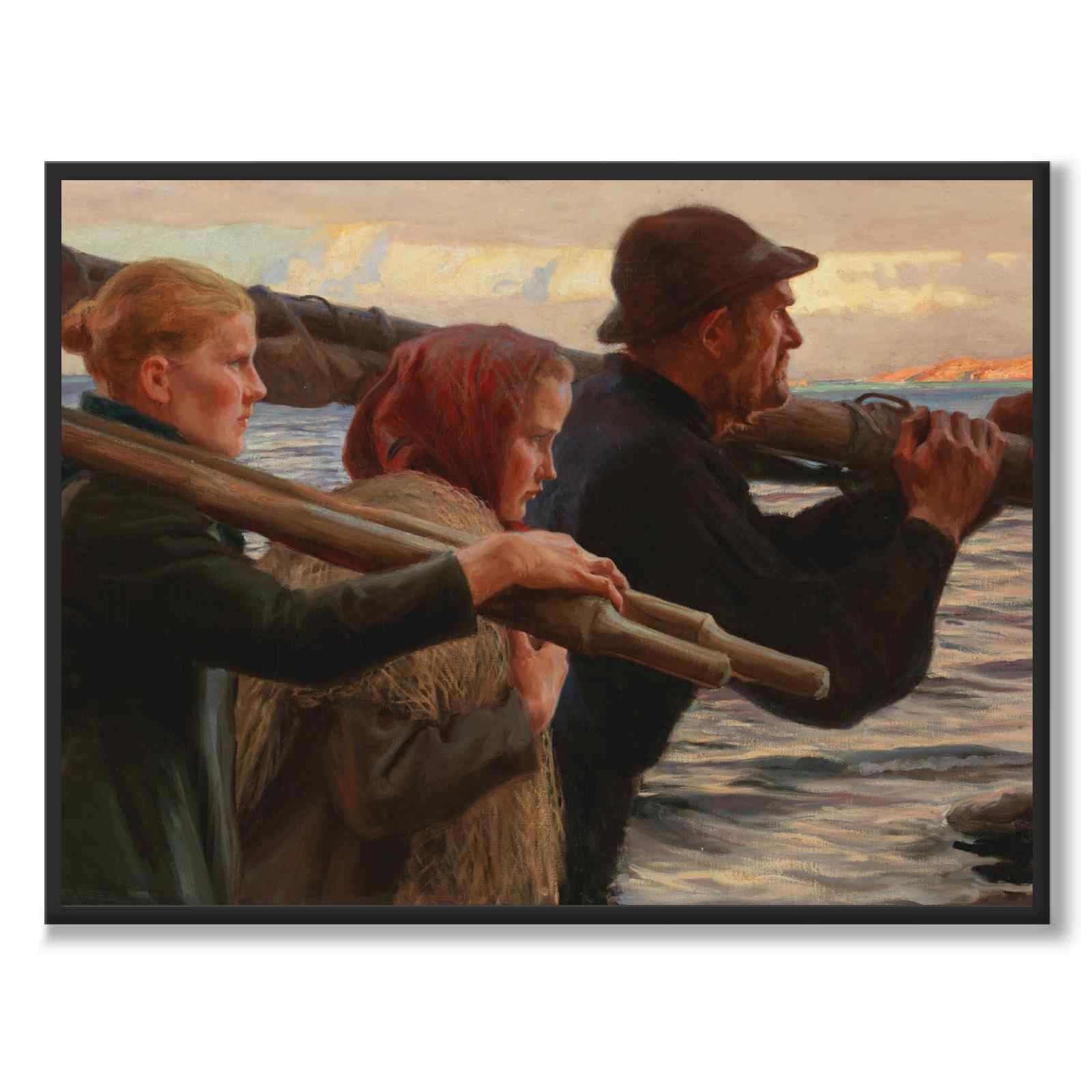 Plakat med det vakre maleriet In the Outer Rim laget av Albert Edelfelt i 1898. På maleriet ser vi to kvinner og en mann som bærer årer, fiskegarn og en mast. I bakgrunnen ser vi havet og en fantastisk himmel ved soloppgang.