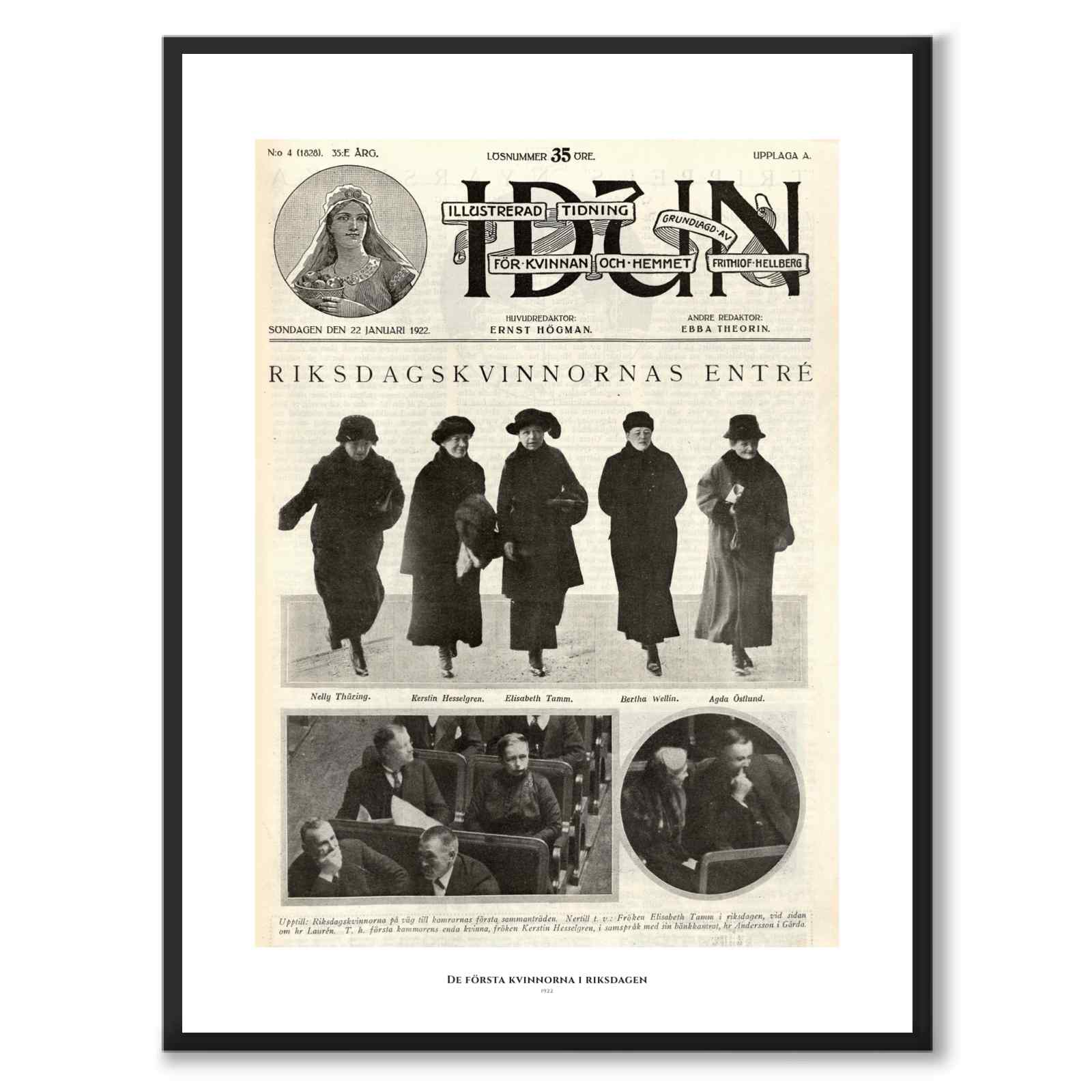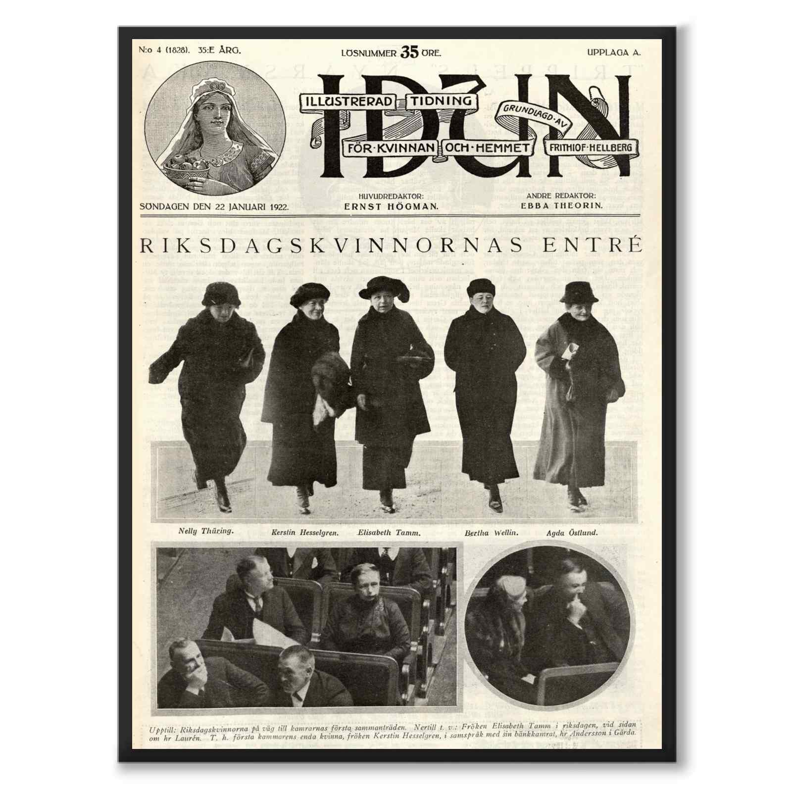 Høsten 1921 fant det første stortingsvalget sted hvor kvinner både var stemmeberettigede og stemmeberettigede. Forsiden fra Idun i 1922 viser de fem første kvinnene som ble valgt inn i Sveriges Riksdag: Elisabeth Tamm, Nelly Thüring, Bertha Wellin, Kerstin Hesselgren og Agda Östlund. For de som vil lære mer om disse fem sterke og svært inspirerende kvinnene anbefaler vi dokumentaren som nå er tilgjengelig på SVT Play .