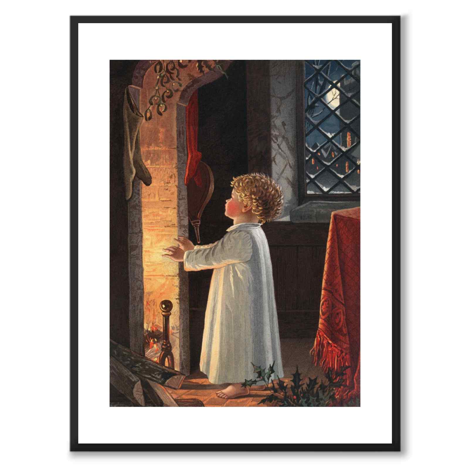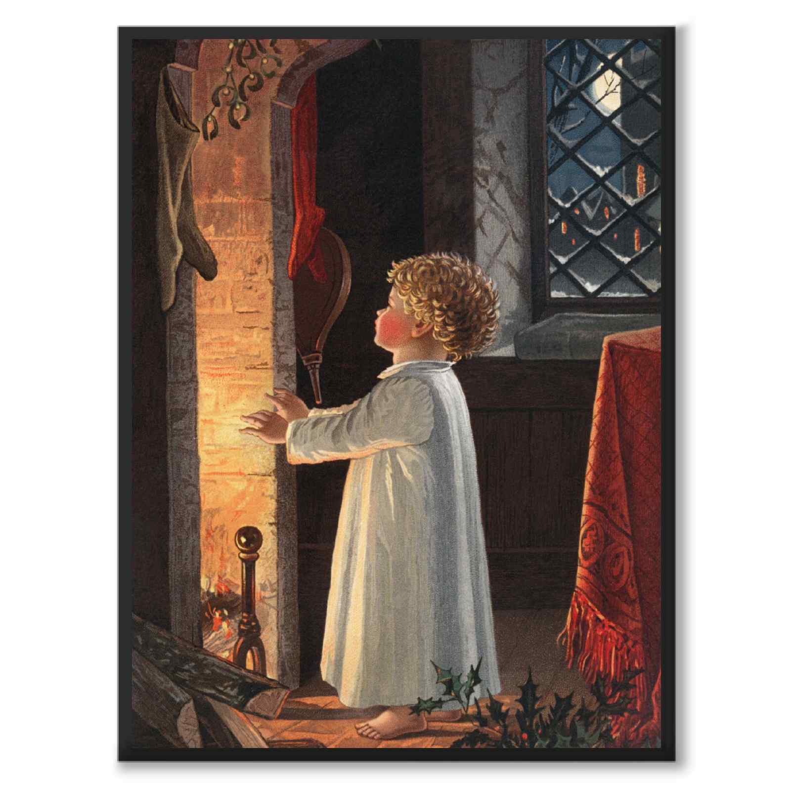 Et lite barn varmer seg foran et bål sent på julaften. Utenfor vinduet lyser månen opp byen. Det henger strømper og misteltein over bålet.