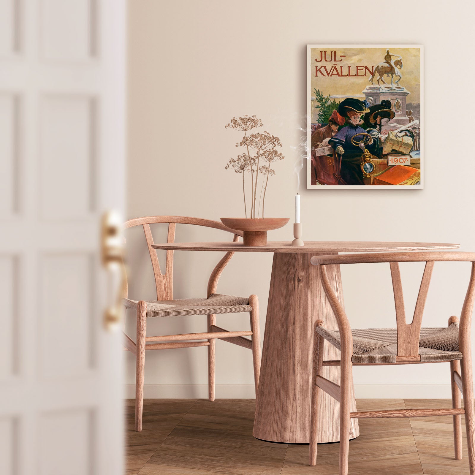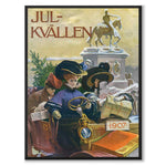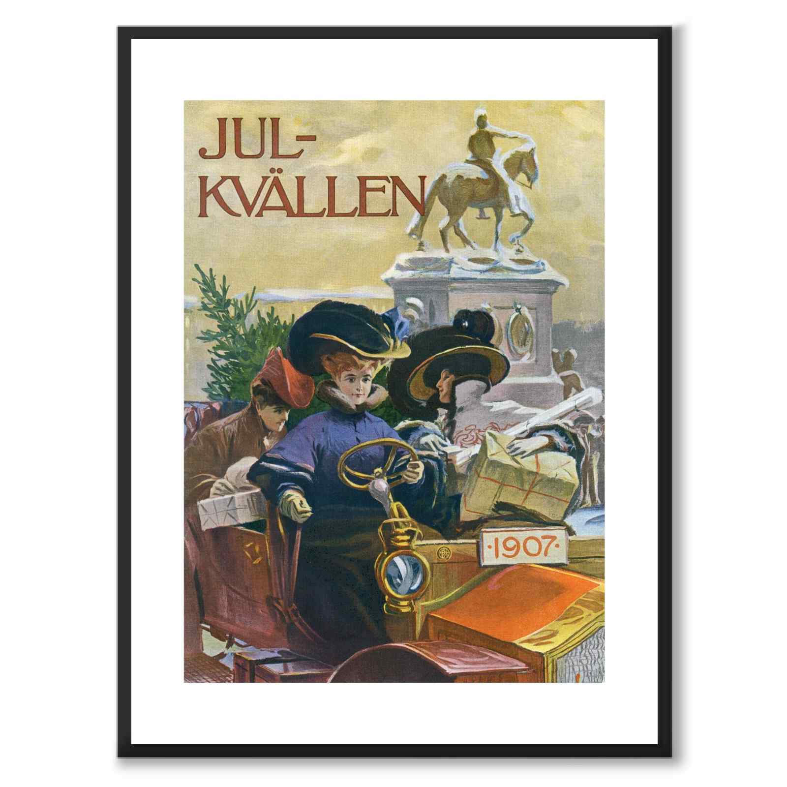 Plakat med vakkert julemotiv med omslag fra bladet Julkvällen fra 1907. Motivet viser tre velkledde damer i en fin bil, de har bilen full av julegaver og et tre i bakluken.