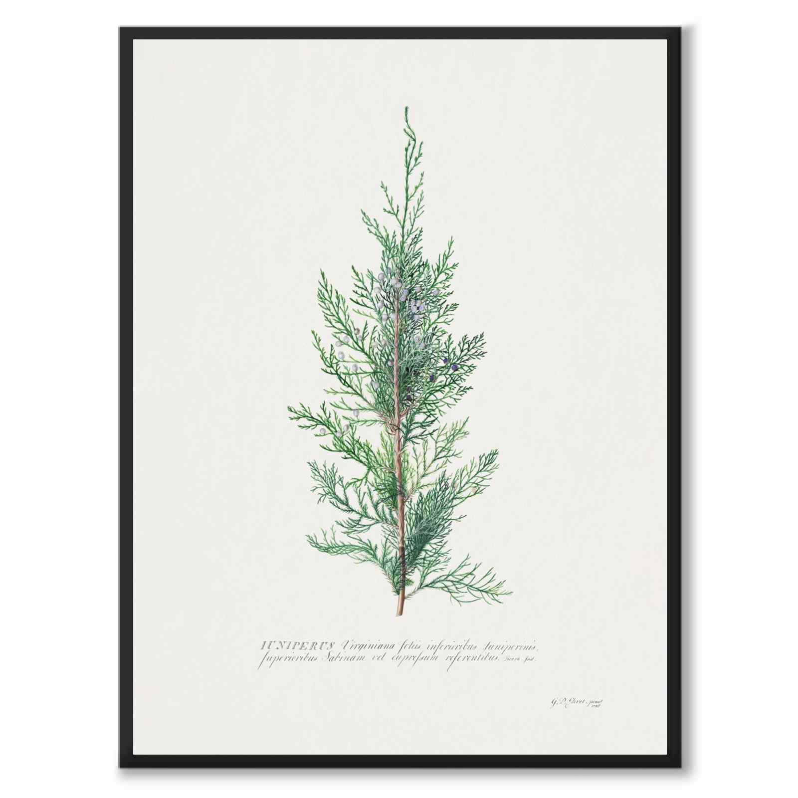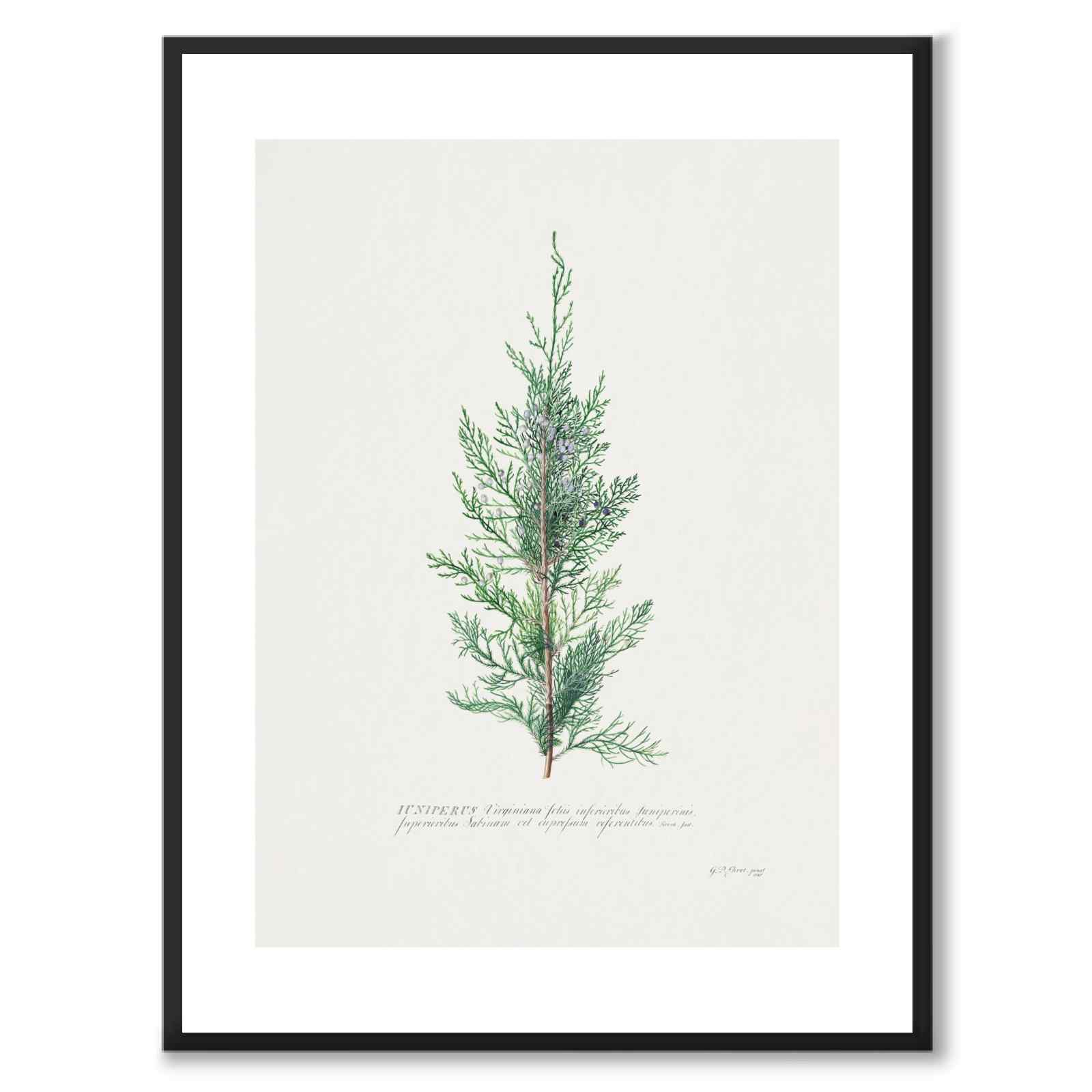 Plakat med en klassisk illustrasjon av Juniper . Illustrasjonen ble laget av Georg Dionysius Ehret som var en tysk botaniker og entomolog, kjent for sine botaniske illustrasjoner.
