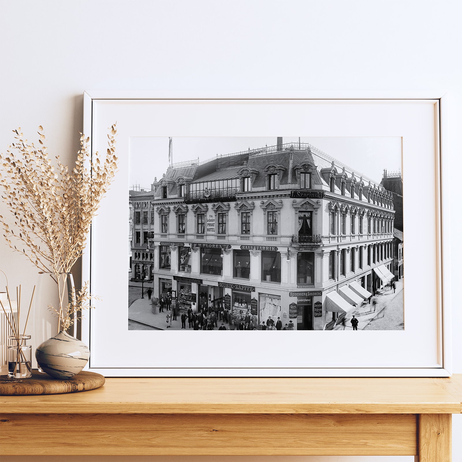Plakat med fotografi av Karl Johans gate 20 i Oslo fra år 1898.