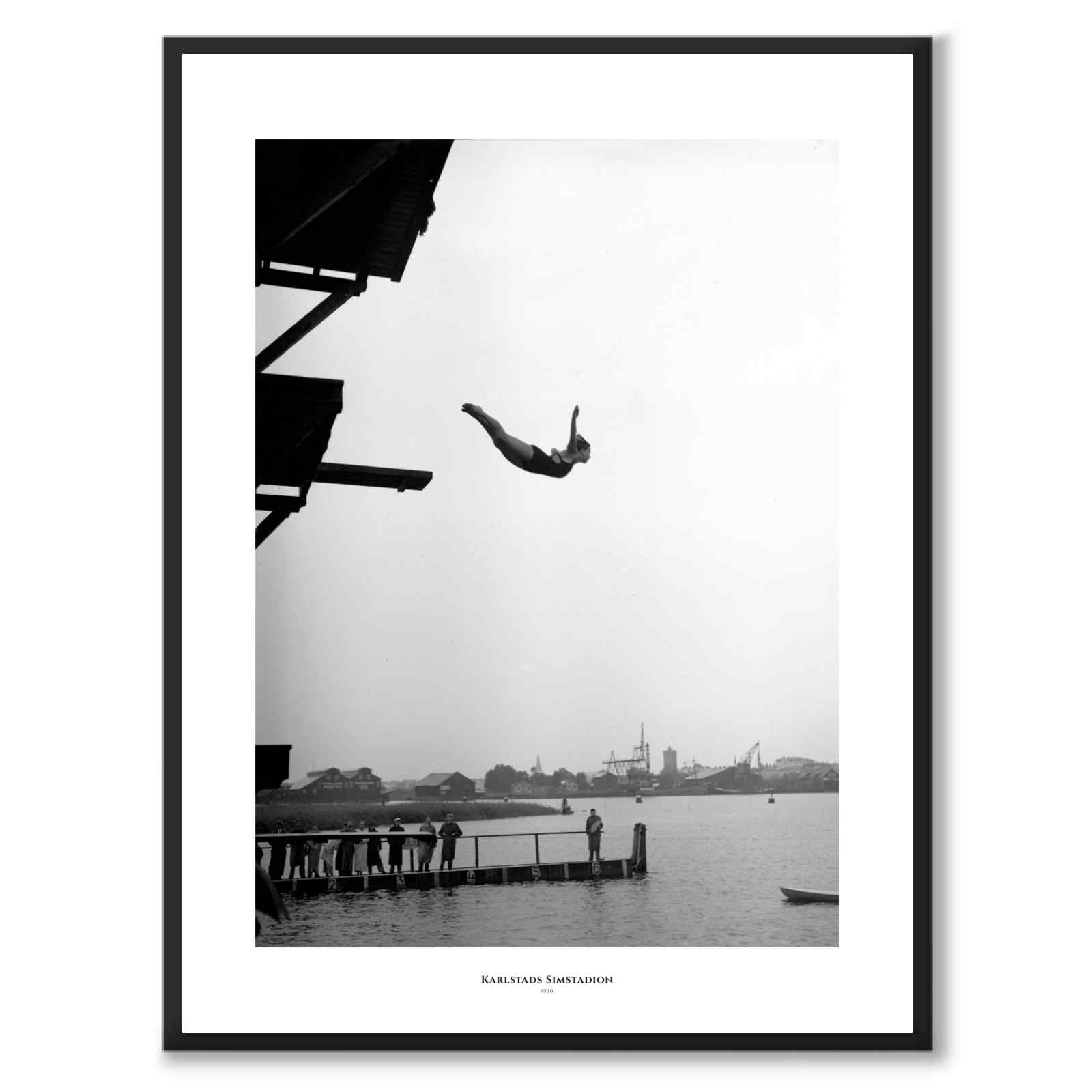 Plakat med gammelt fotografi fra Karlstads Svømmestadion. Det tidligere anlegget lå i tilknytning til østsiden av holmen, sør for Kanikenäset. Badet ble innviet i 1923 men ble deretter tatt ut av bruk og revet i 1943 på grunn av dårlig vannkvalitet. En lignende konstruksjon, som erstattet den på bildet, ble bygget i Örsholmstjärnet på begynnelsen av 1950-tallet.
