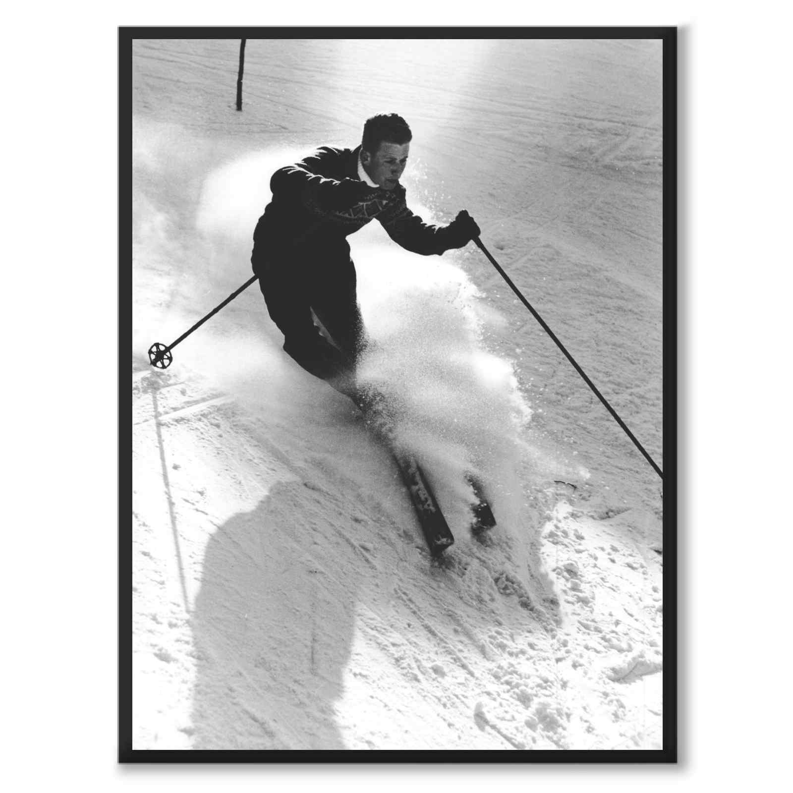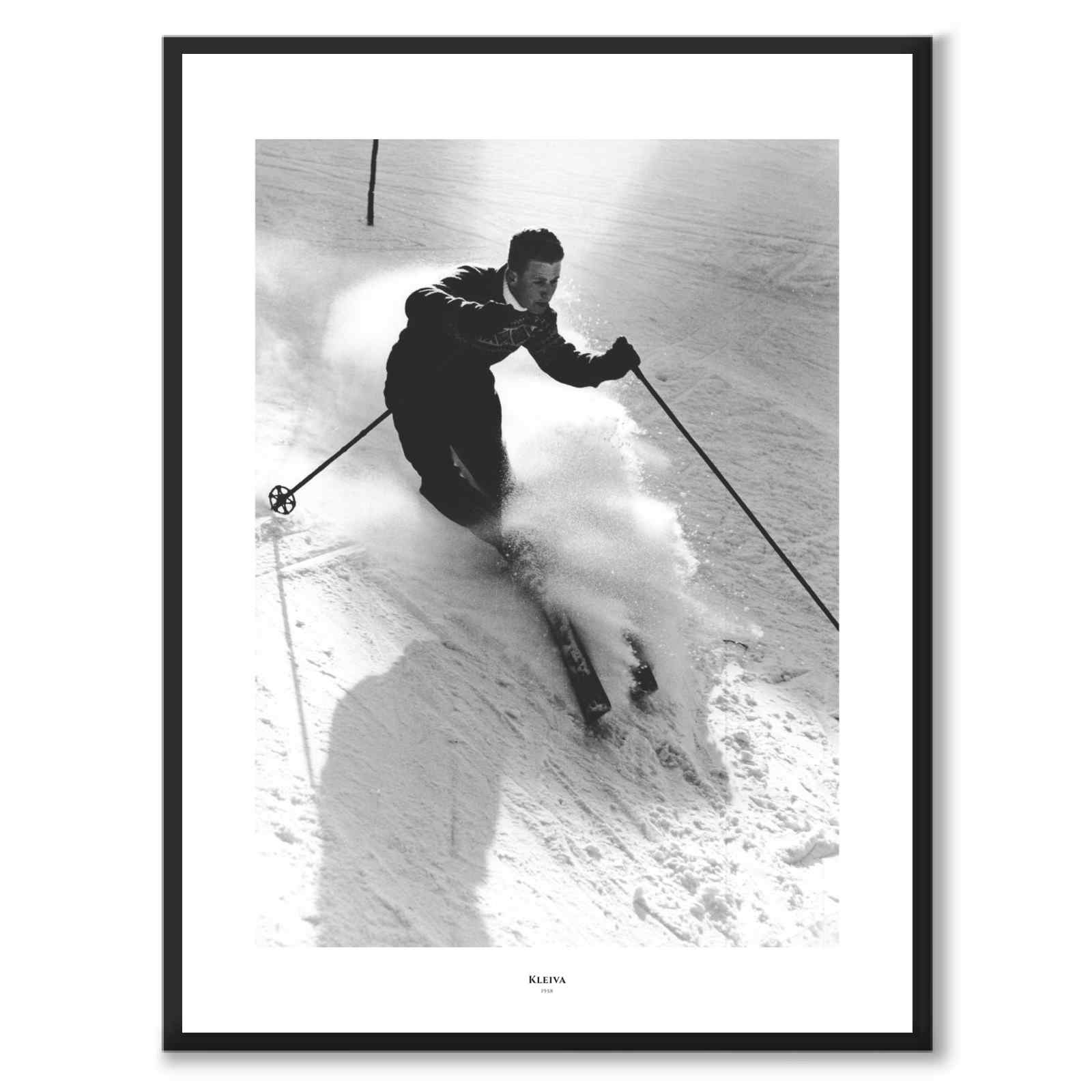 Plakat med fotografi av en mann som kjører slalåm i Kleiva , Norge. På bildet ser vi sola titte frem i bakgrunnen og snøen som virvler rundt mannen.