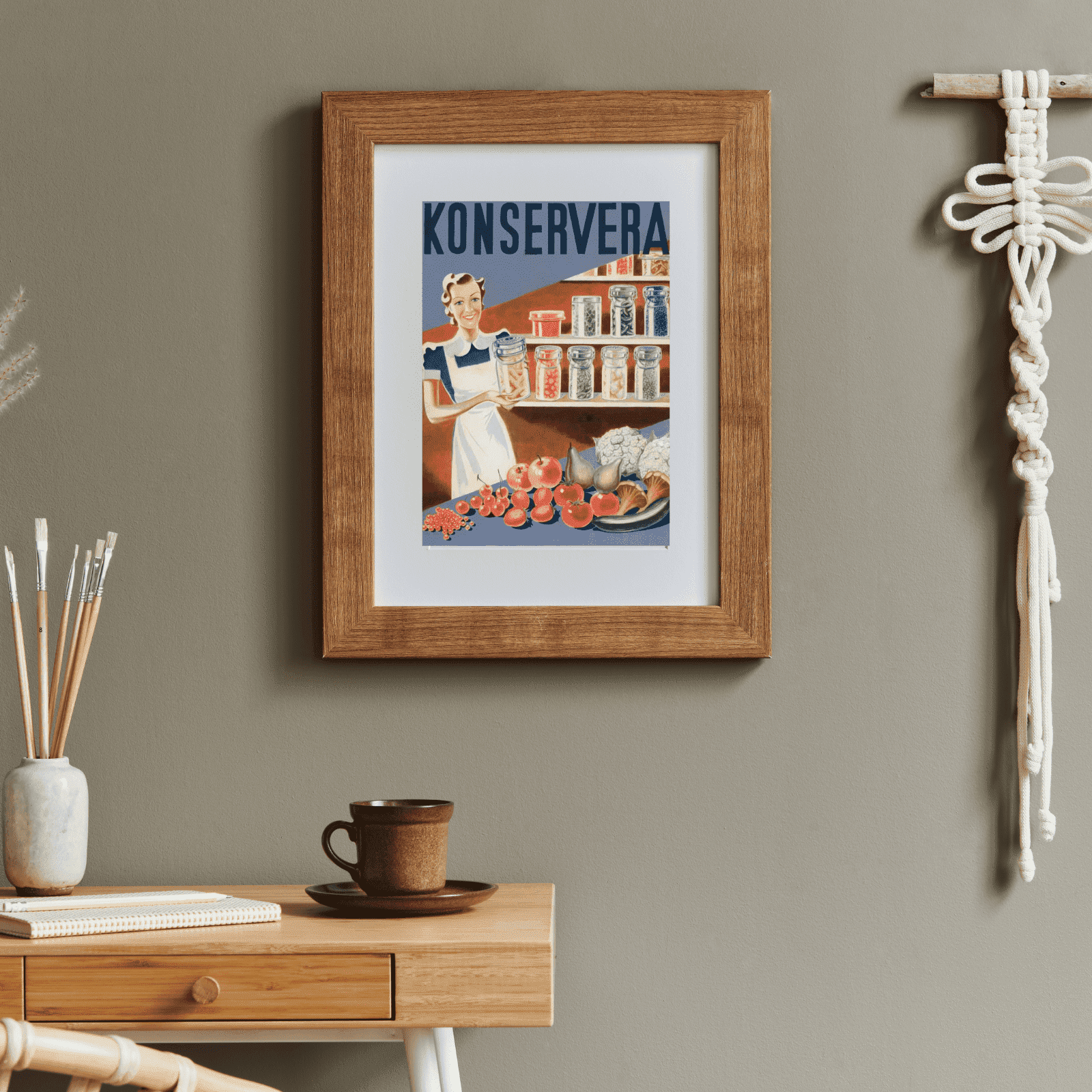 En vakker fargeillustrasjon viser Konsum Kooperativas, i dag Coops, anvisninger for konservering av frukt og bær. En typisk husmor fra 1940-tallet står stolt med en glasskrukke fylt med konservert innhold. På bordet foran henne står en rekke grønnsaker, bær, frukt og sopp, mens hyllene bak henne viser konserveringsklare produkter.