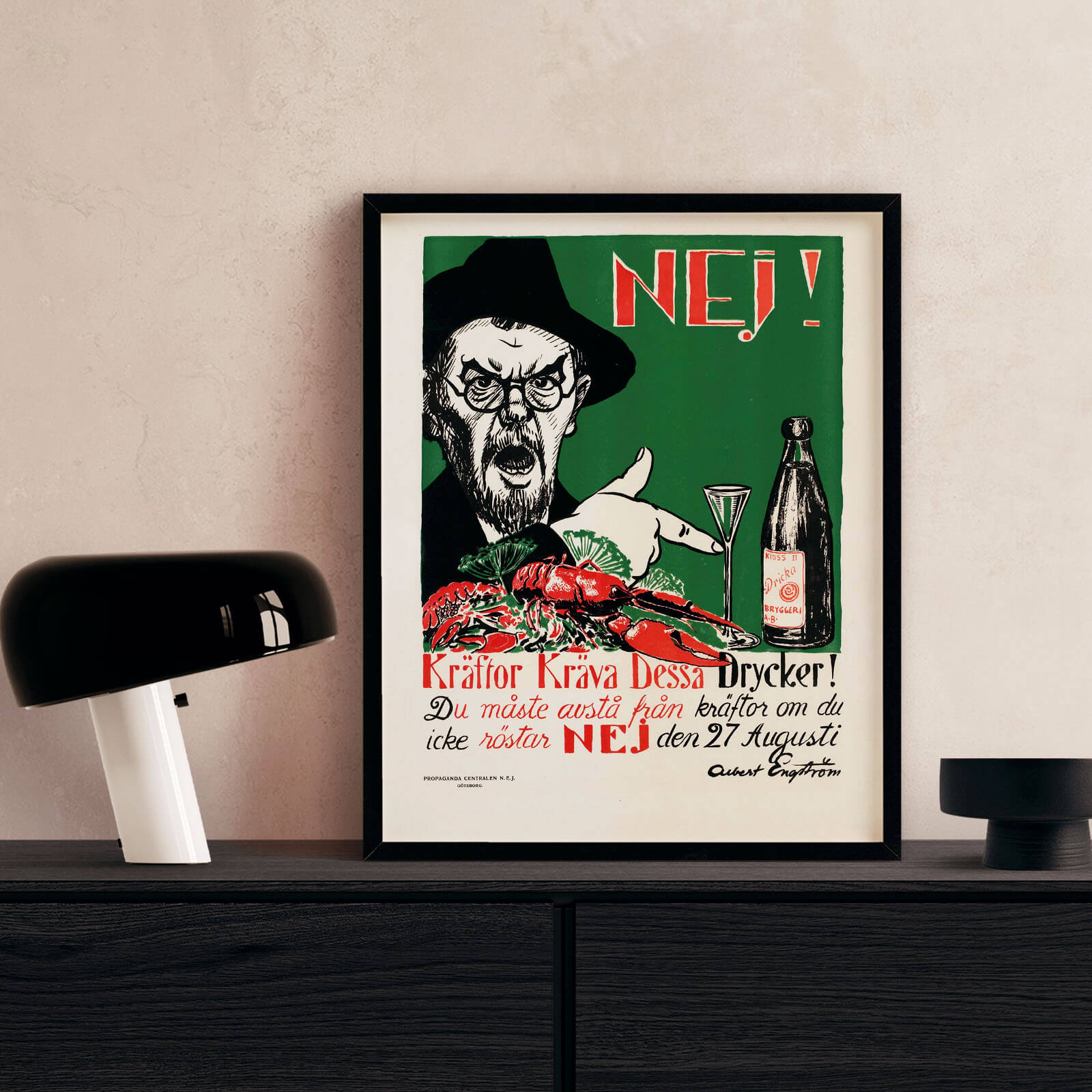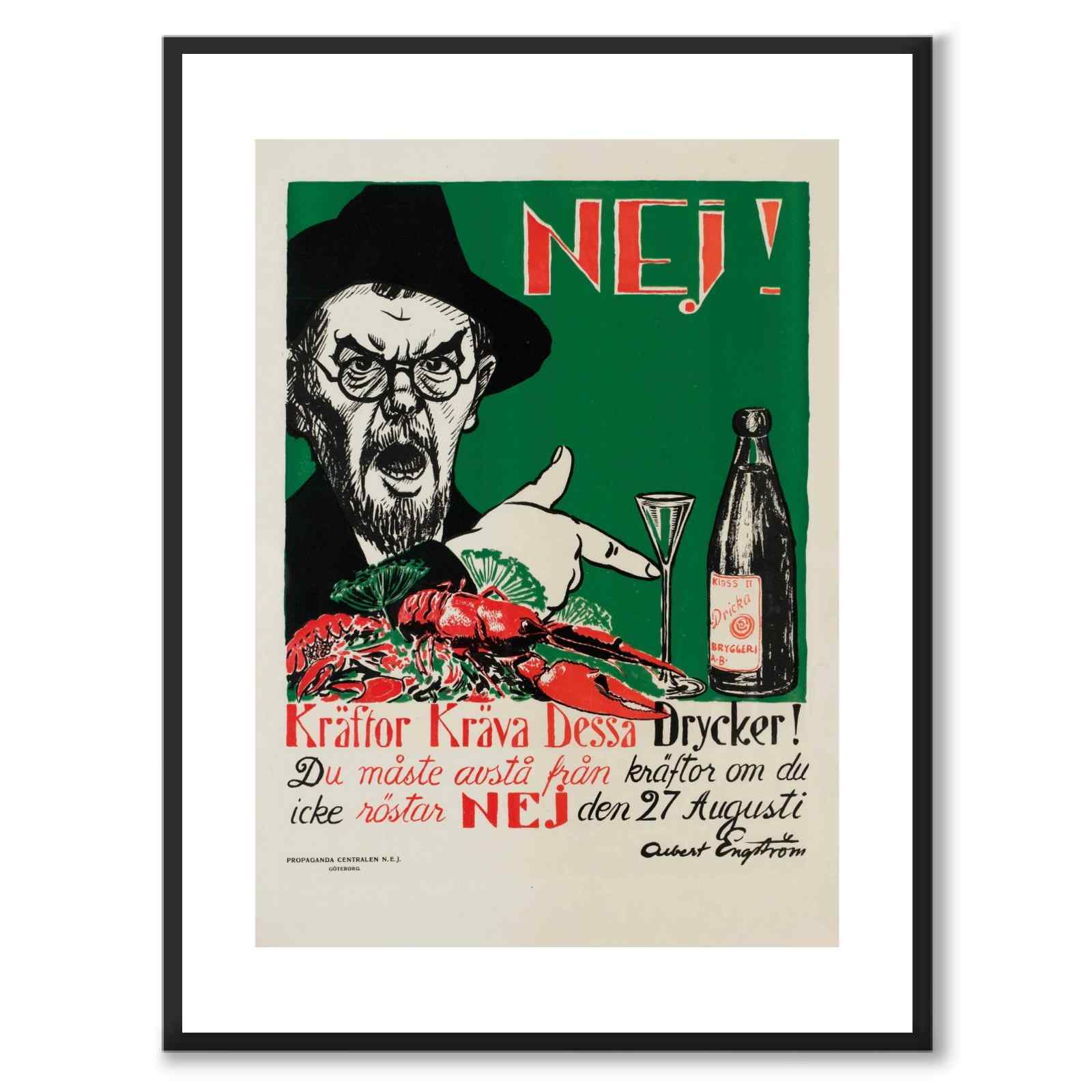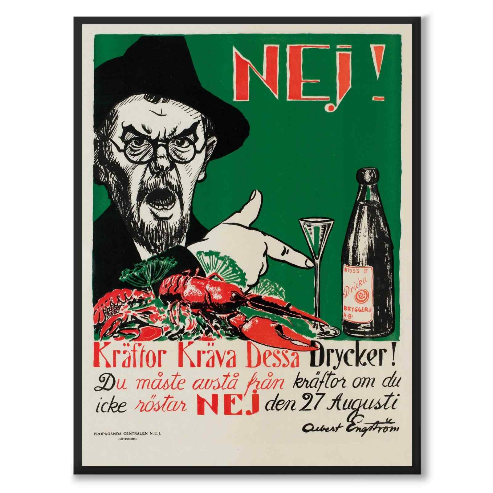 Plakater av Kräftor Kräva Dessa Drycker! , nei-sidens mest kjente valgplakat i forbindelse med folkeavstemningen om å forby alkohol i Sverige. Illustrasjonen ble laget av Albert Engström i 1922.