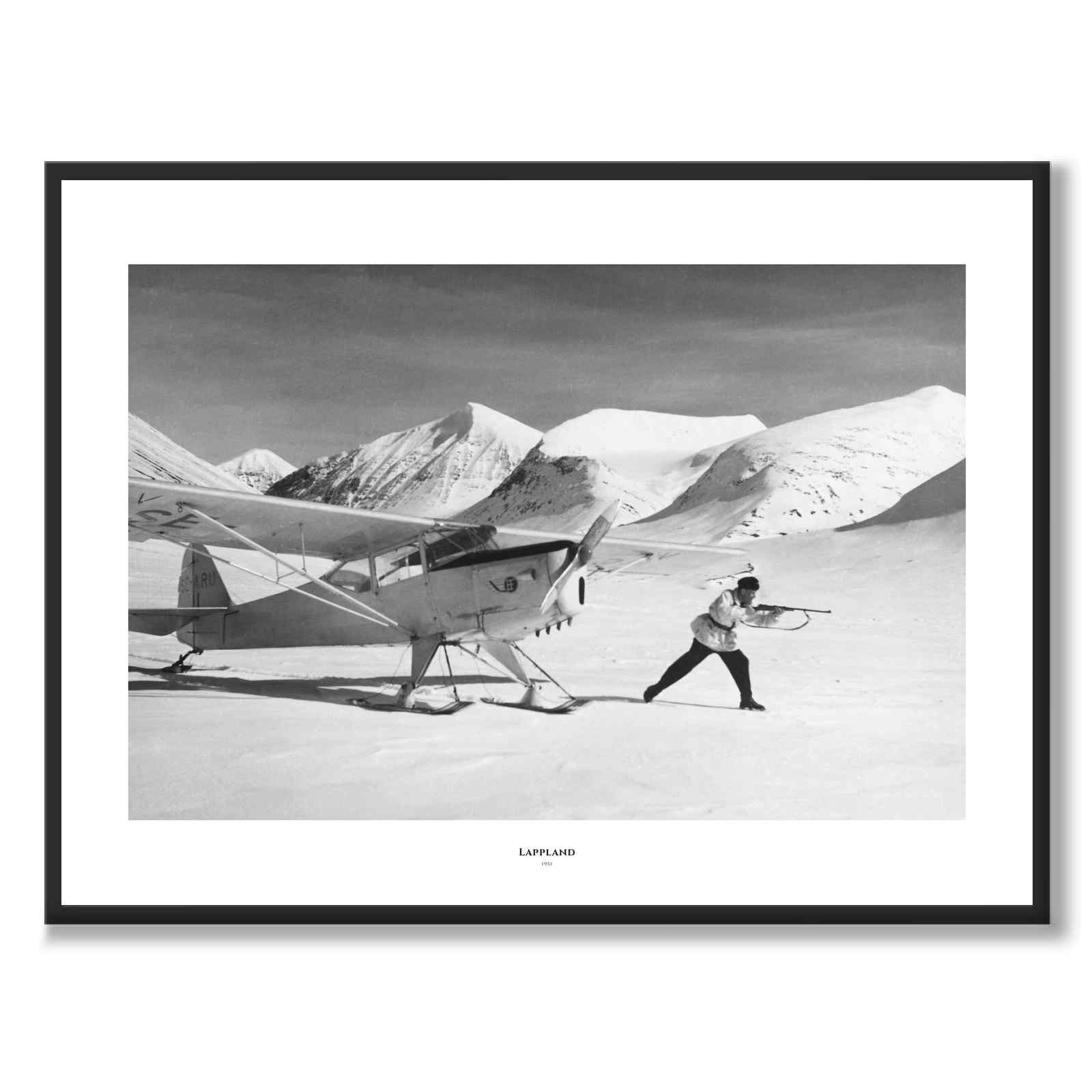 Plakat med et unikt fotografi av Arne Gundersen (1919-2018) som var en berømt svensk pilot og flyinstruktør. Gundersen er trolig mest kjent for sin deltakelse i jakten på den såkalte Fjälldesperadon i Lapplandsfjellene i februar 1951.