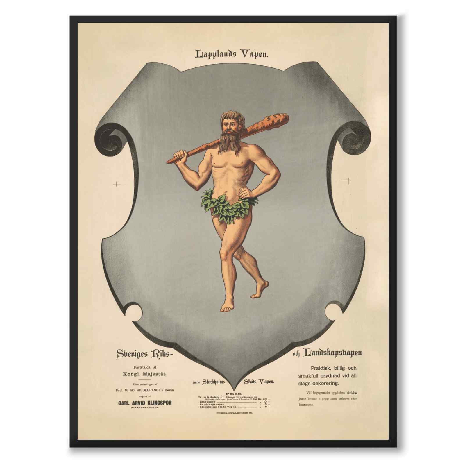 Teksten over våpenskjoldet lyder: "Coat of Lapland". Nederst til venstre står det: "Sveriges riks- og landsvåpen. Etablert av den kongelige majestet. Etter tegninger av prof. M. AD. Hildebrandt i Berlin. Utgitt av Carl Arvid Klingspor."