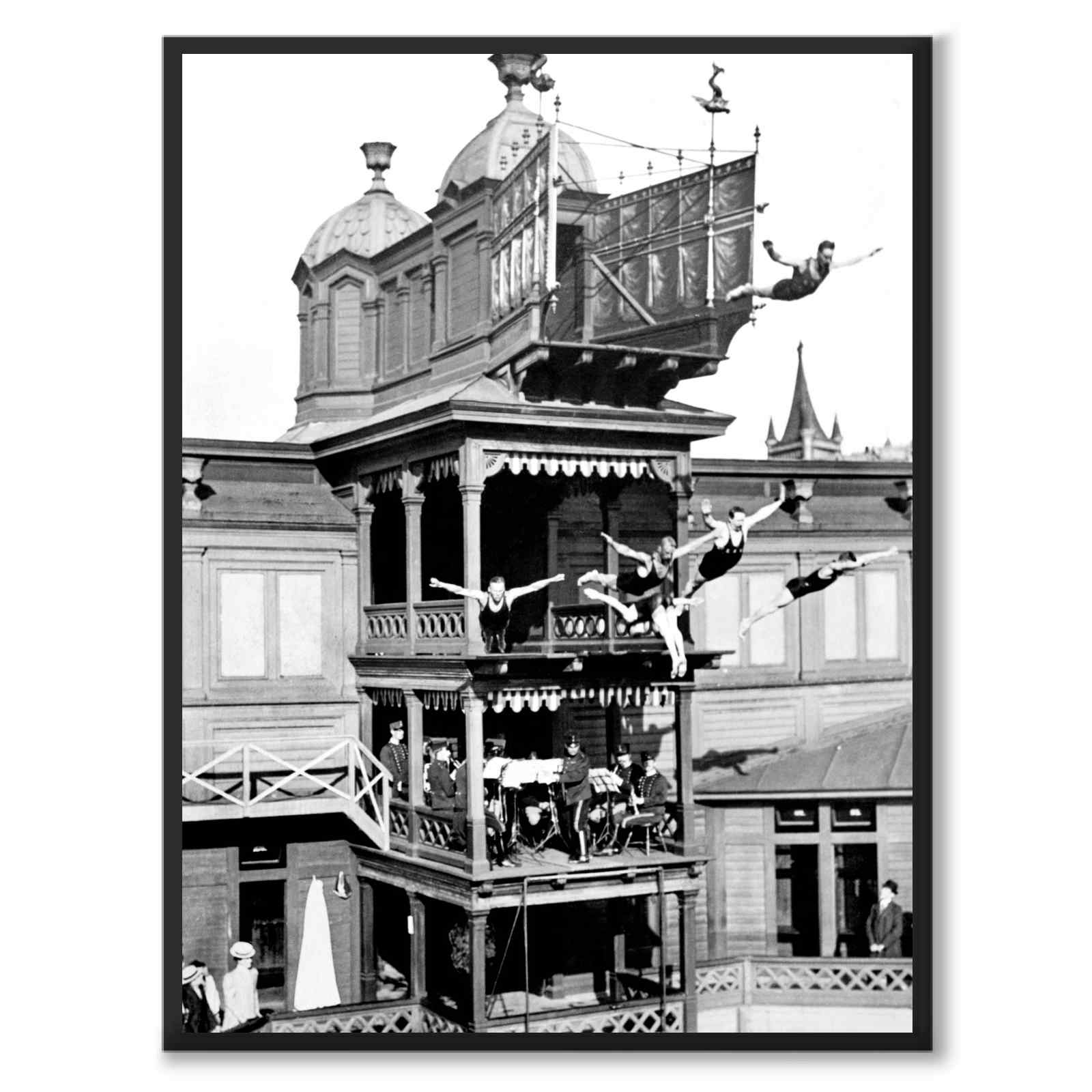 Strömbadet var det første kaldbadehuset i Stockholm og lå på vannet foran Rådhuset. Det var en vakker bygning, bygget i renessansestil og skal fungere for stockholmernes helse- og svømmeferdigheter. Skolebarn, politifolk og brannmenn hadde gratis inngang, for andre besøkende var inngangen 35 öre. Svømmebassenget hadde en avdeling for kvinner, en for unge gutter og det største, vestlige bassenget for menn som kunne svømme. Det er denne avdelingen du ser på bildet. Strömbadet var arena for flere store svømmekonkurranser. På bildet ser du en dykkervisning en gang mellom årene 1900-1910. Et imponerende fotografi av Axel Malmström som viser menn samtidig som gjør forskjellige avanserte svømmehopp. En mann hopper med ryggen til oss: et avansert hopp som ser ut til å være i spar. På bildet ser du også et orkester som spiller på det andre flyet.