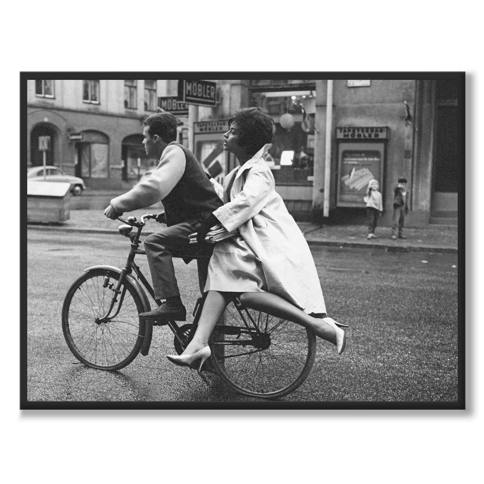Plakat med bilde av Lill-Babs Svensson, svensk sangerinne, her iført hvit lys frakk og høyhælte sko sittende på sykkelstativet. En ung mann sykler bort med henne langs en gate i Stockholm i 1961 og i bakgrunnen sees to små barn vinke til kameraet.