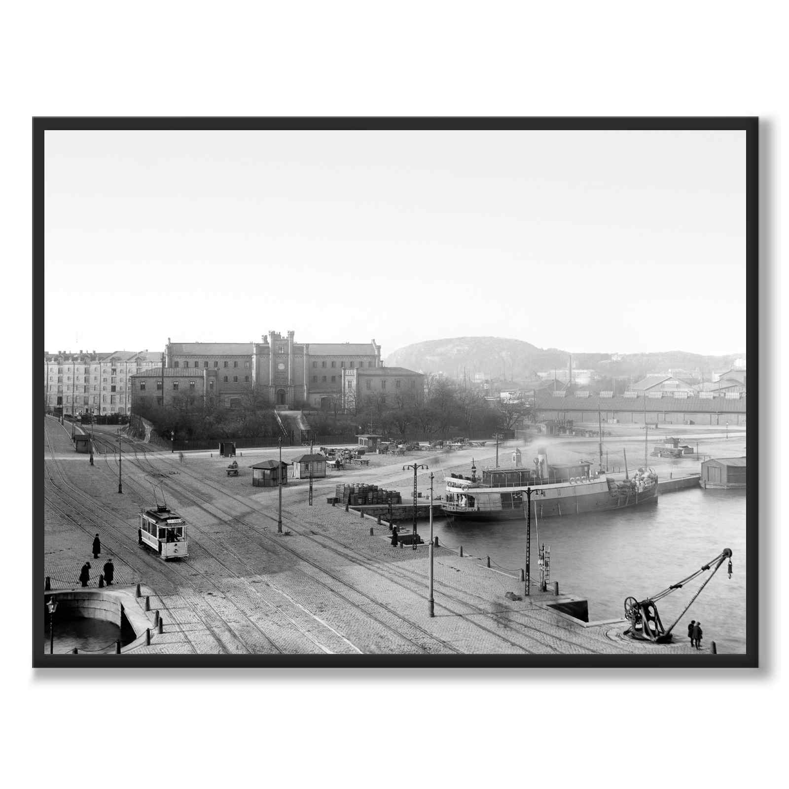 En ro ligger over Lilla Bommen i Gøteborg. Bildet er tatt ved århundreskiftet og har en fin detaljrikdom. Vi ser blant annet en gammel trikk som passerer mellom dampbåter og folk i byen. Gøteborgs trikkenett ble elektrifisert mellom 1900-1902 så bildet må være fra kort tid etter det. Bygningen midt i bildet ble revet på 60-tallet og i forbindelse med det ble også bakken sprengt. I dag går stien rett over.